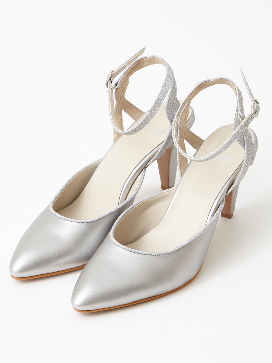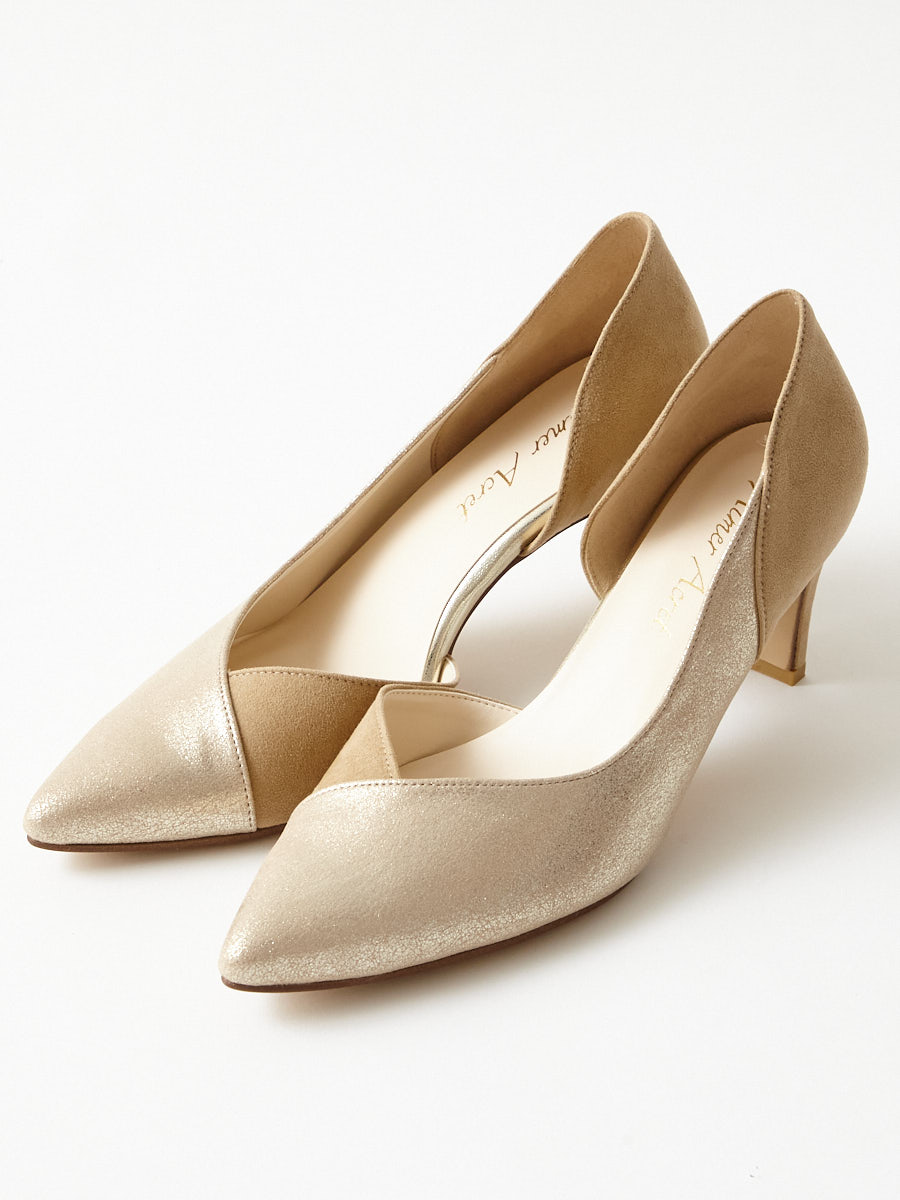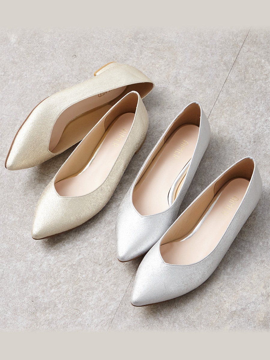 スクエアヒールなら安定感のある履き心地。箔加工素材が程よく煌いてさりげなく輝きをプラスしてくれる。