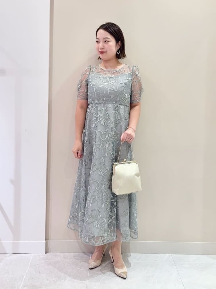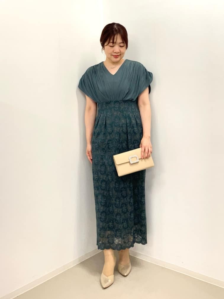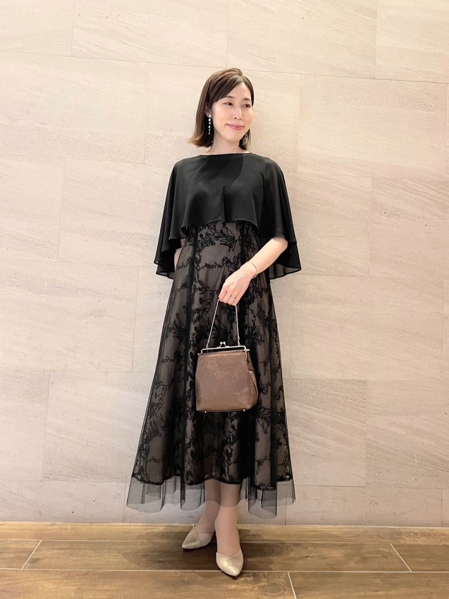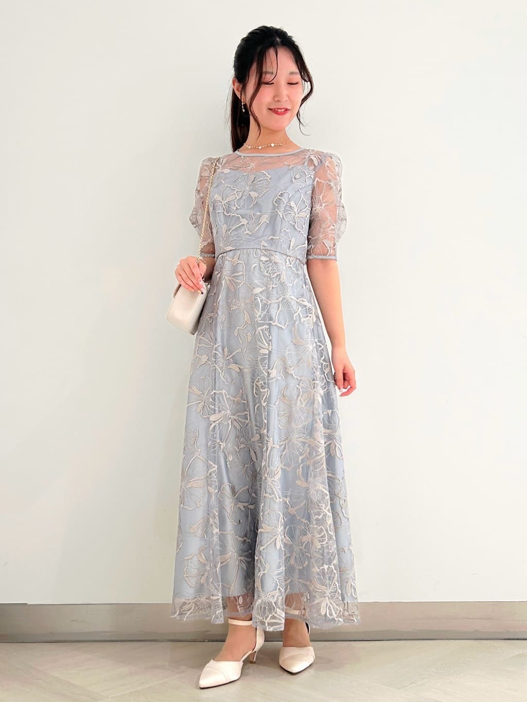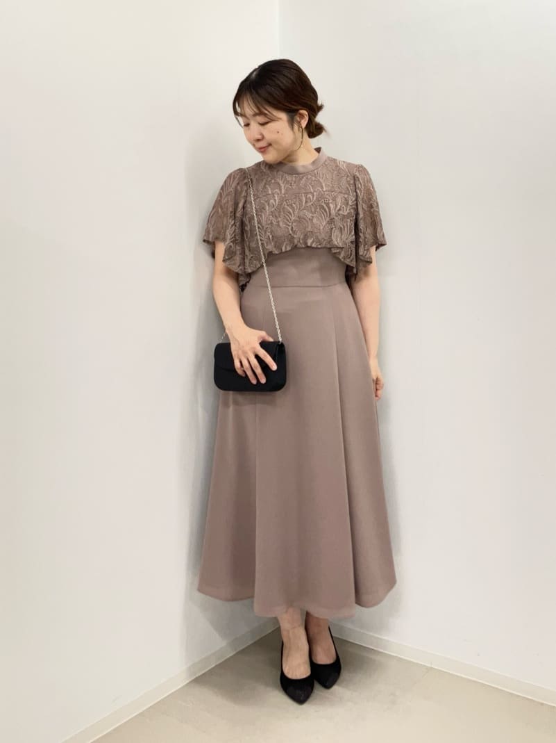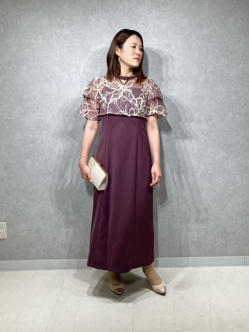 長め丈のフレアラインドレスなら体型をカバーしながらエレガントで大人フェミニンな印象に。パーティーやイベントでのドレスアップならレースや刺繍など華やか見えするドレスもおすすめ。