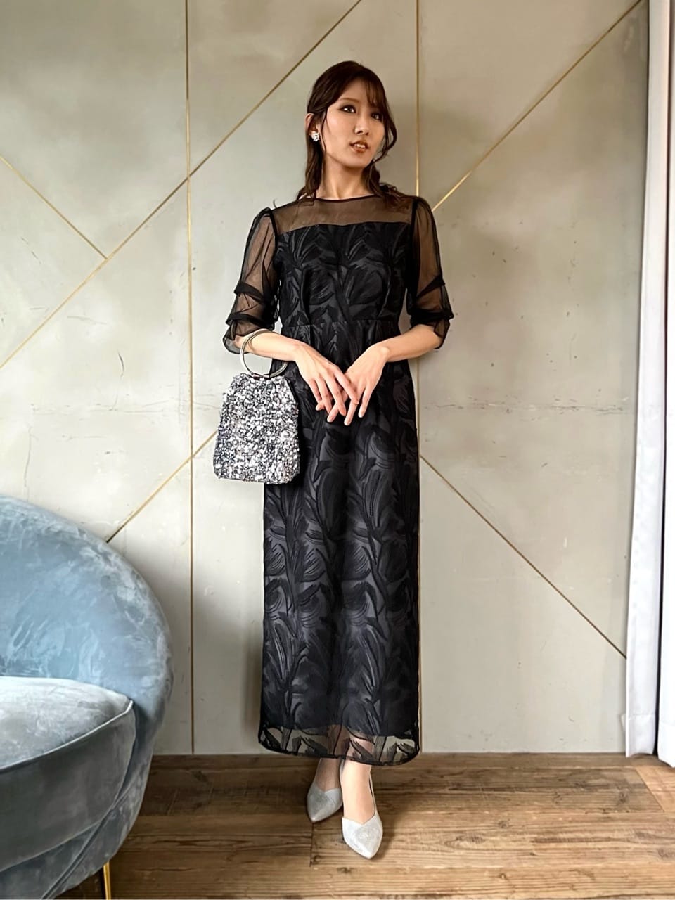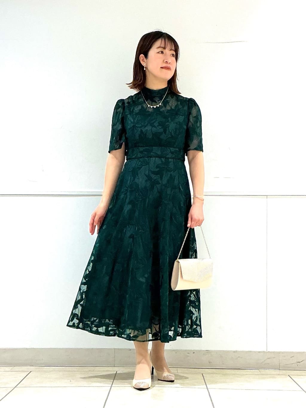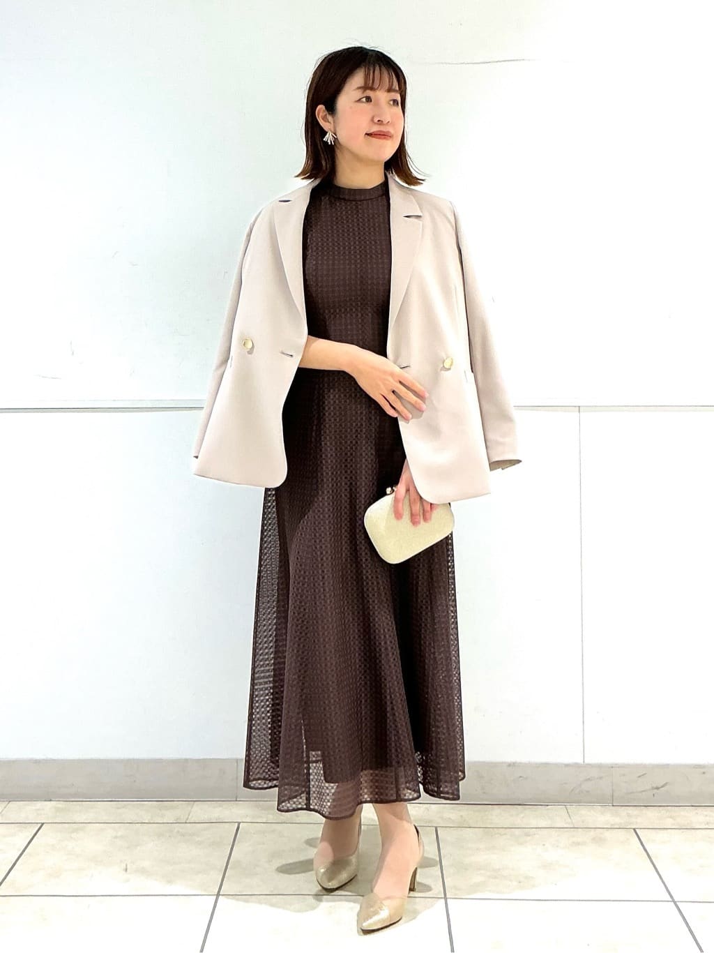 ジャカードやレースなど華やか見えする素材を使ったドレスなら、シンプルで落ち着きのあるデザインも程よくドレッシーな印象に。袖付きドレスやジャケットコーデなら露出をおさえて体型カバーも叶います。