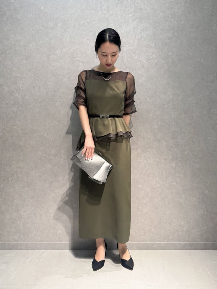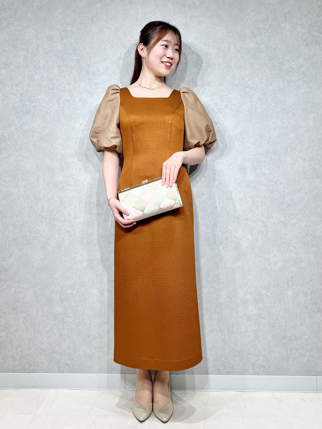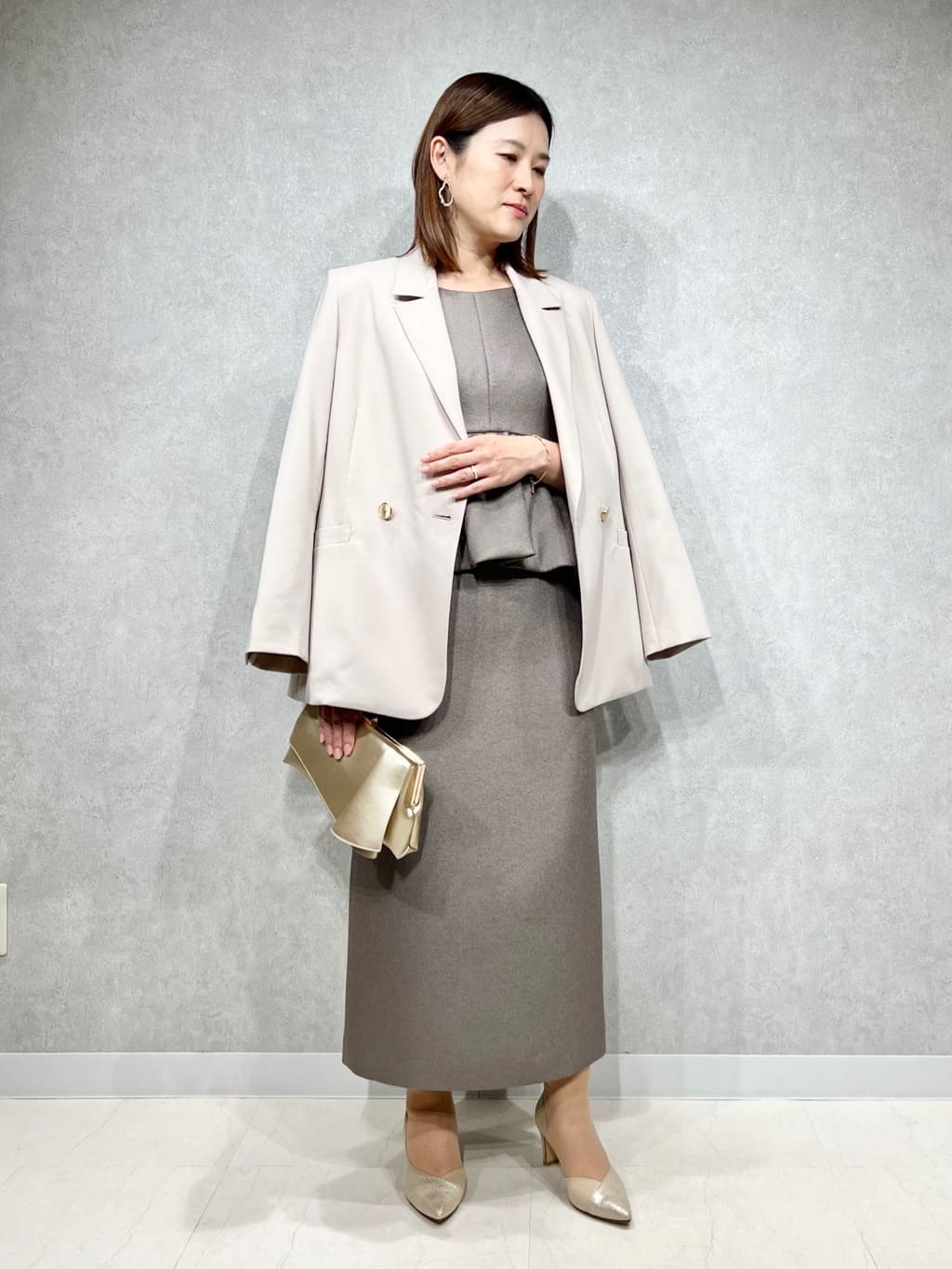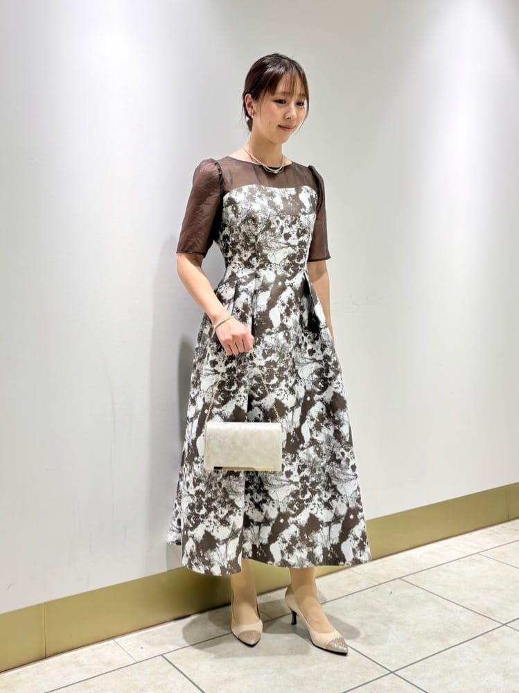 ジャカードやレースなど華やか見えする素材を使ったドレスなら、シンプルで落ち着きのあるデザインも程よくドレッシーな印象に。袖付きドレスやジャケットコーデなら露出をおさえて体型カバーも叶います。
