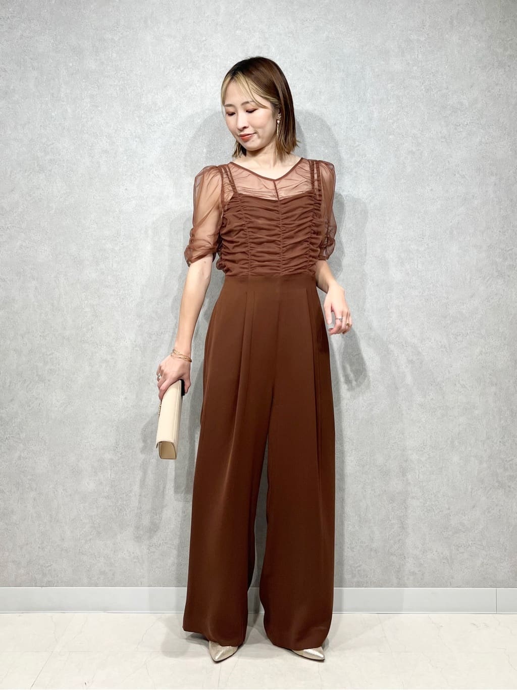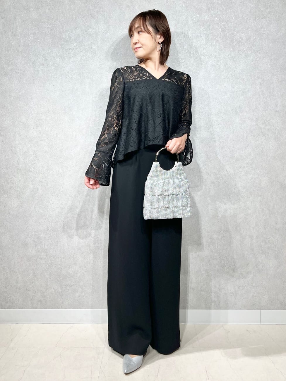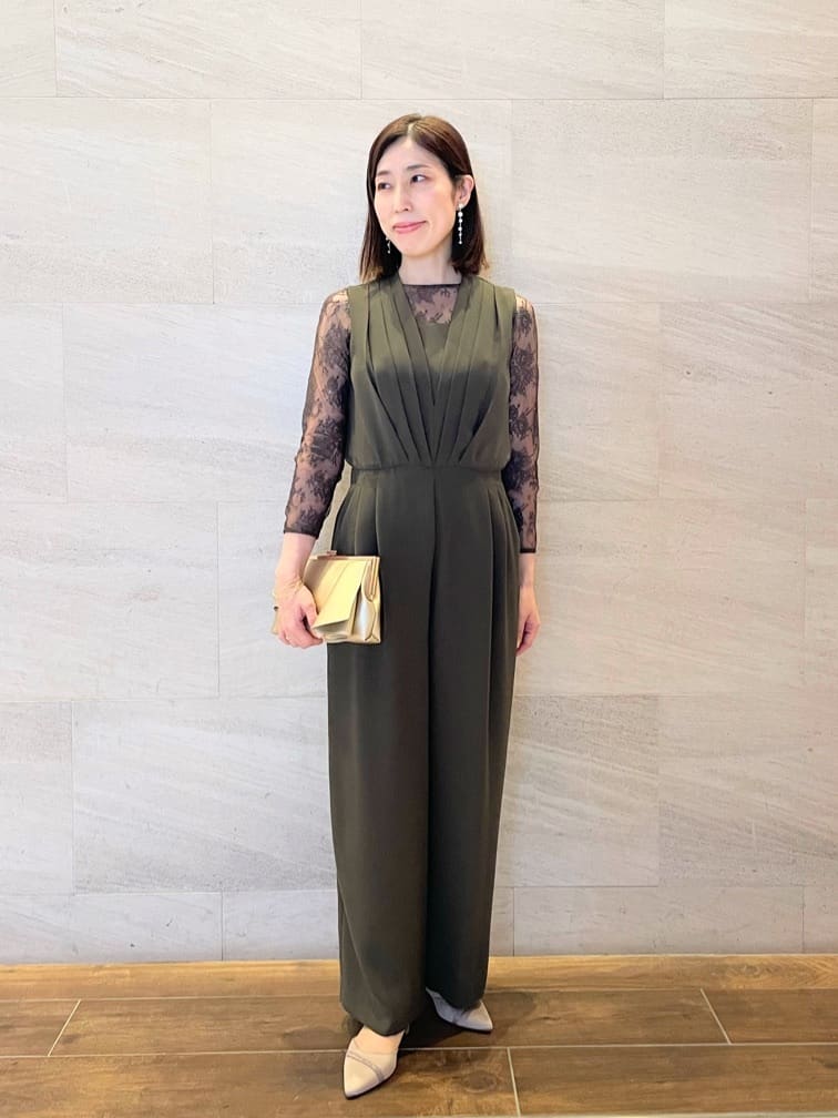 Iラインやパンツドレスなど洗練されたシルエットのドレスならスタイリッシュな印象に。どこかトレンド感のあるディティールやレースを使っているデザインなら、クールになりすぎず程よく華やかさをプラス。