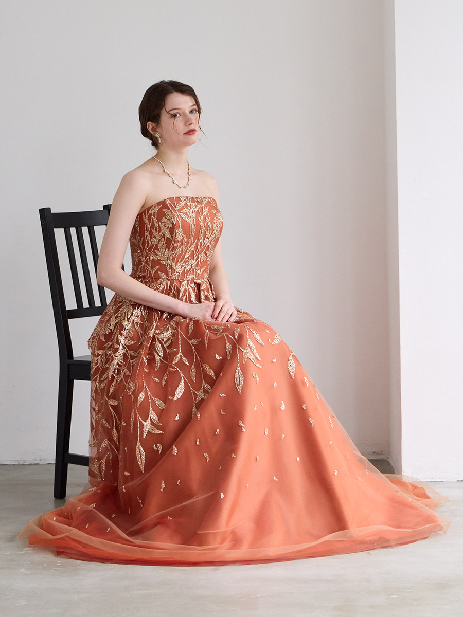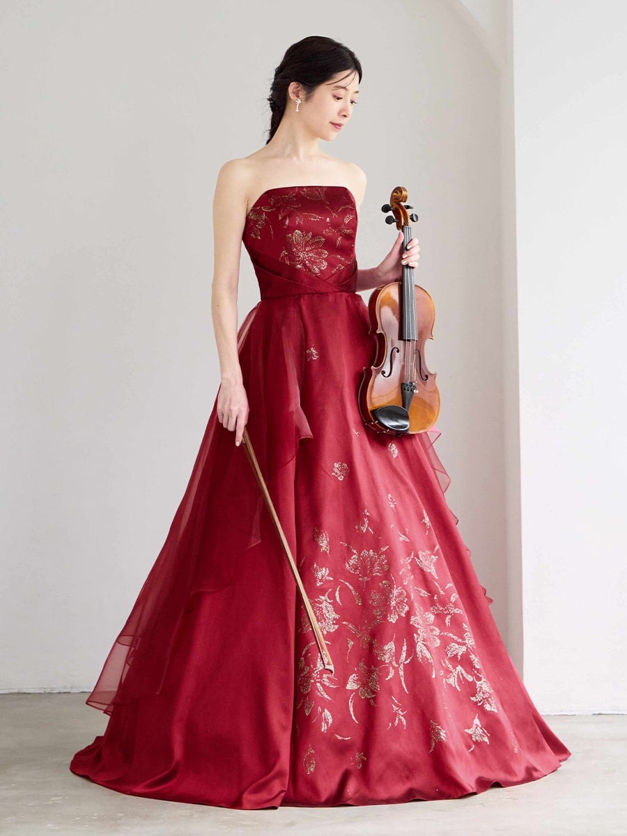 美しいフォルムと深みのあるブラウンのカラー。優雅で気品あふれるバイオリンは憧れの楽器。誰もが知っている楽器だからこそその存在感に負けない最高のドレスを・・・