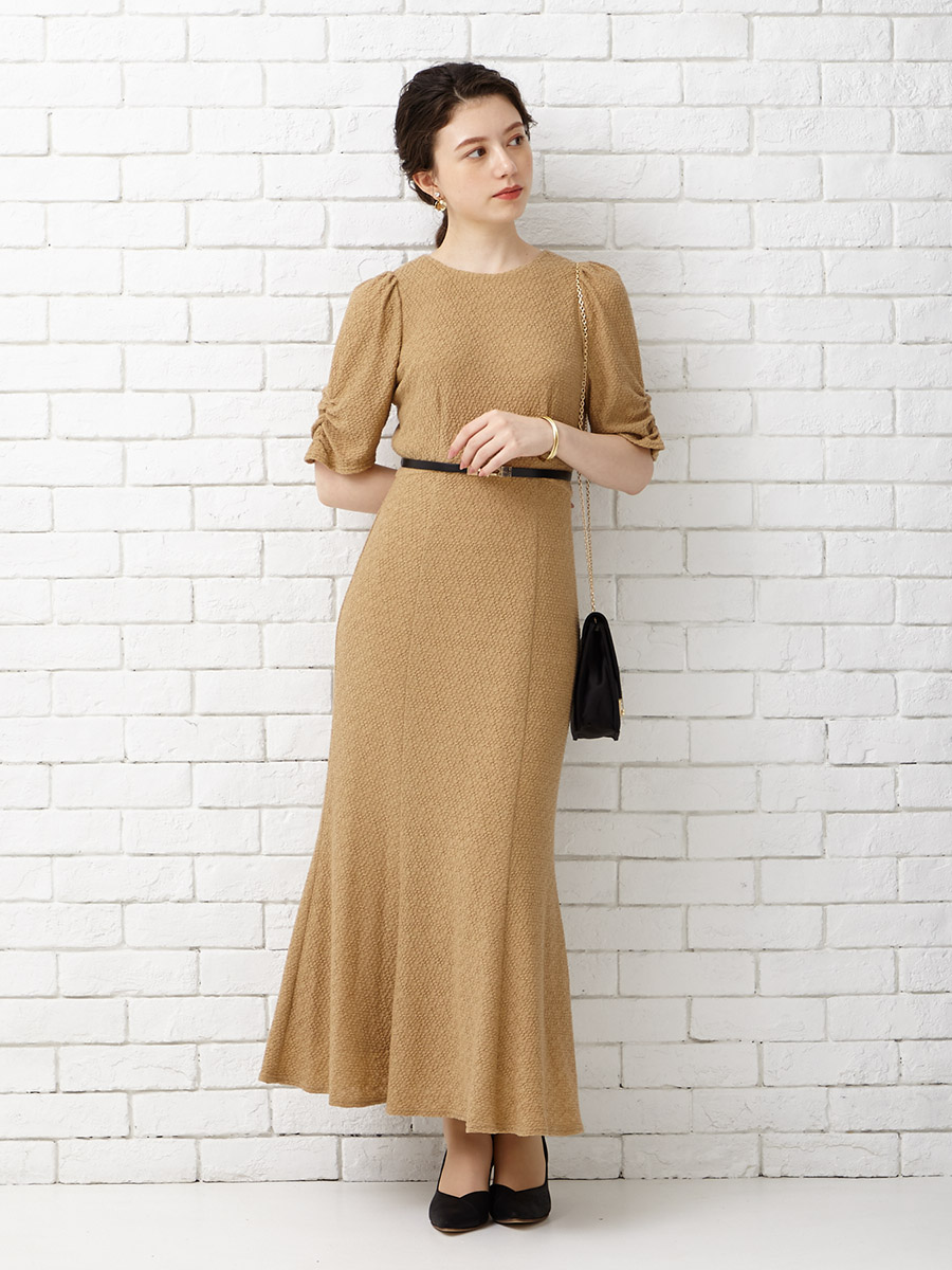 ジャカード×オーガンジーボリュームスリーブタイトドレス
