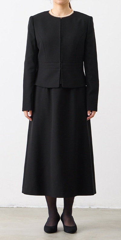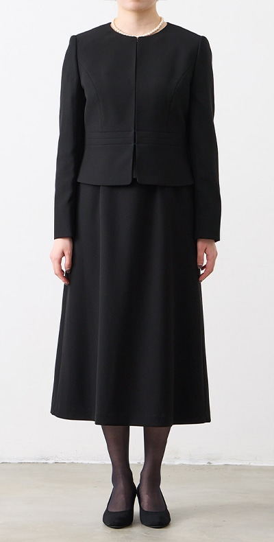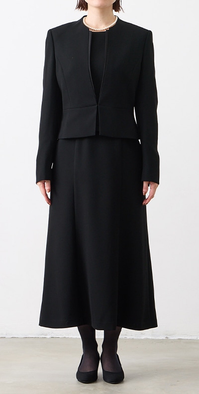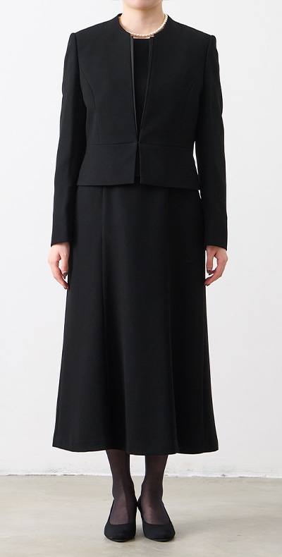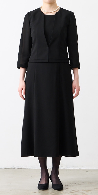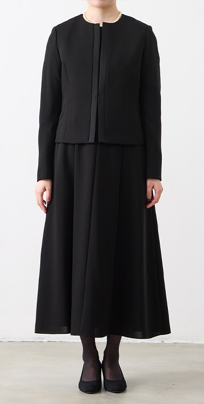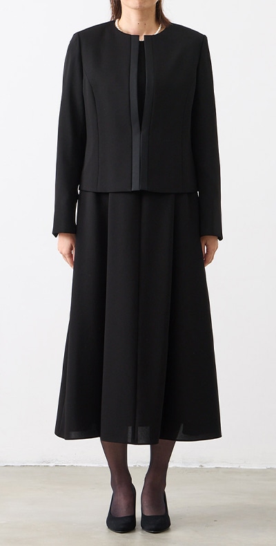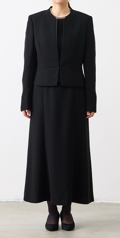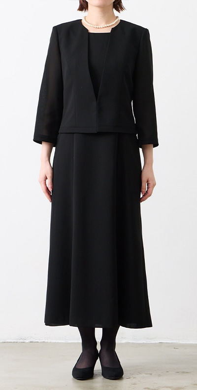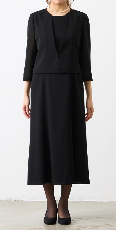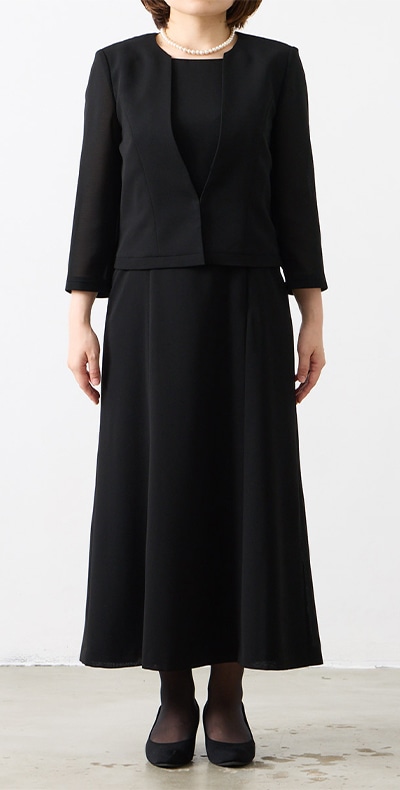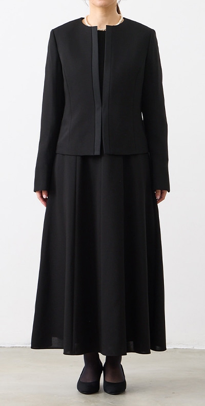 ロング丈ブラックフォーマルアンサンブル(サテン切り替えジャケット・ロング丈スカート前開きワンピース)