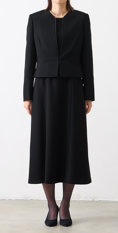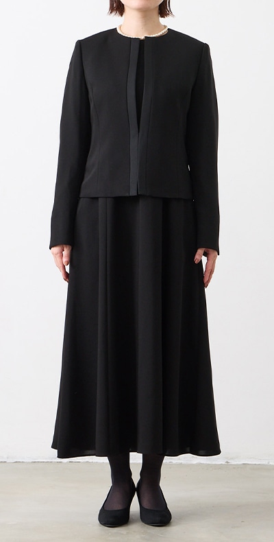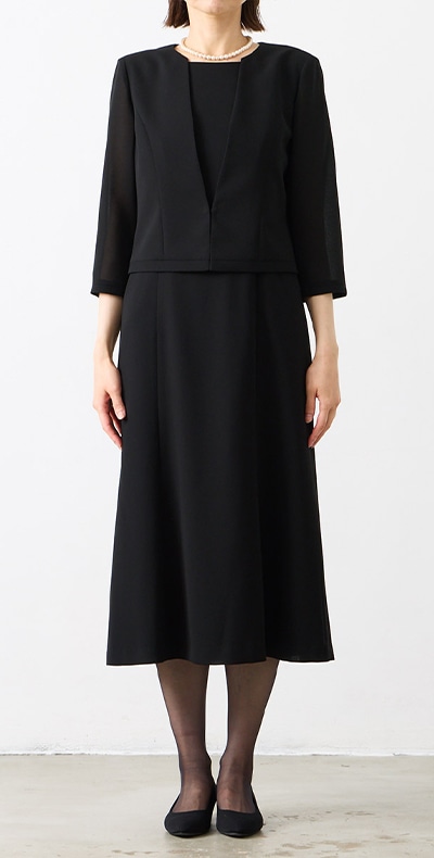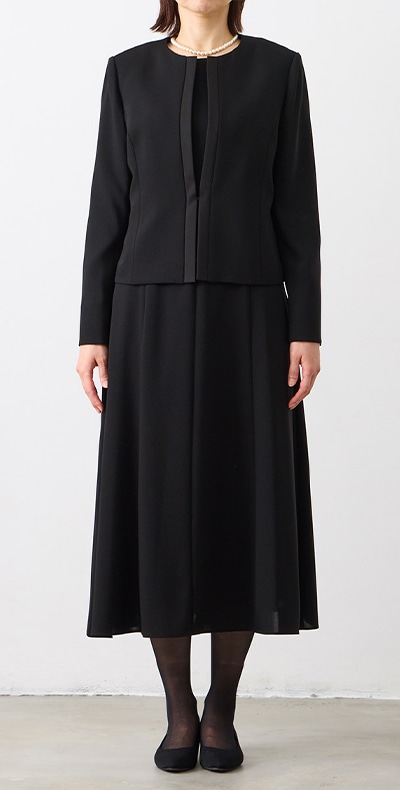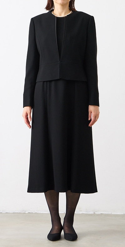 【WEB限定】【洗える・マシンウォッシャブル】セミフレアスリーブノーカラージャケット・前開きセミロングワンピースアンサンブル
