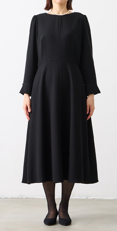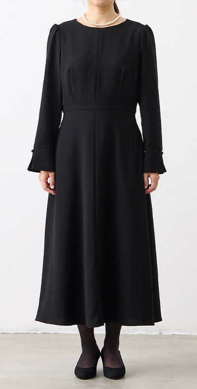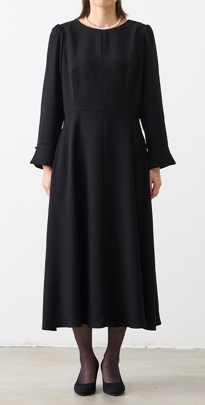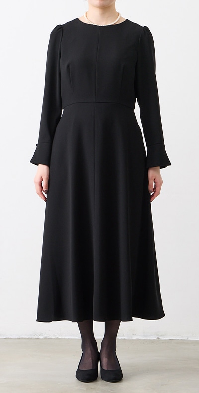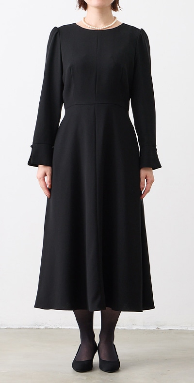 【ウォッシャブル】カフススリーブAラインフレアブラックフォーマルワンピース