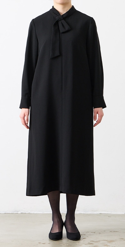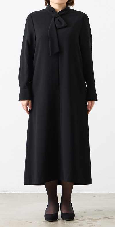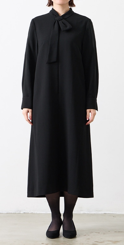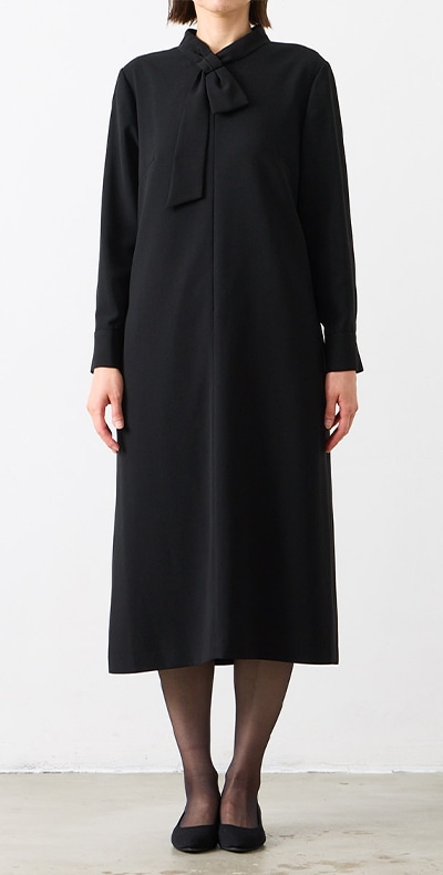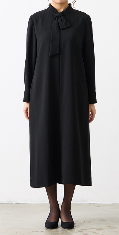 リボンタイデザインが上品で女性らしい印象のブラックフォーマルワンピース。すっきりとしたシルエットで程よく落ち感のある軽やかな素材が低身長さんでも着やすいポイント。