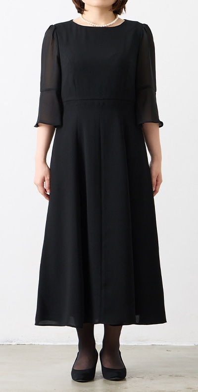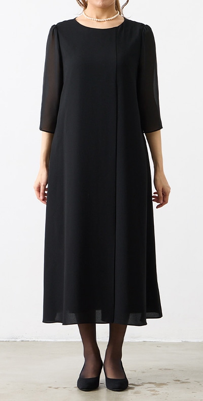 ゆったりとしたAラインシルエットが暑い季節も涼しく着られるブラックフォーマルワンピース。