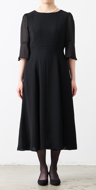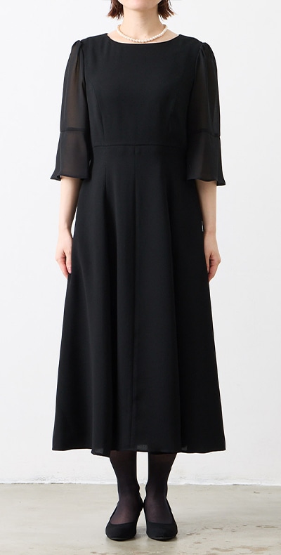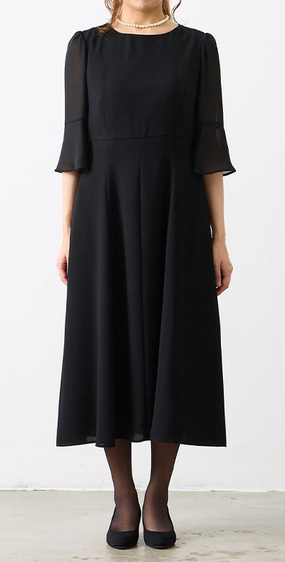 【マシンウォッシャブル】フレアスリーブフィット&フレアブラックワンピース