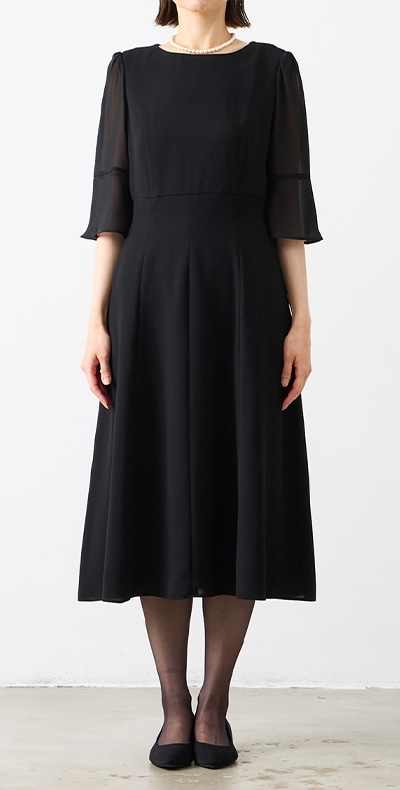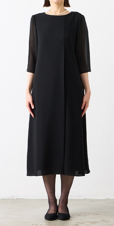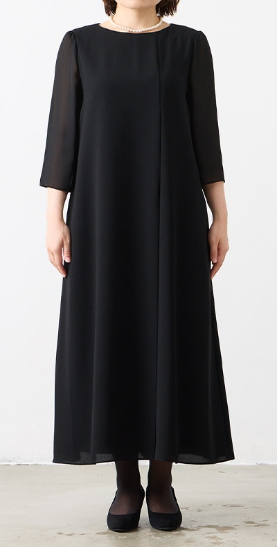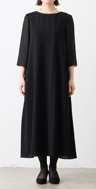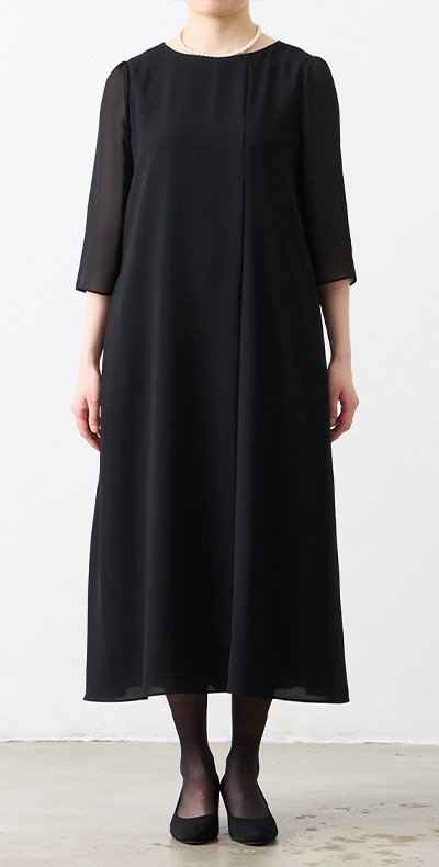たっぷりとした分量感が動くたびに優雅な印象のテントラインワンピース。Sサイズ展開もあり、丈感はMサイズより-5cmなので低身長さんも着こなしやすいデザインです。喪服として以外でも幅広いシーンで着用できる汎用性の高いおしゃれな1着です。