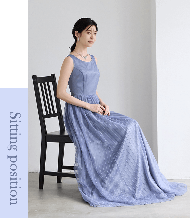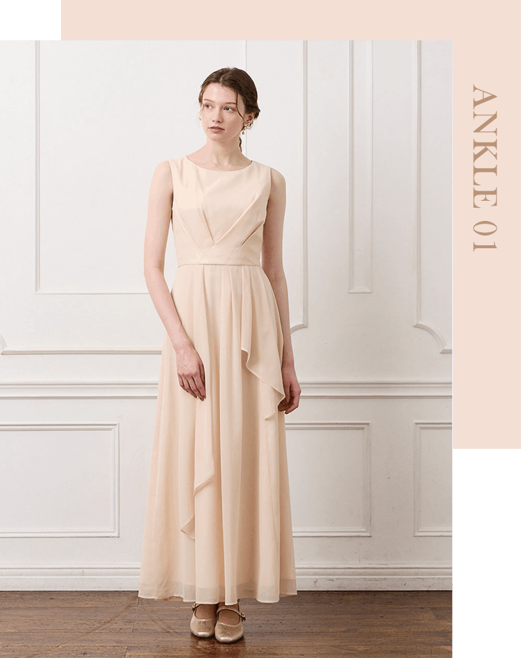 ステージドレスとしてだけでなく、結婚式のお呼ばれやパーティーシーンにも活躍するアンクル丈ドレス。上品な華やかさがあり、軽やかで動きやすいのが特徴です。サロンや小ホールでの着用や、動きやすさや着やすさを重視する方におすすめです。