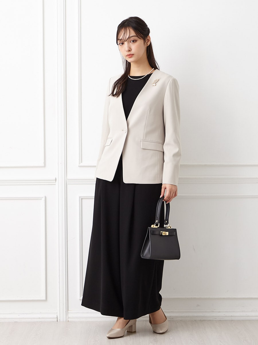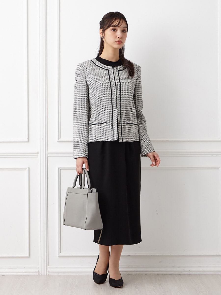 ベージュ、グレー、ネイビーなどジャケットの色を変えたり、ツイードなど表情感のある素材を取り入れるだけでお顔周りが明るい印象に