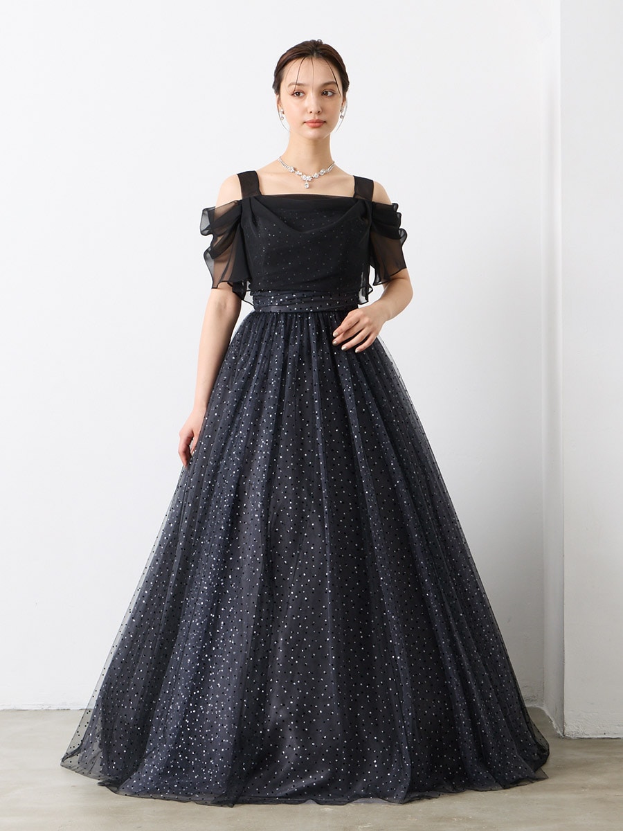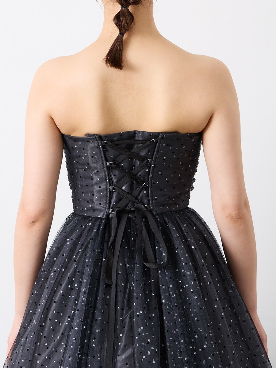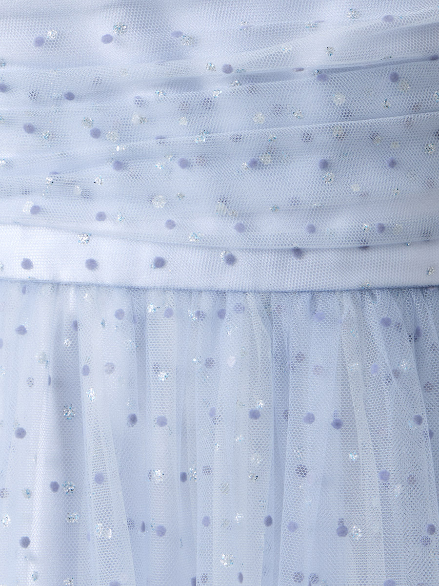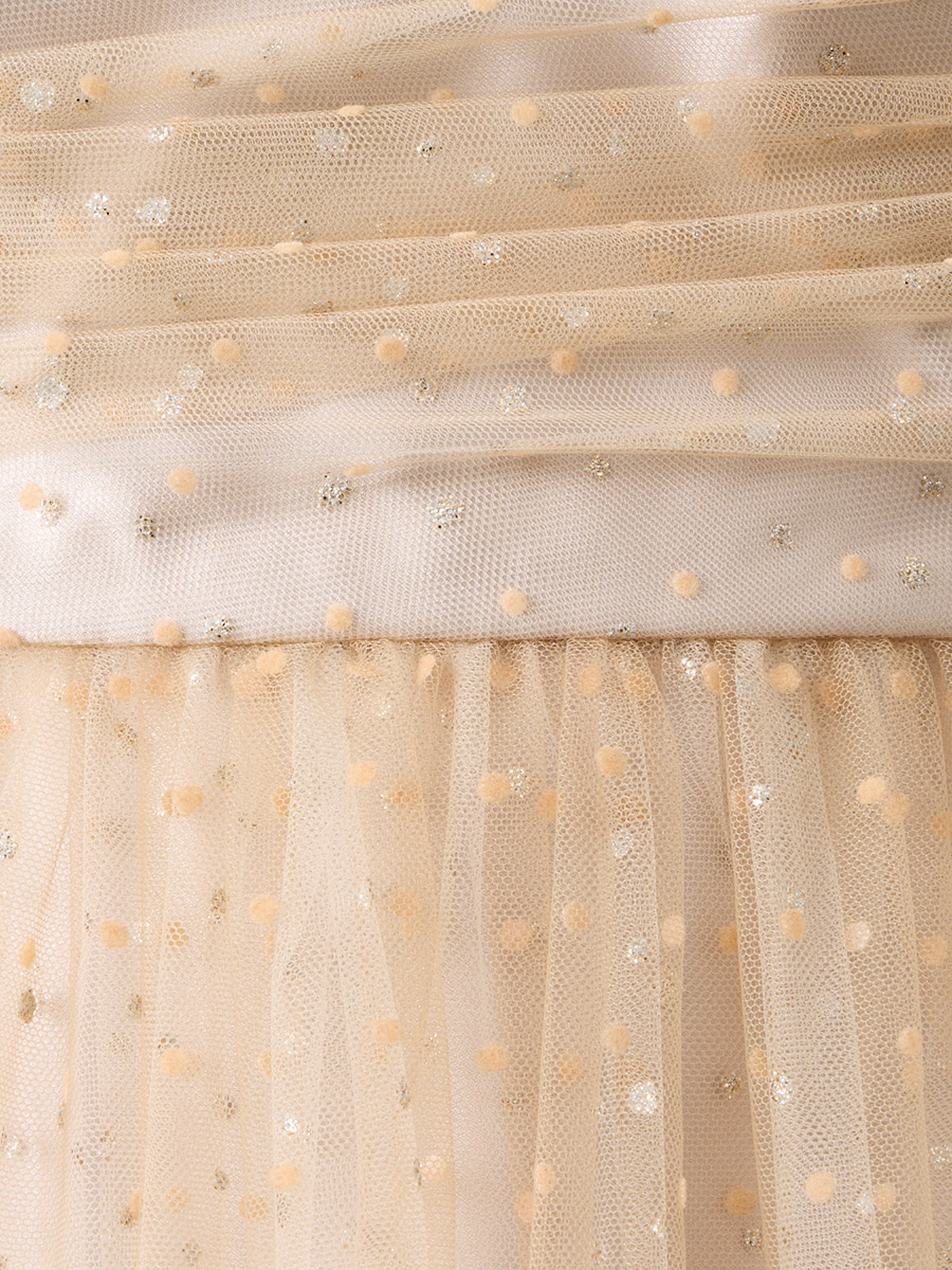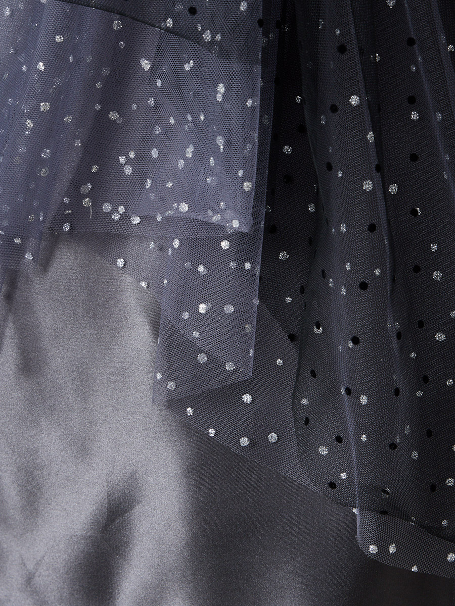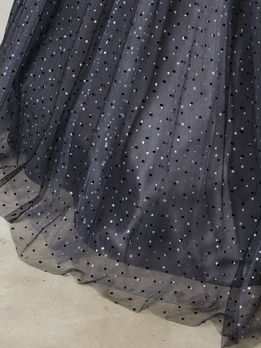 ・ドレス全体にグリッター加工、フロッキー加工をしたチュール生地を使用。