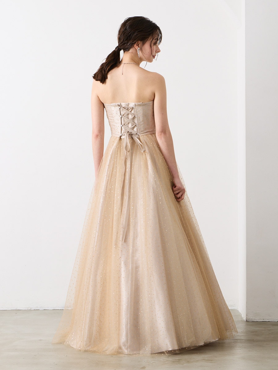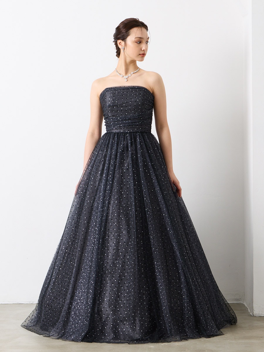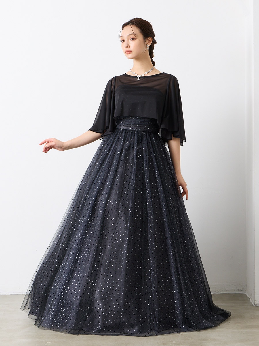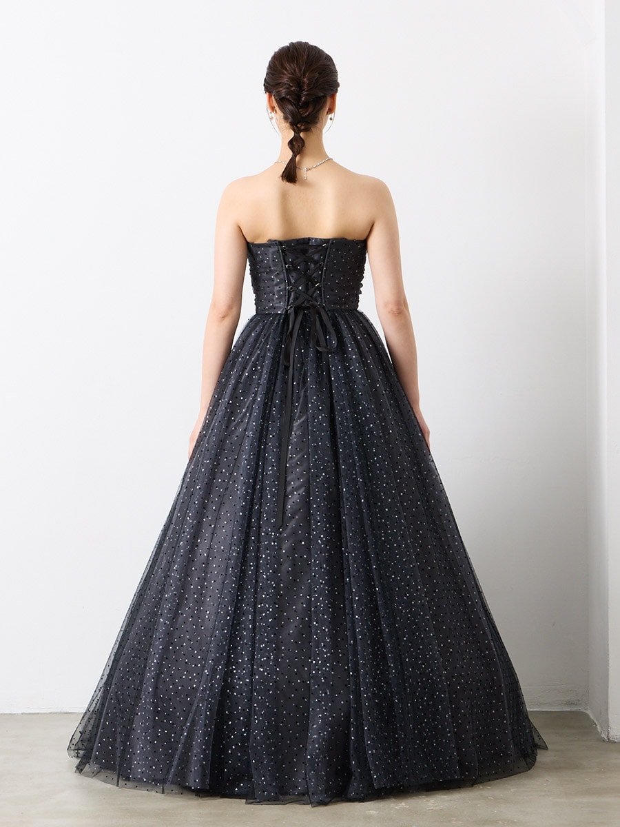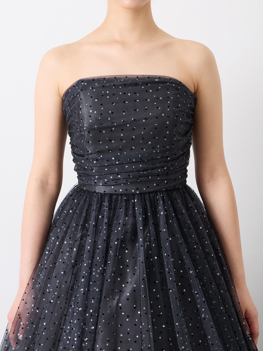 ・ドレス全体にグリッター加工、フロッキー加工をしたチュール生地を使用。
