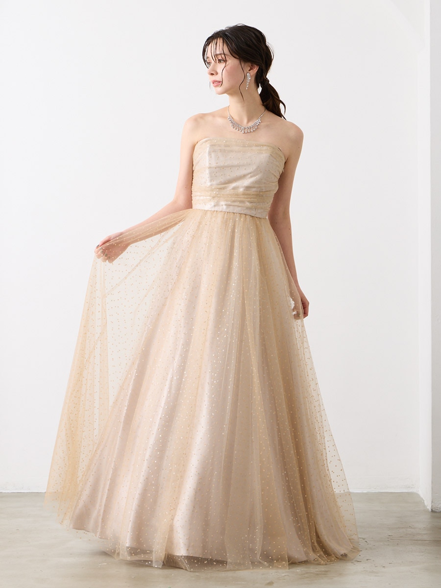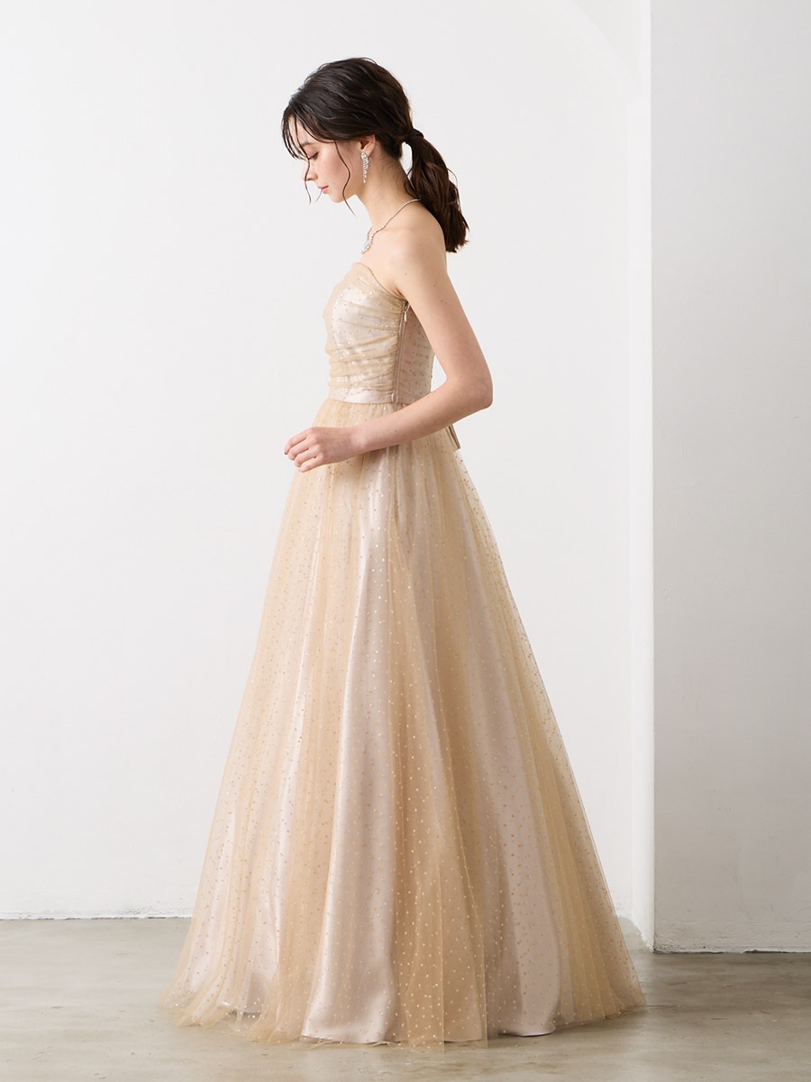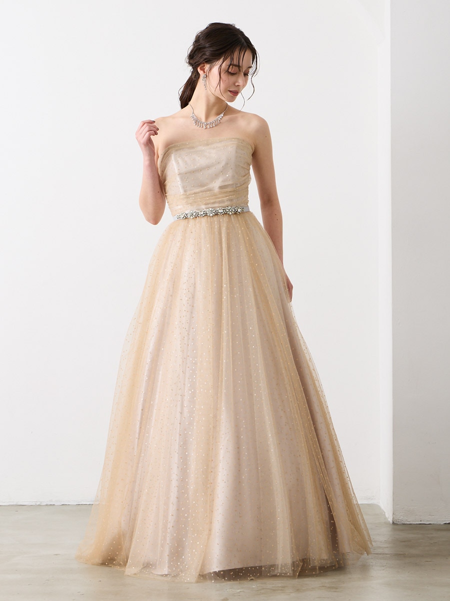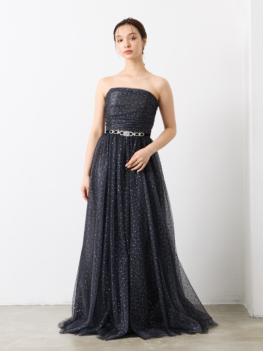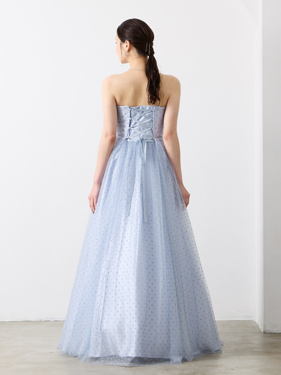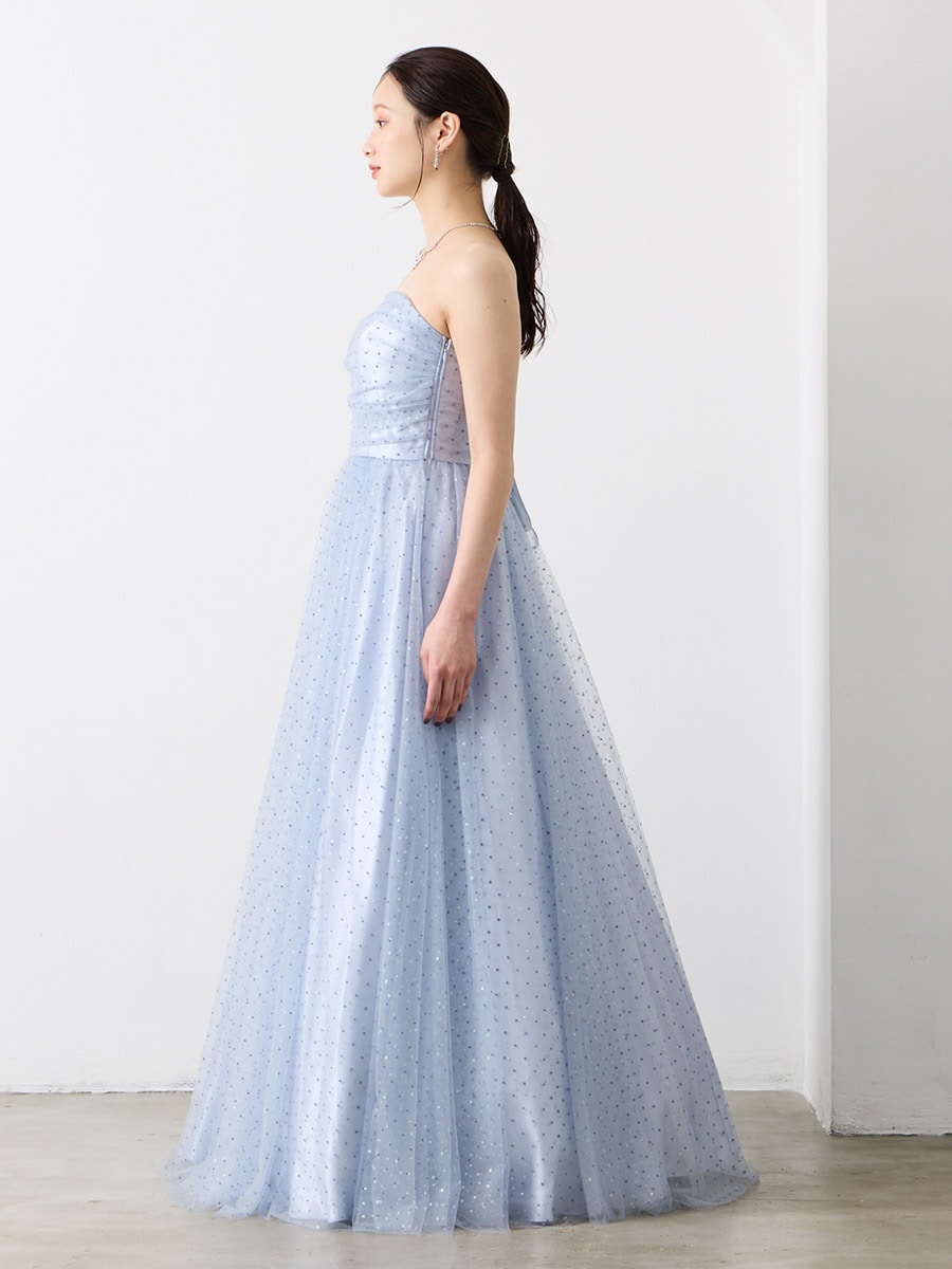 ・ドレス全体にグリッター加工、フロッキー加工をしたチュール生地を使用。