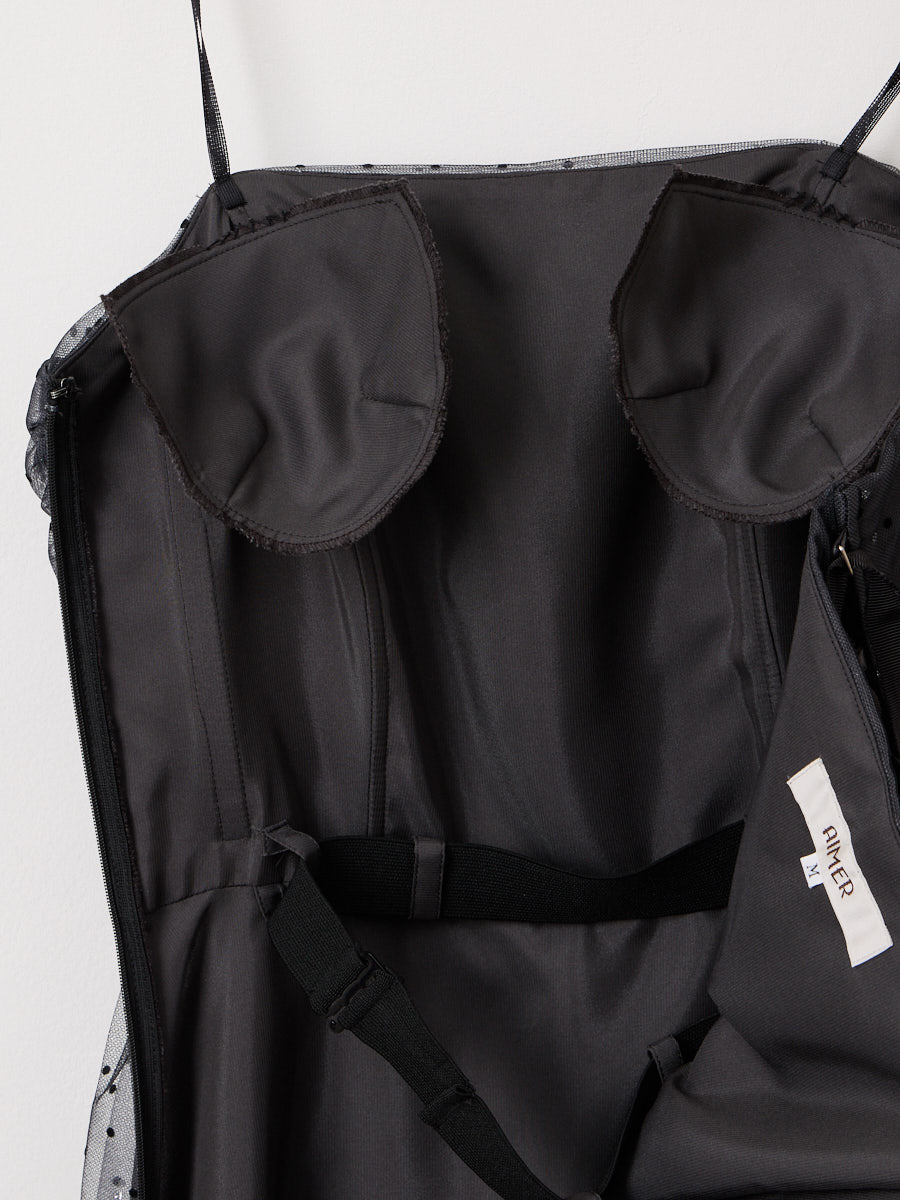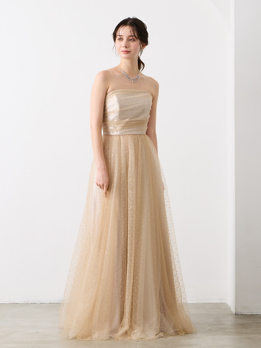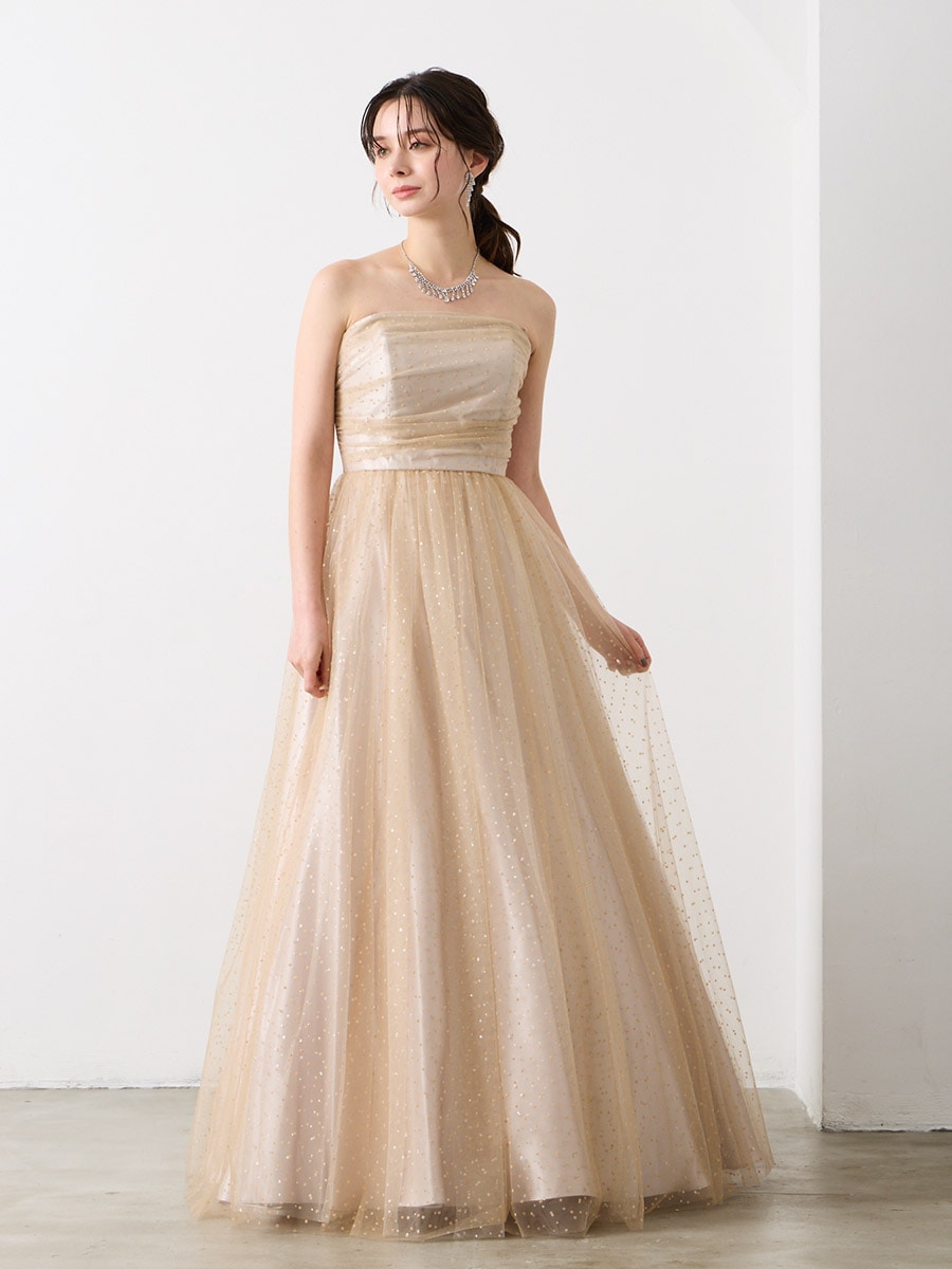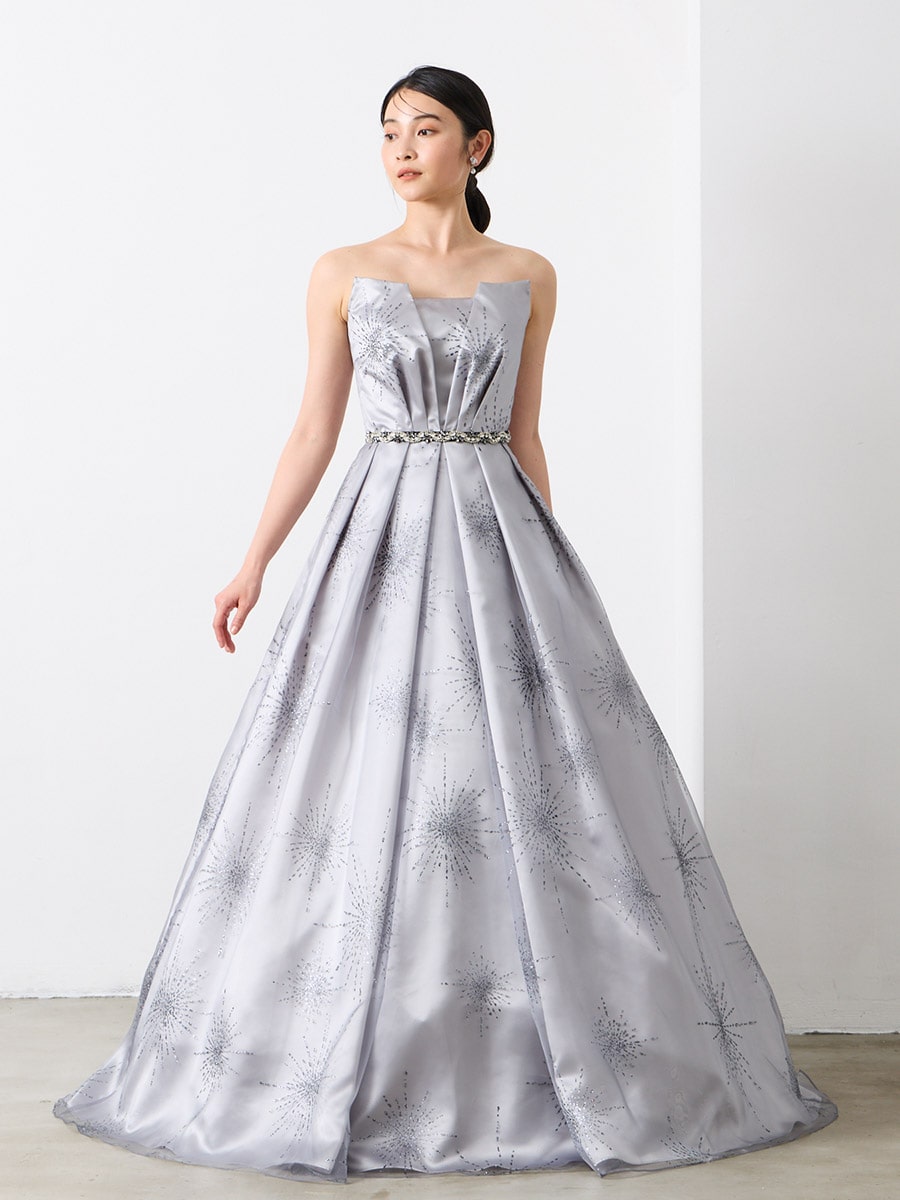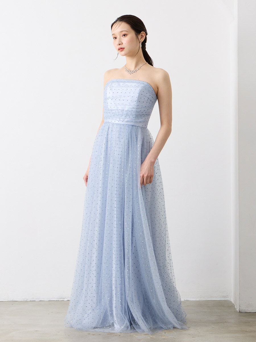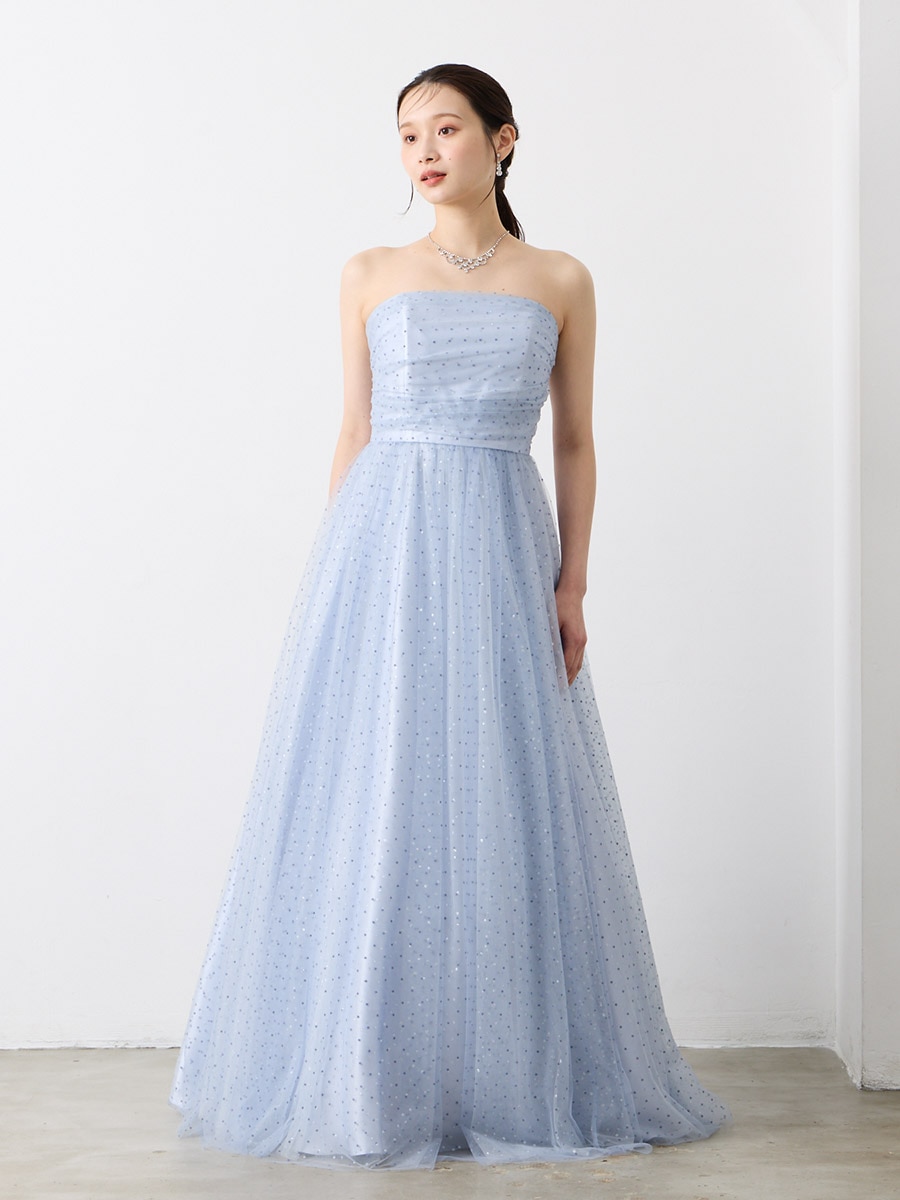 ・ドレス全体にグリッター加工、フロッキー加工をしたチュール生地を使用。