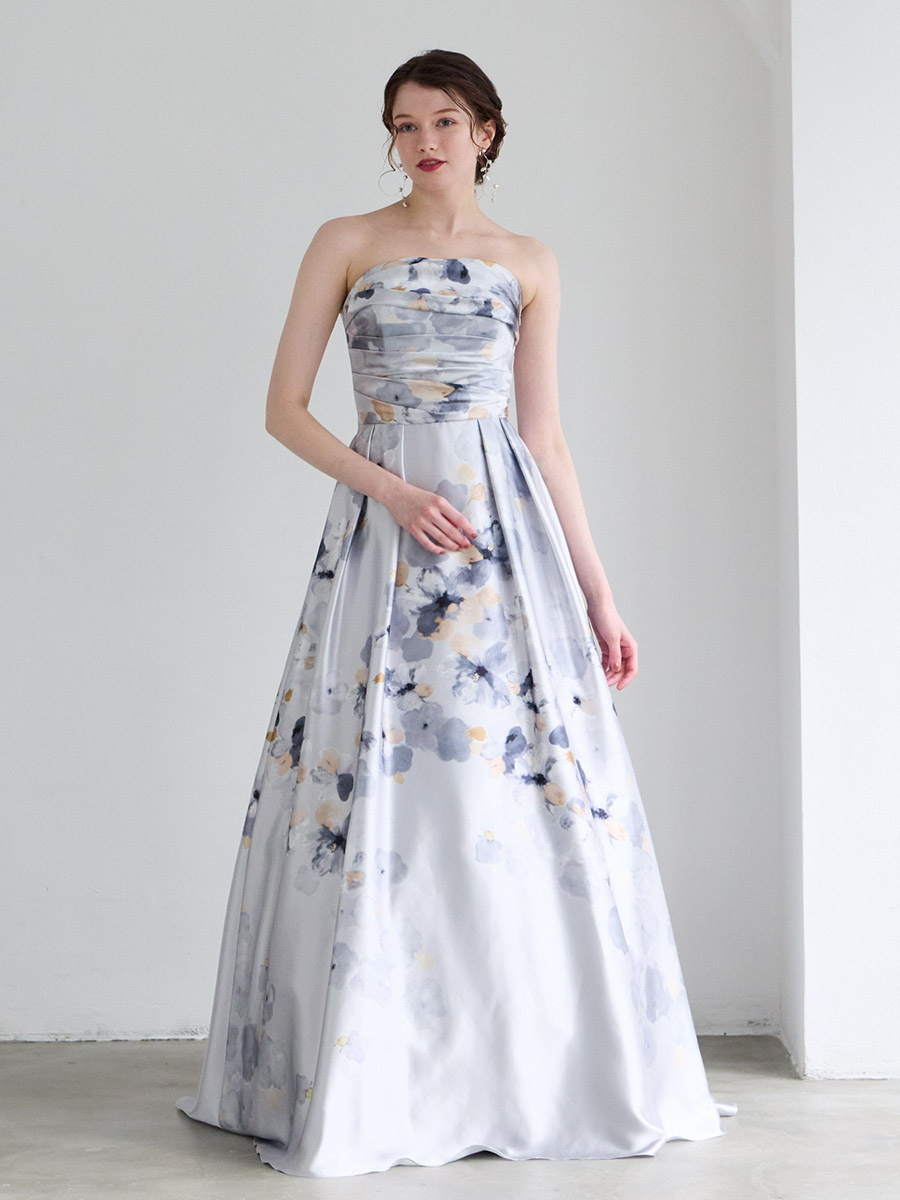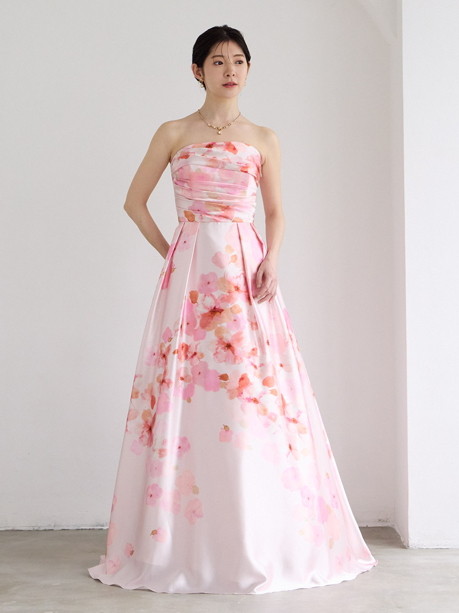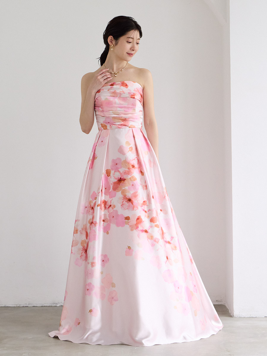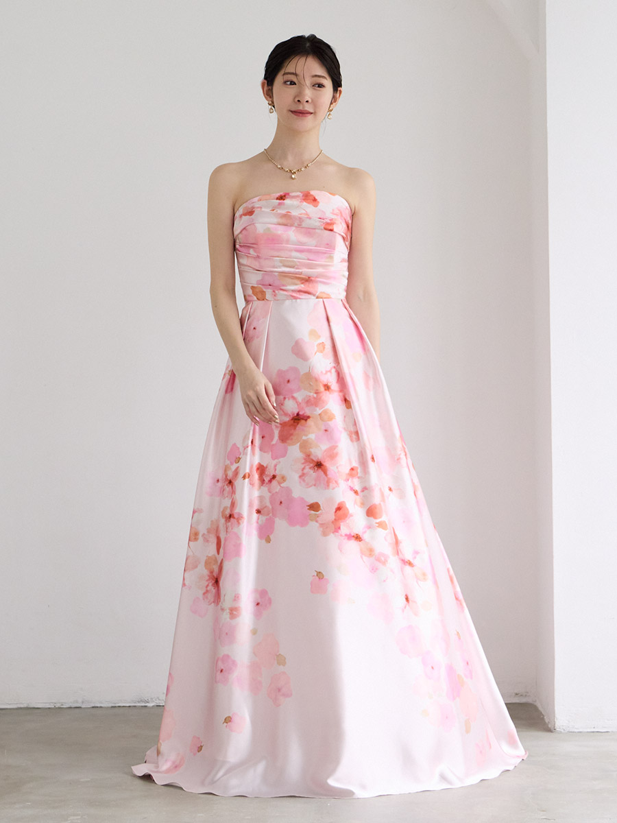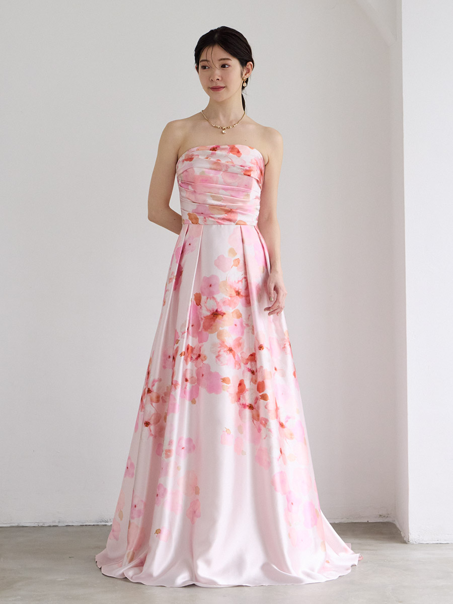 柔らかな光沢のサテン生地に、淡く広がる花模様が上品なドレス。