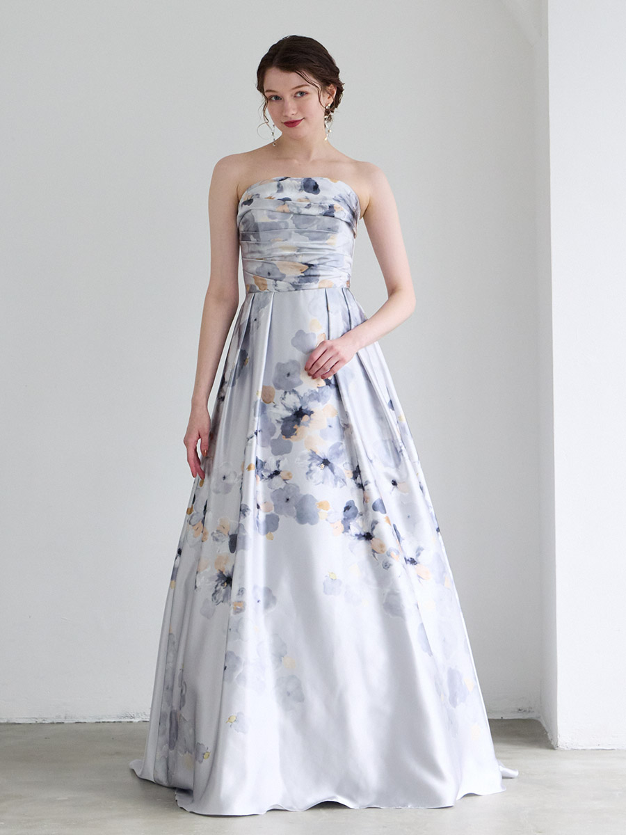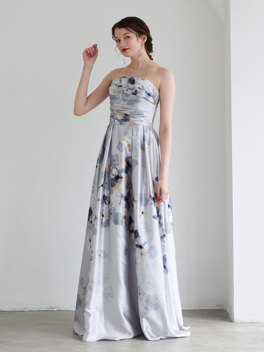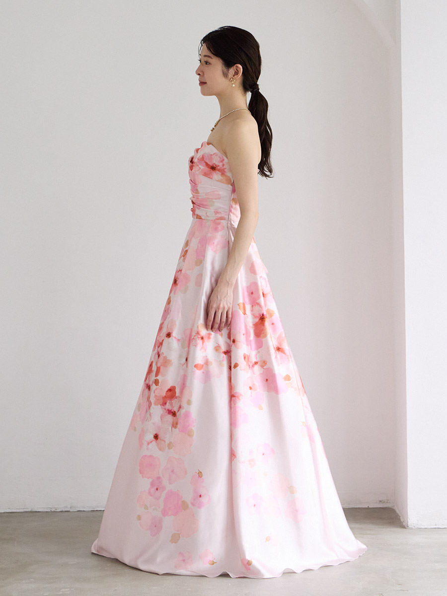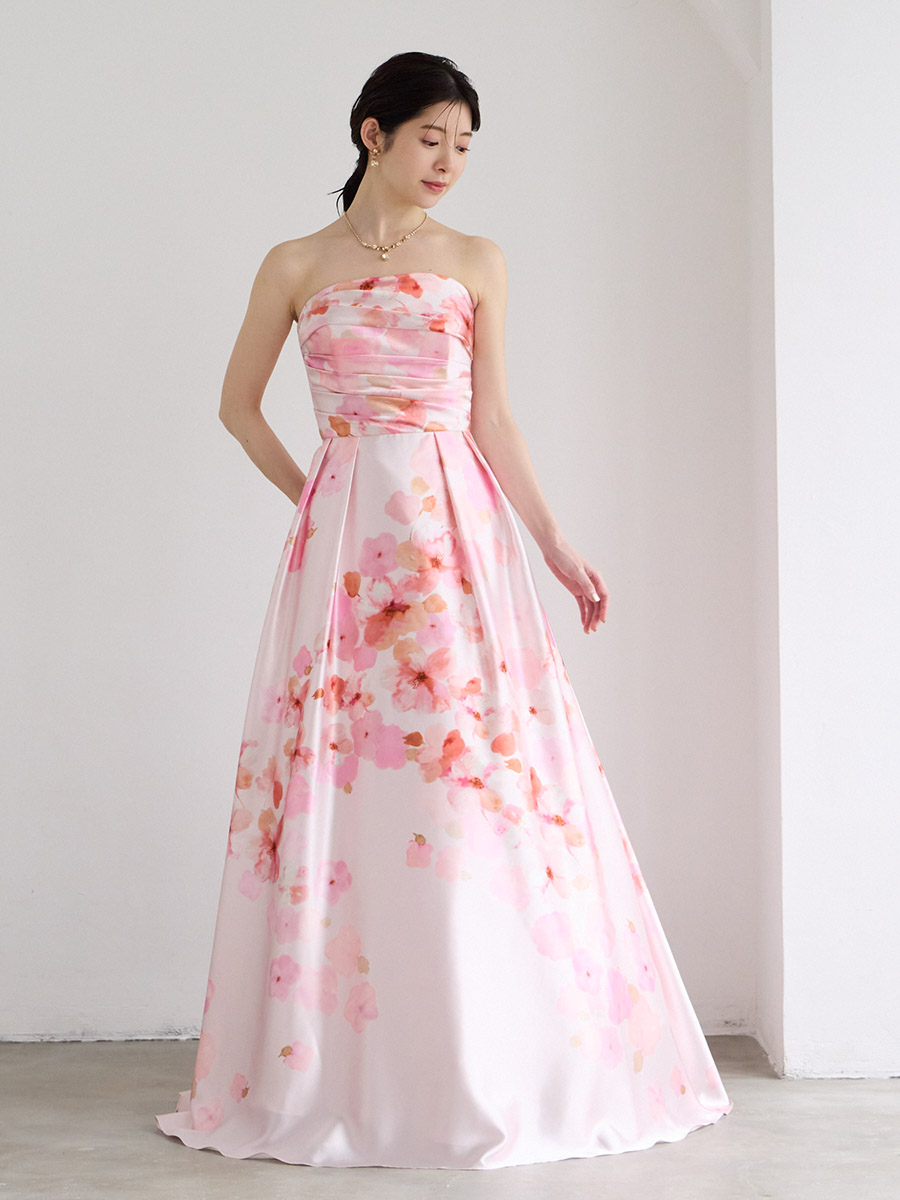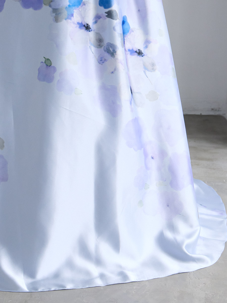 柔らかな光沢のサテン生地に、淡く広がる花模様が上品なドレス。
