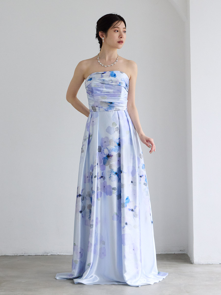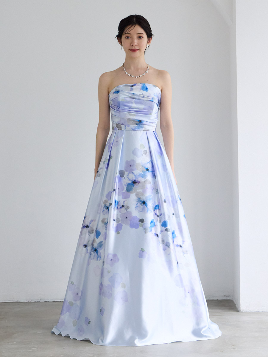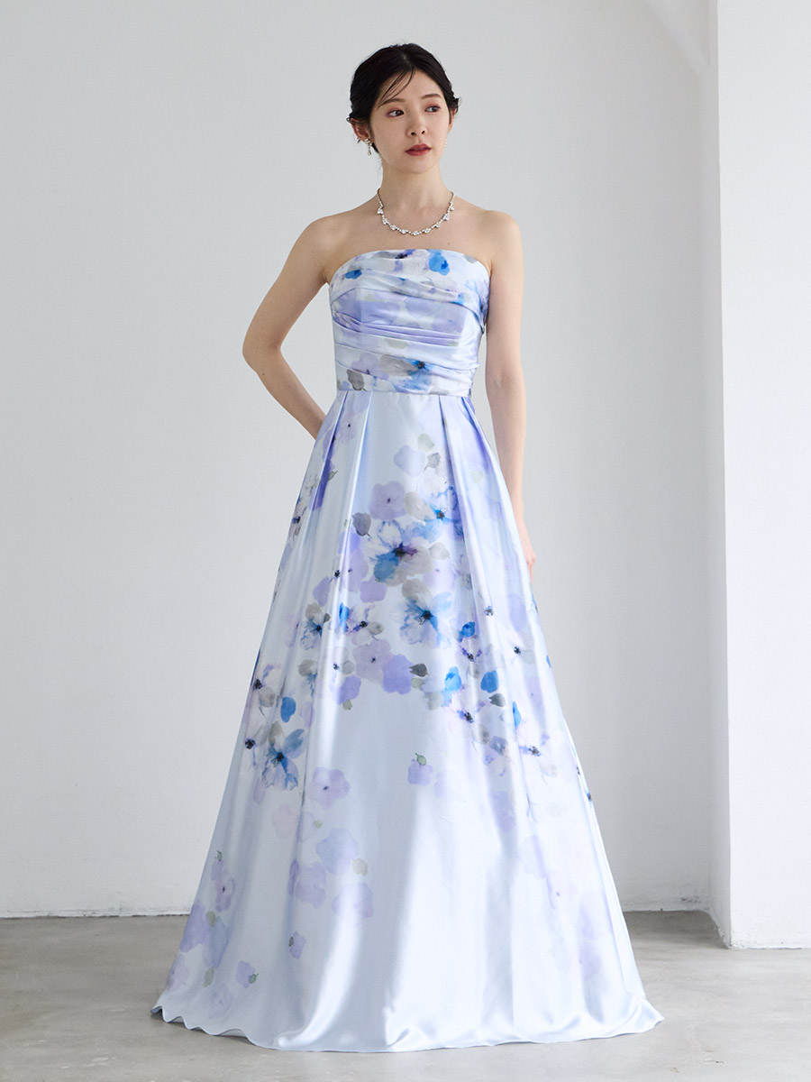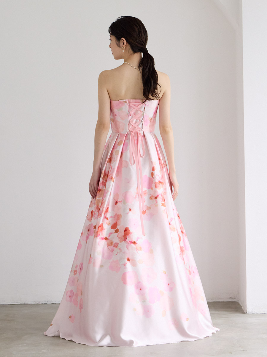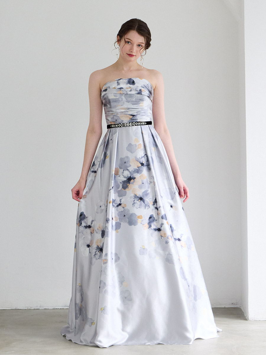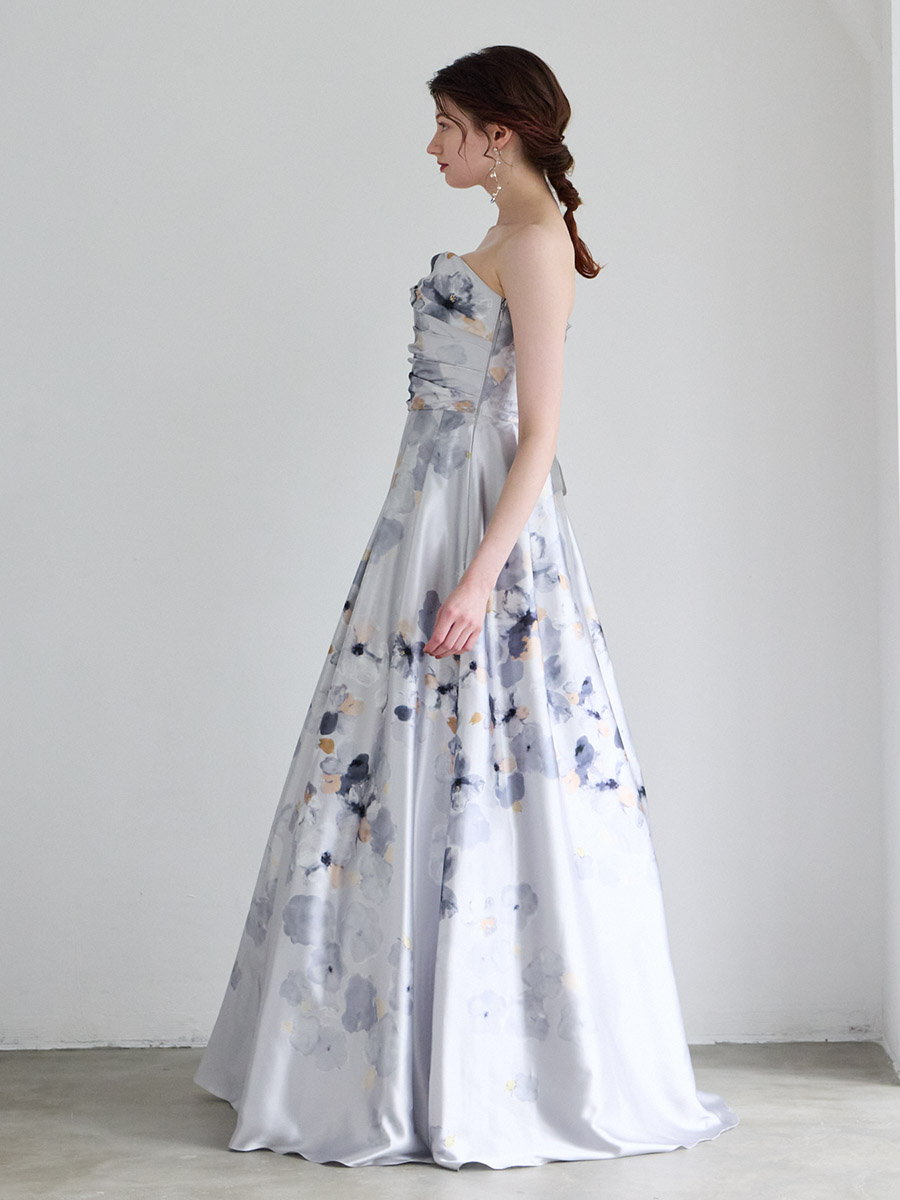 柔らかな光沢のサテン生地に、淡く広がる花模様が上品なドレス。