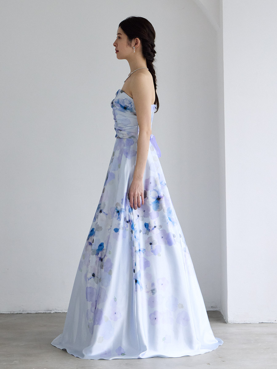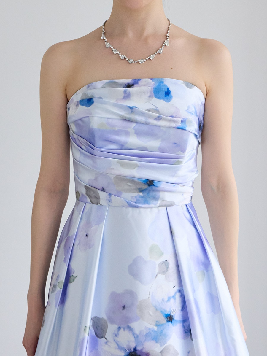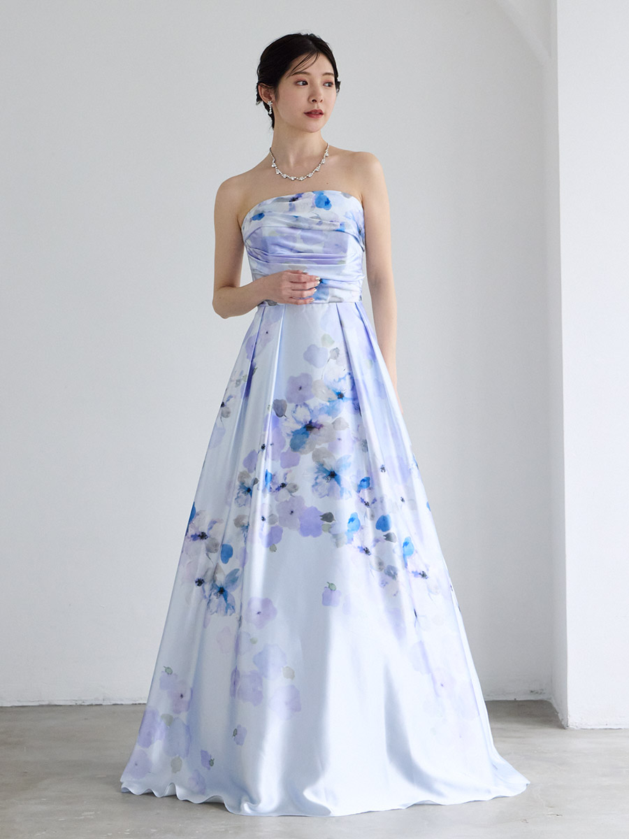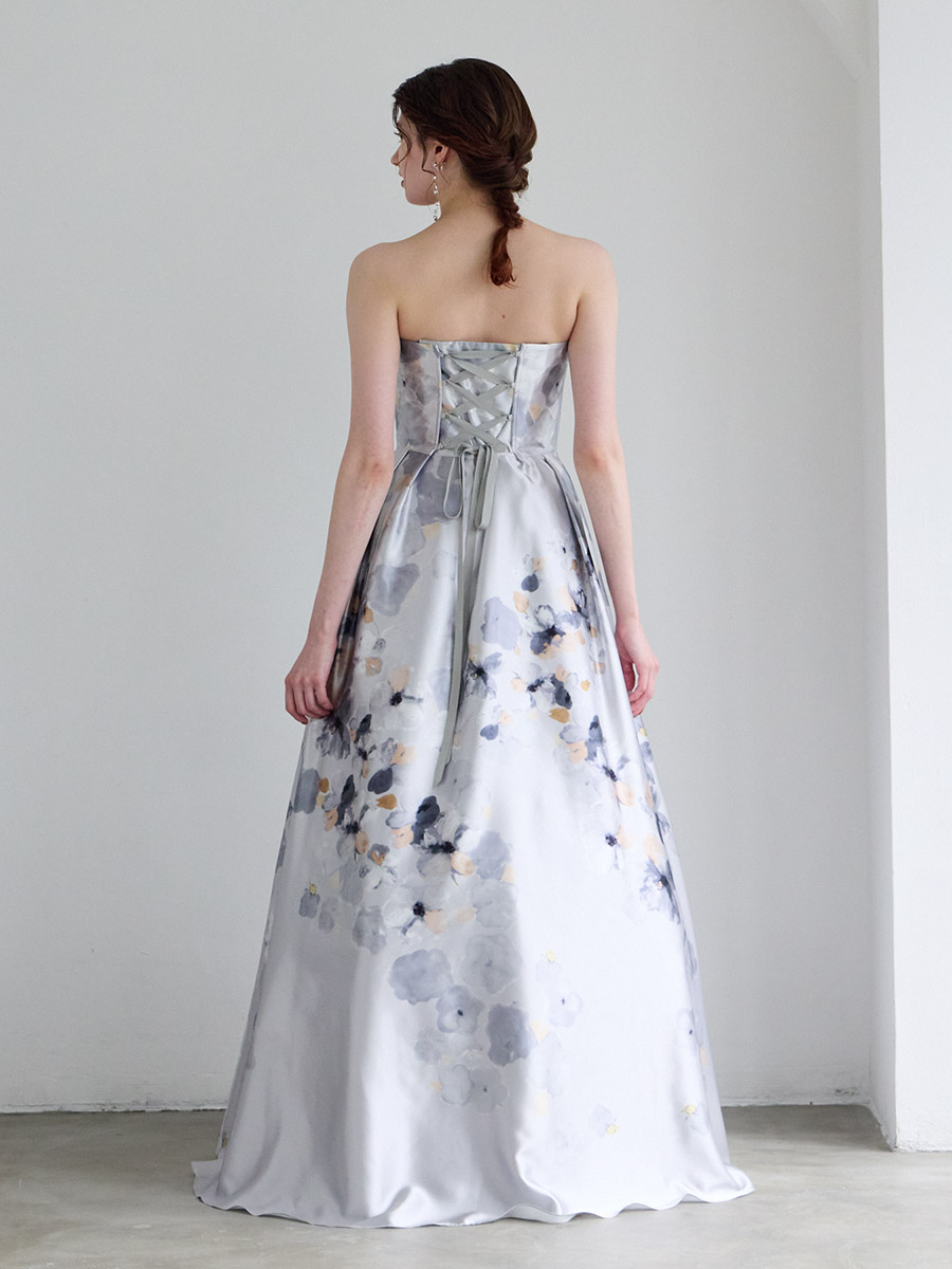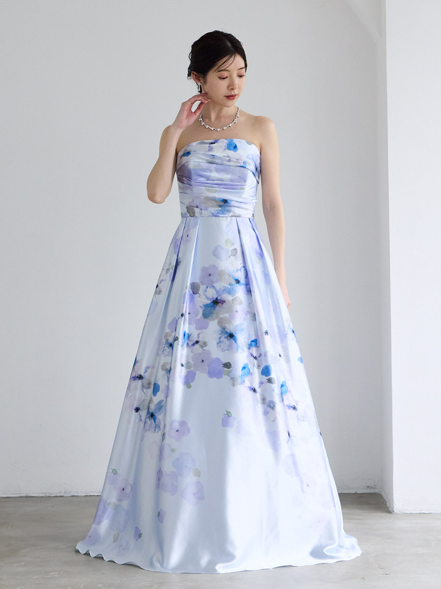 柔らかな光沢のサテン生地に、淡く広がる花模様が上品なドレス。