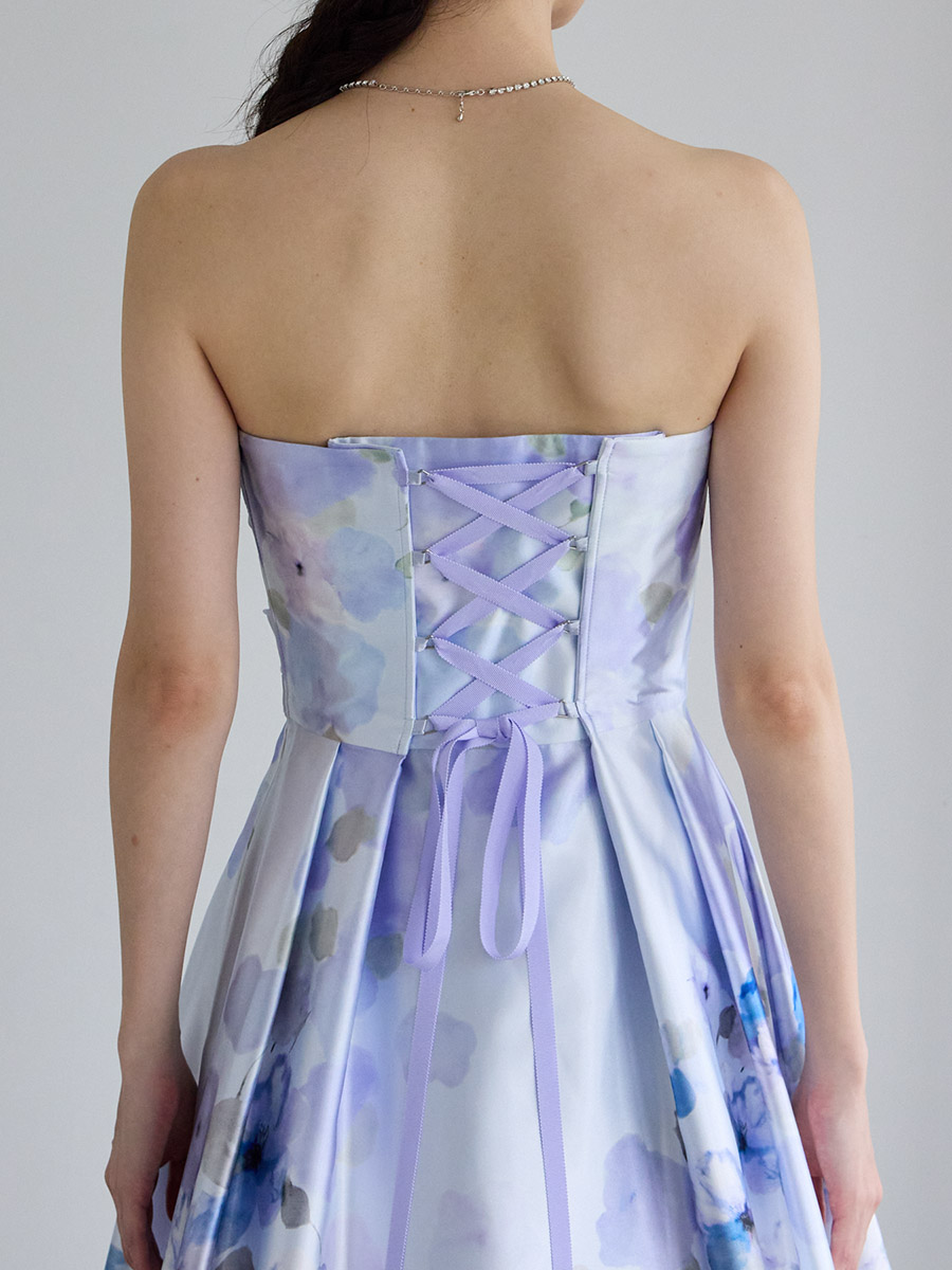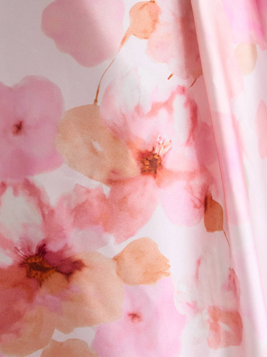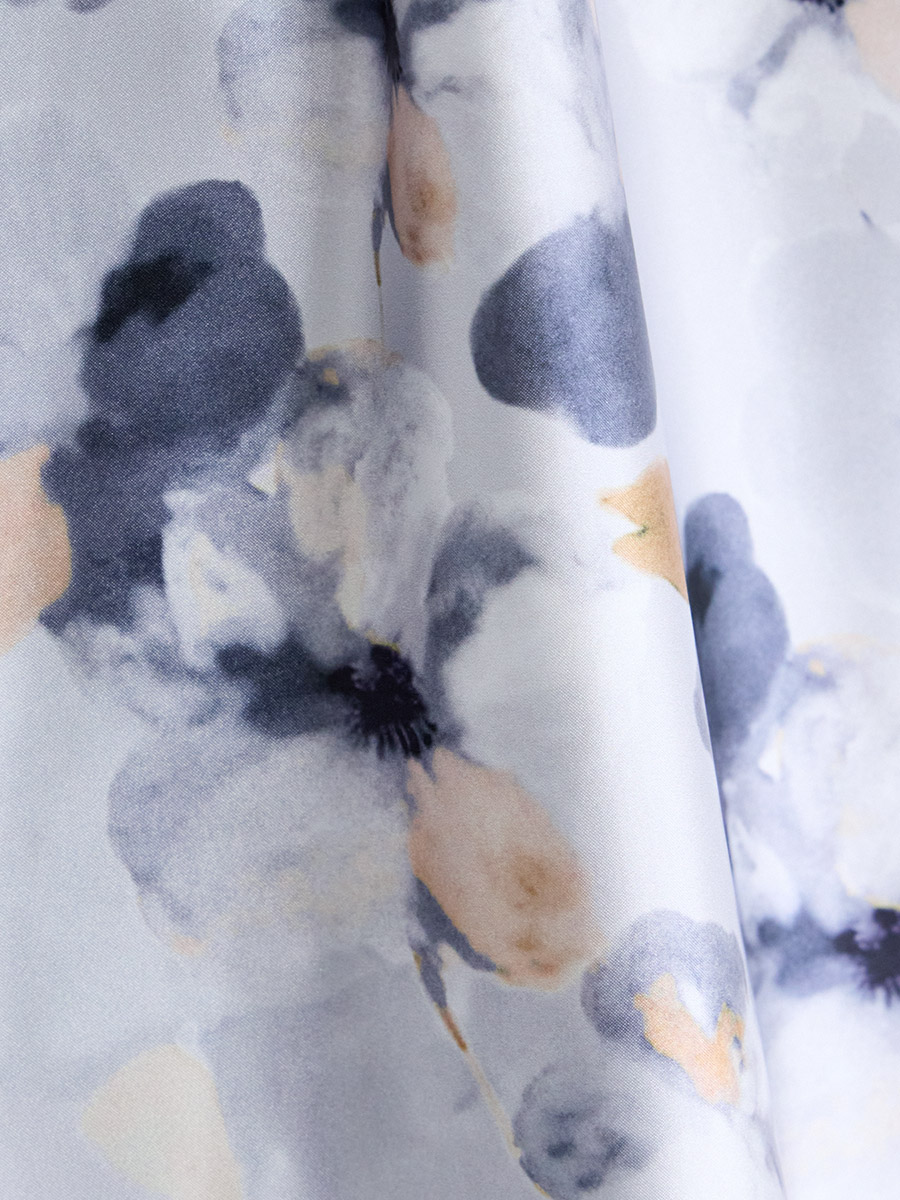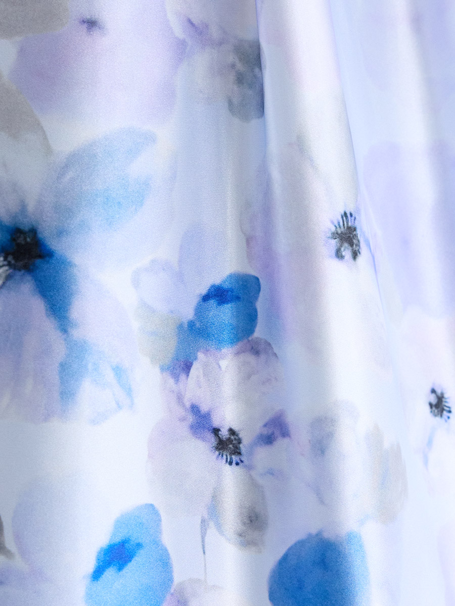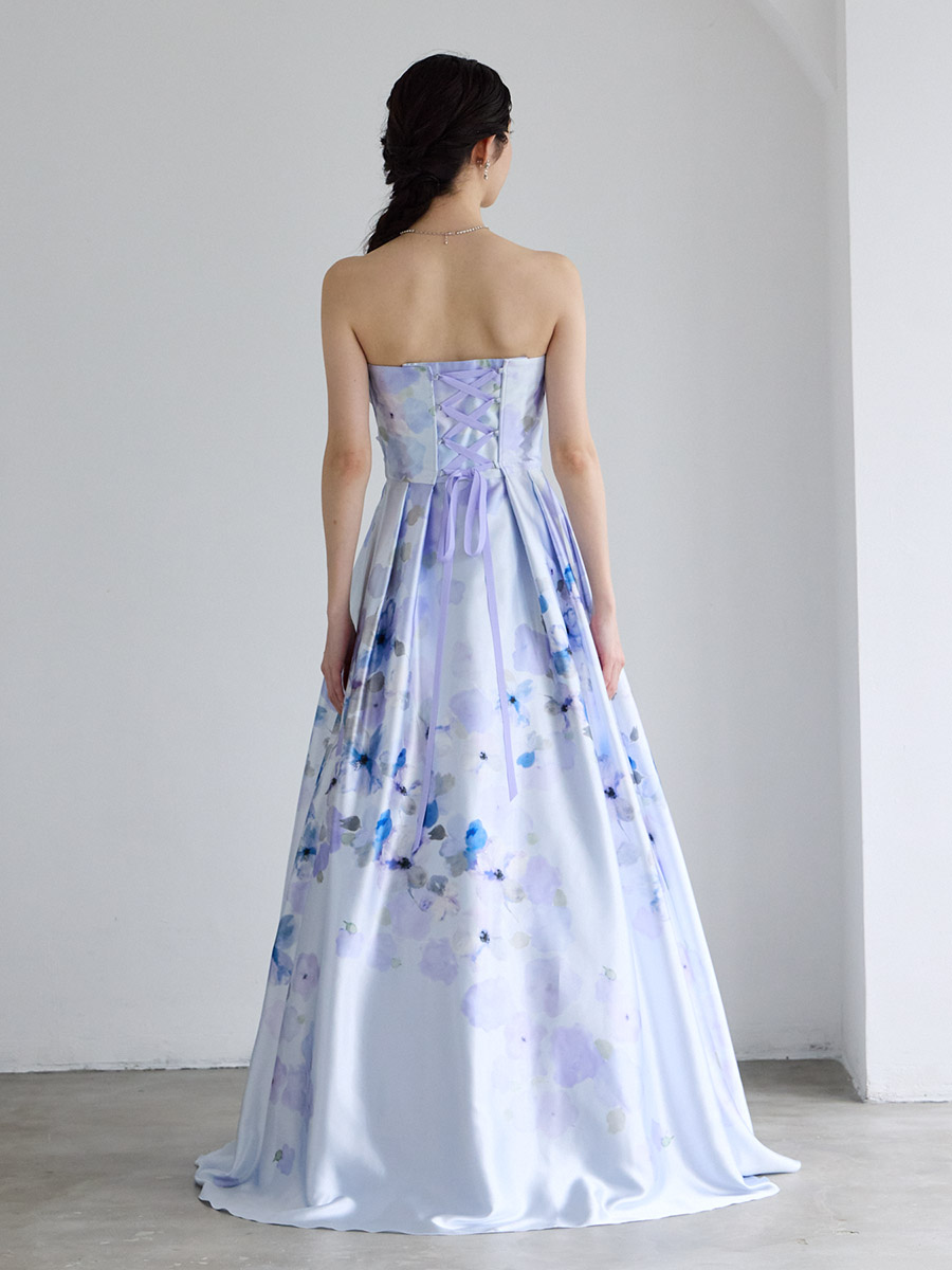柔らかな光沢のサテン生地に、淡く広がる花模様が上品なドレス。