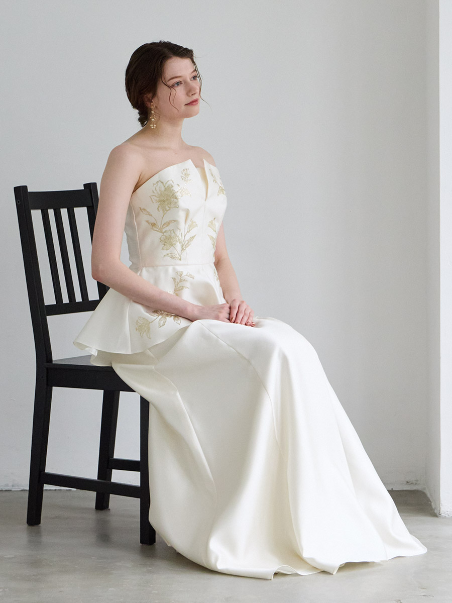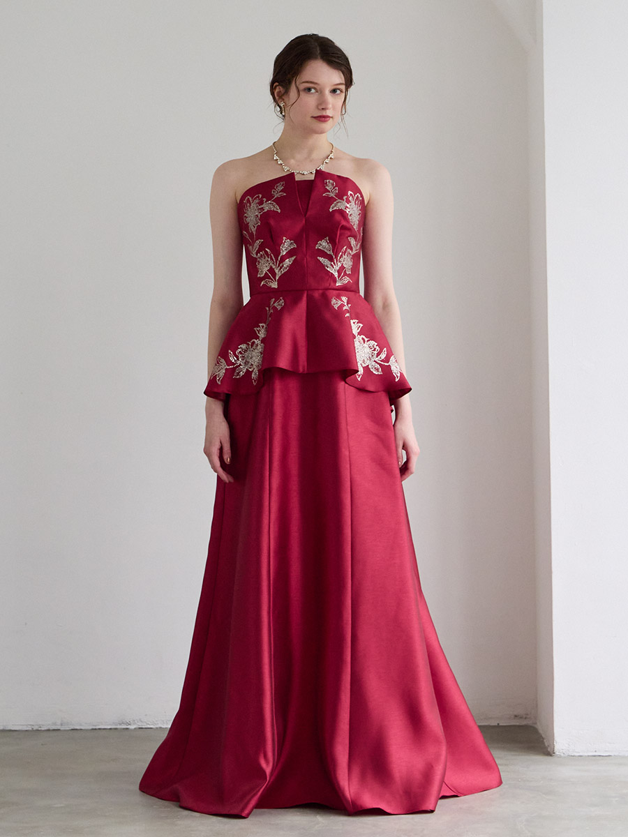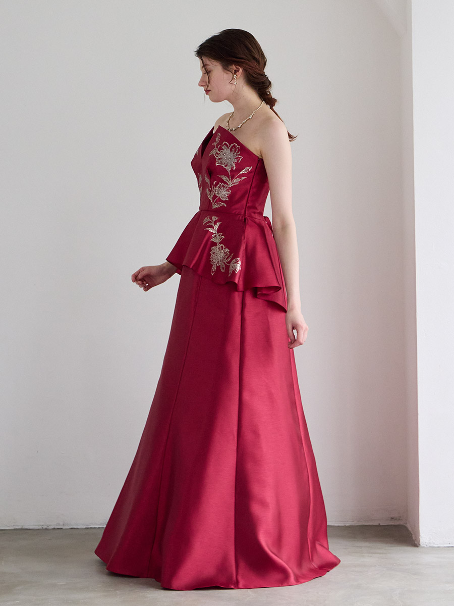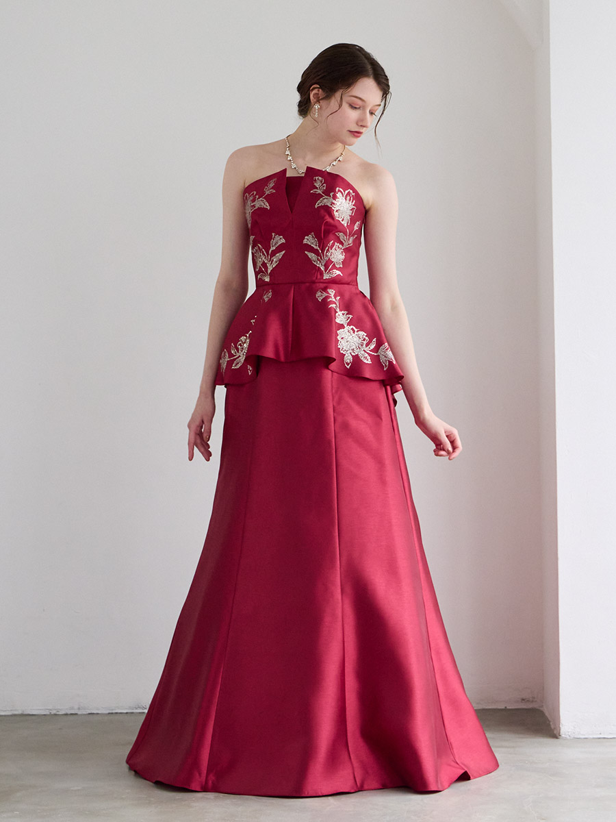 ペプラムデザインに合わせてグリッターで描いたフラワーモチーフが煌めくシャンタンドレス。
