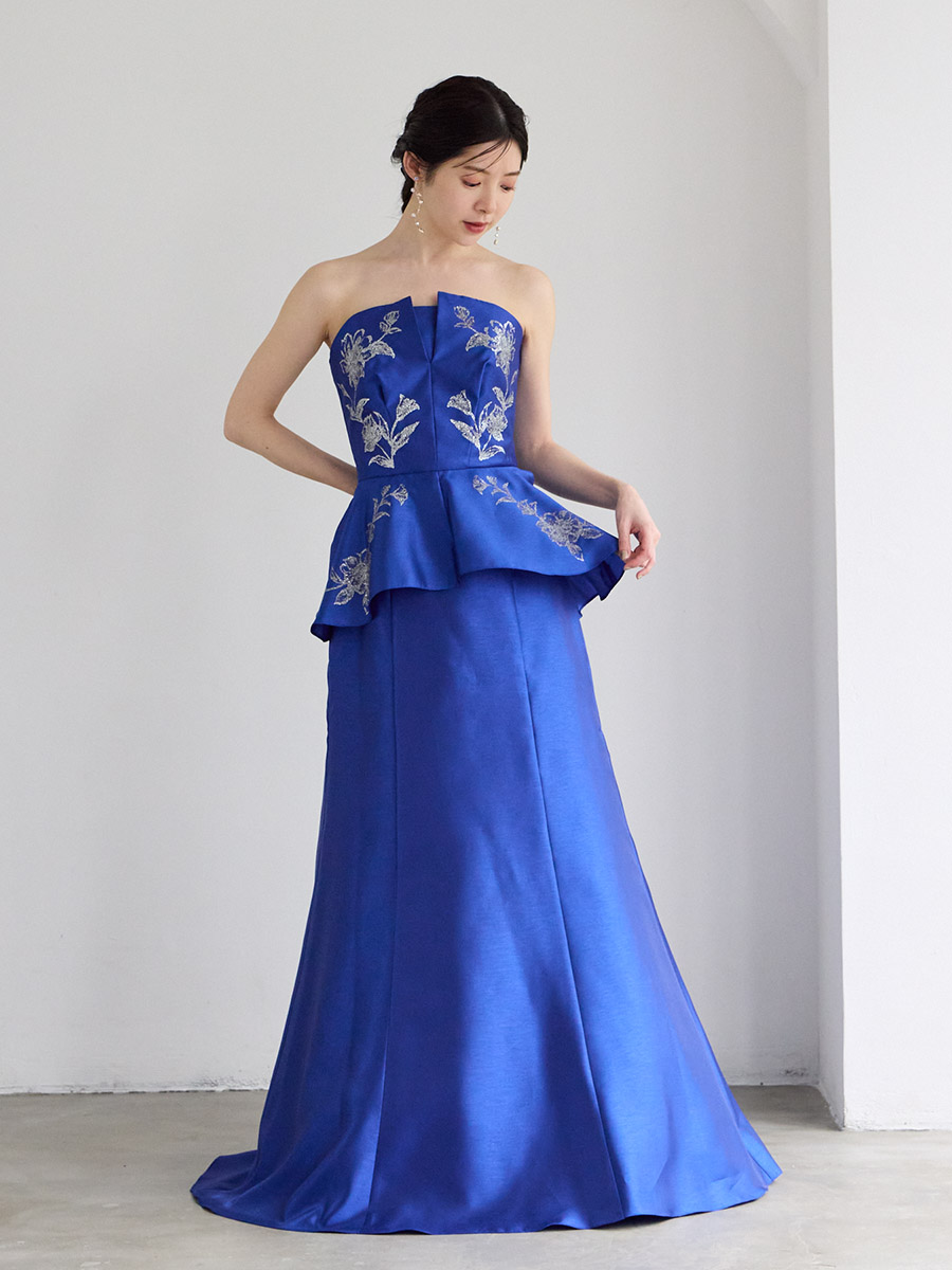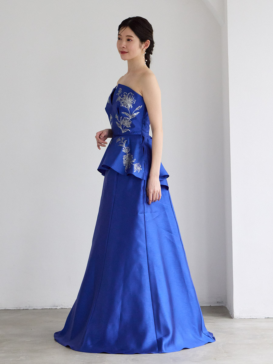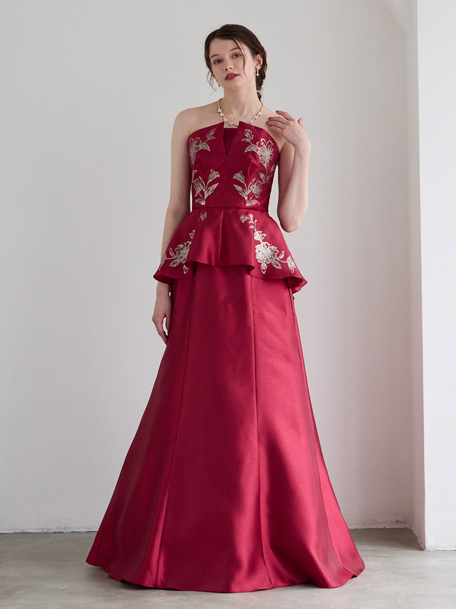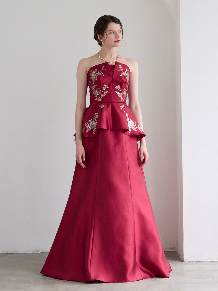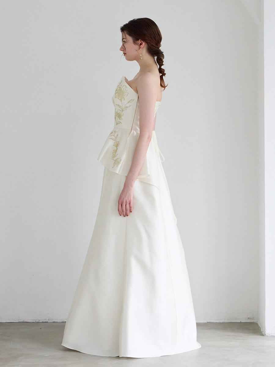 ペプラムデザインに合わせてグリッターで描いたフラワーモチーフが煌めくシャンタンドレス。