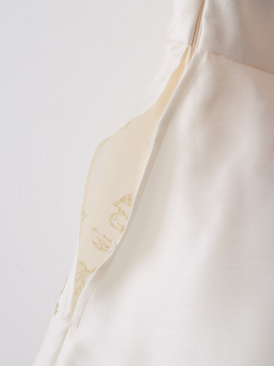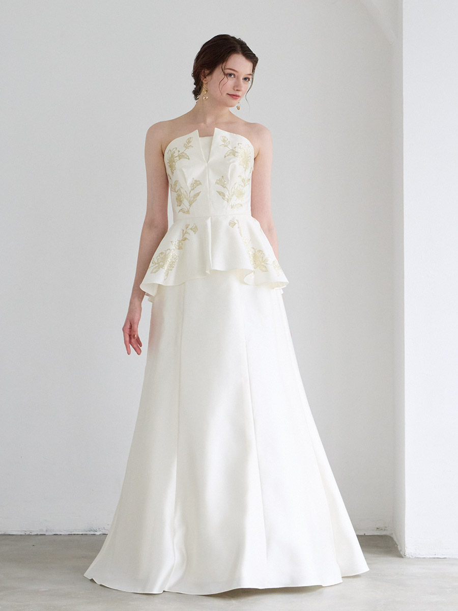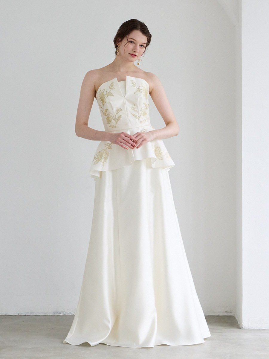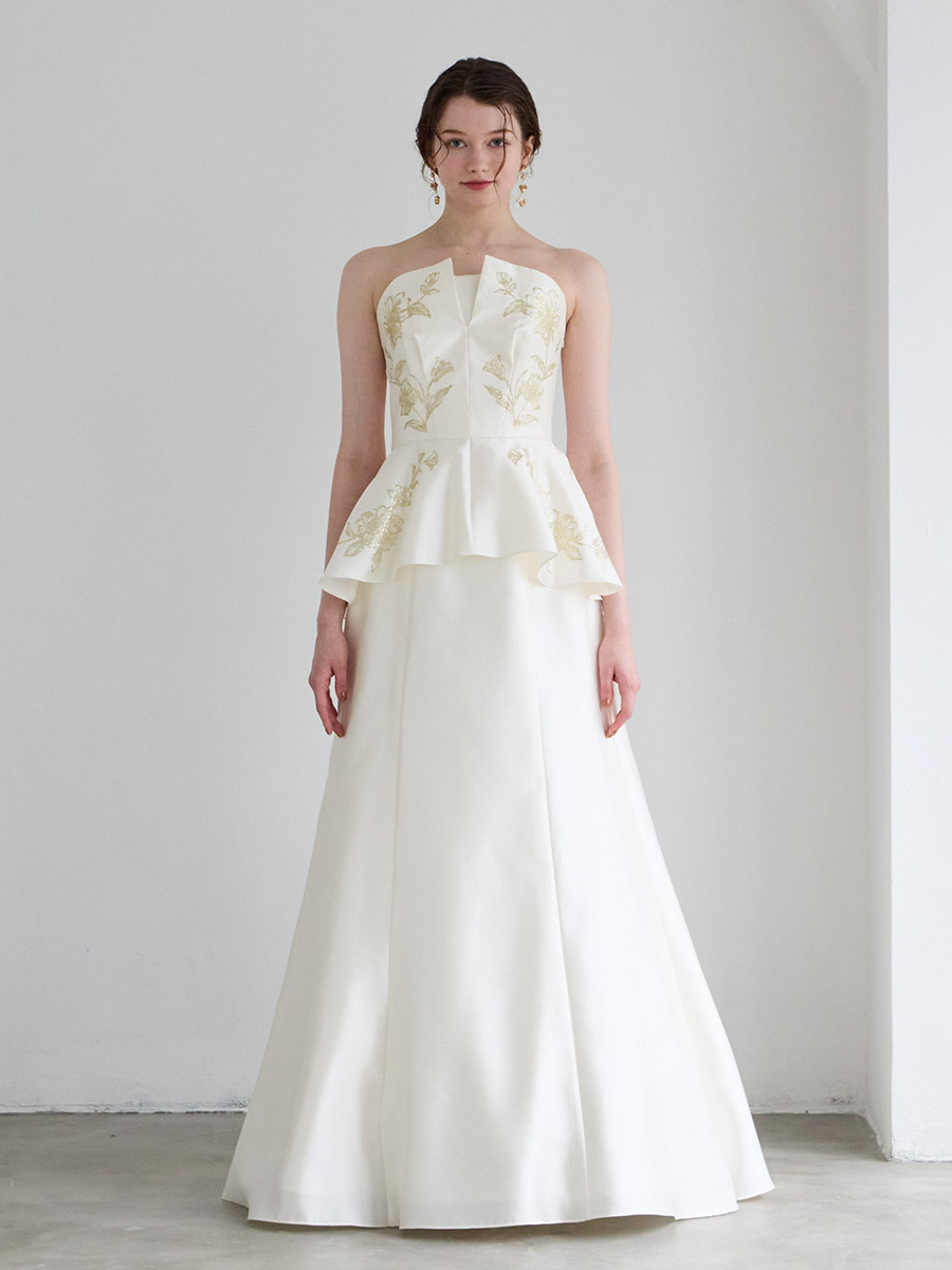 ペプラムデザインに合わせてグリッターで描いたフラワーモチーフが煌めくシャンタンドレス。