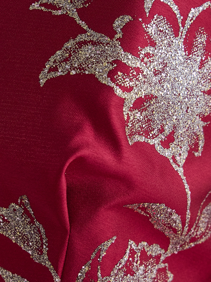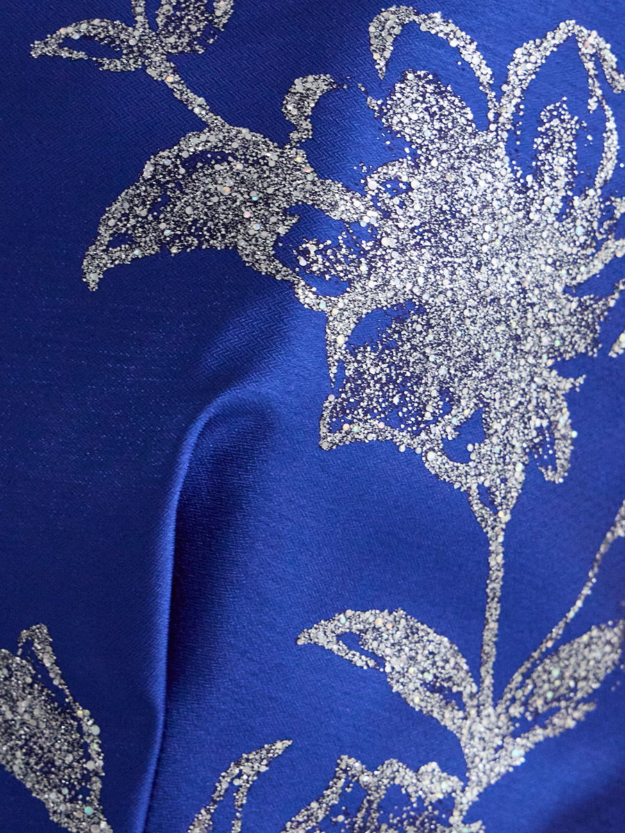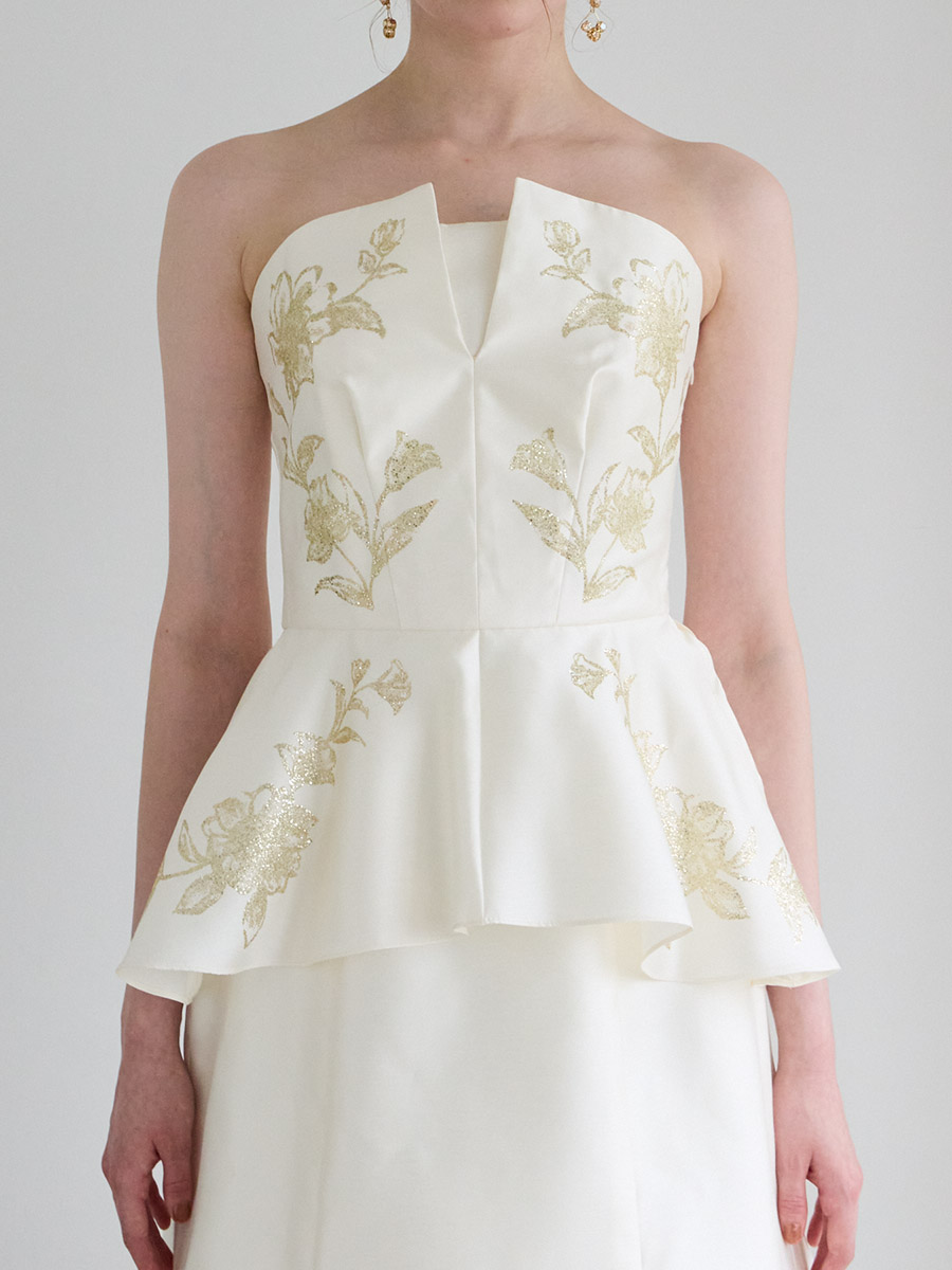 ・身頃と腰回りのペプラム部分に線描きの花柄をラメグリッター加工で描いています