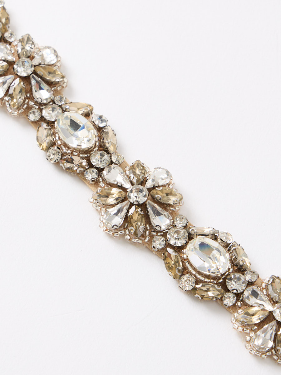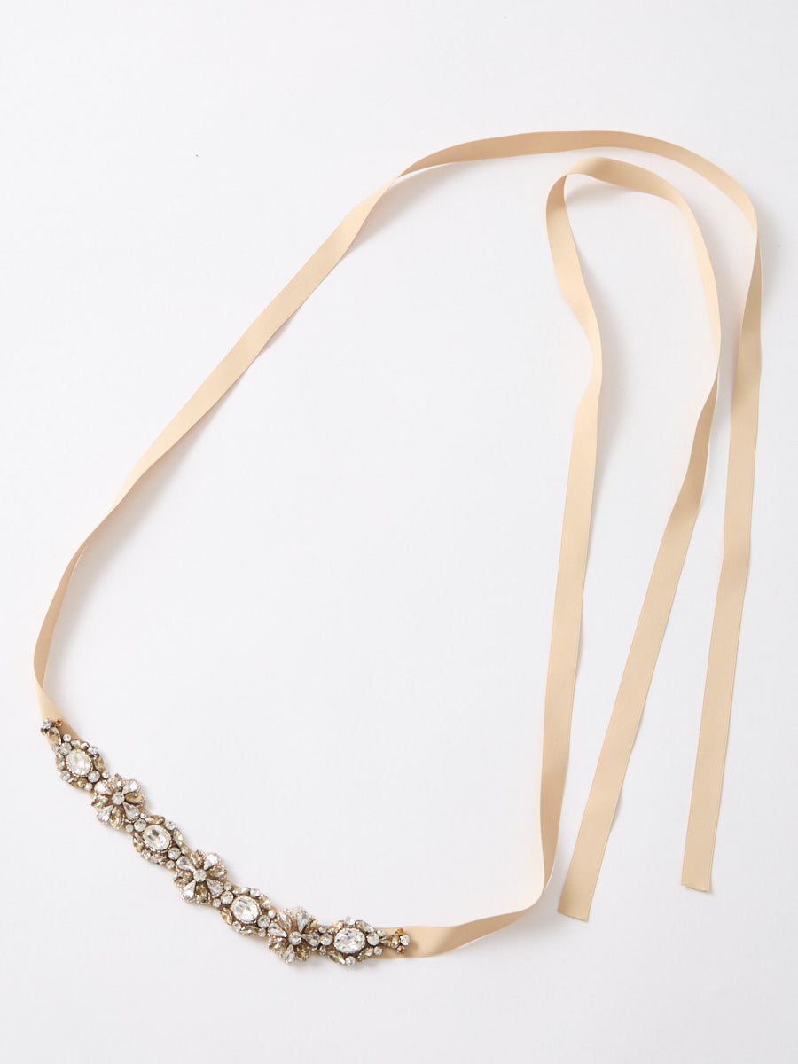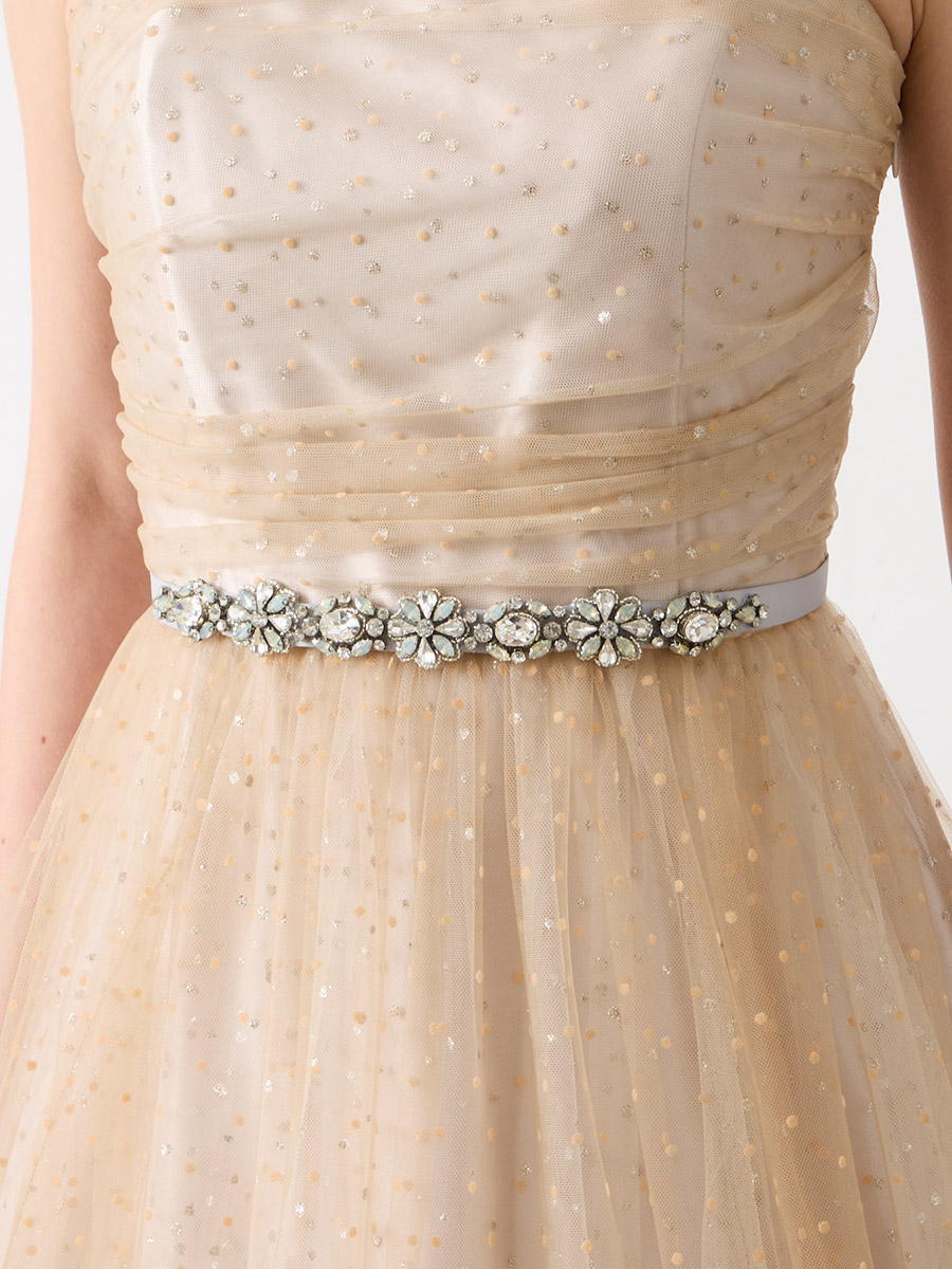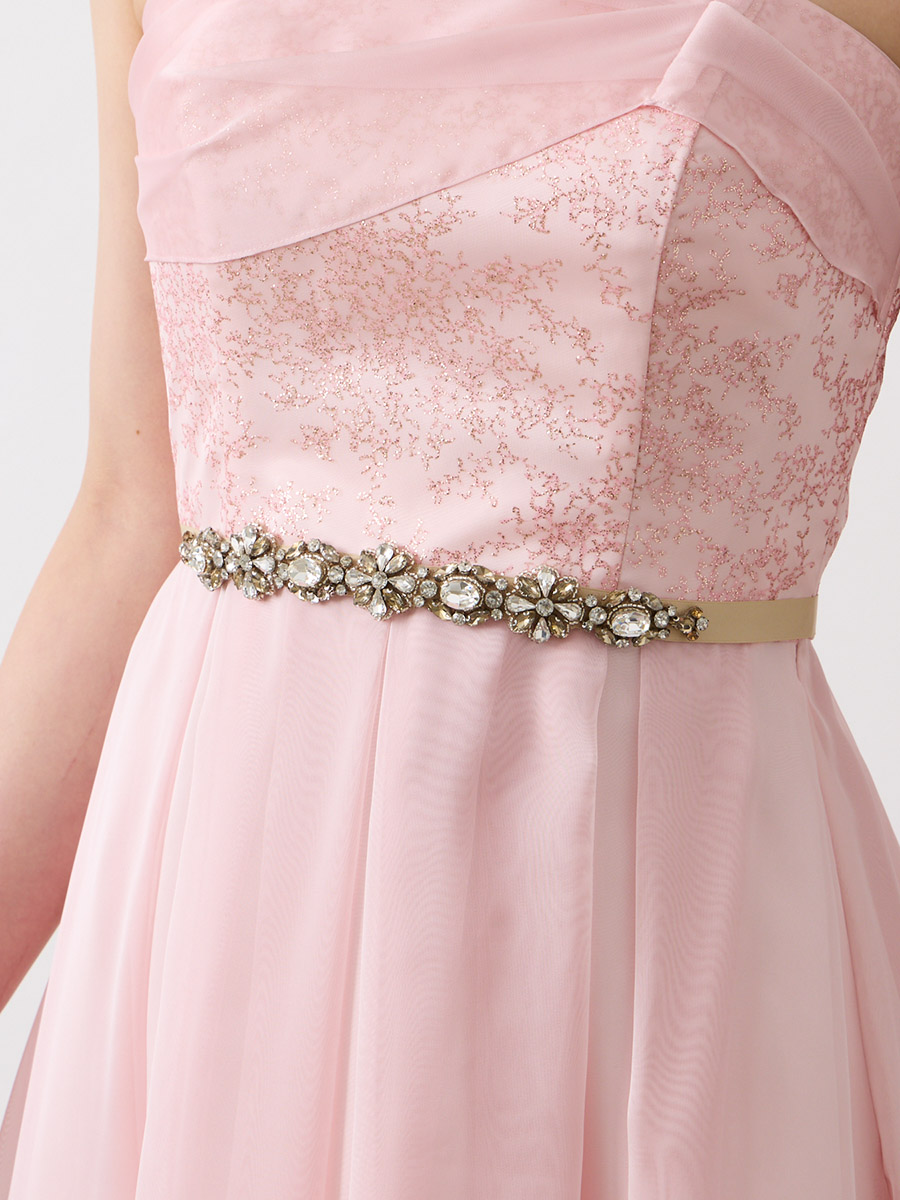 フラワーモチーフをベースに間にオーバルストーンを配置することで、バランスよくウエスト周りをすっきりと見せるデザインです。
