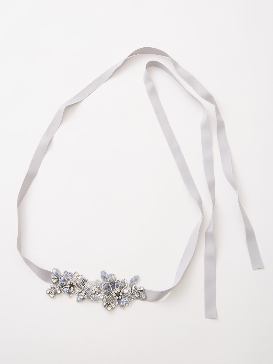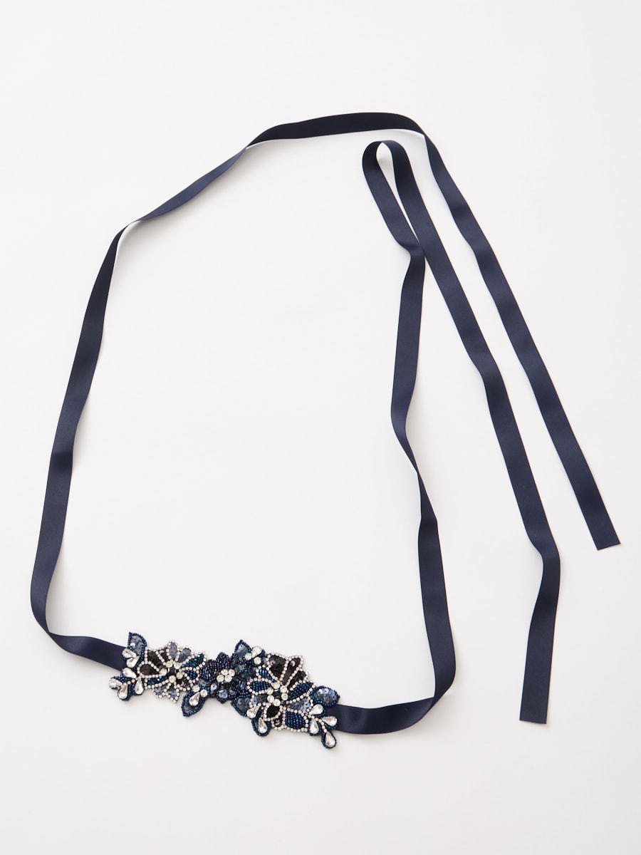 マットサテンのリボンに華やかなスパンコールとアクリルストーン、繊細なビーズ刺繍で仕上げたサッシュベルトです。