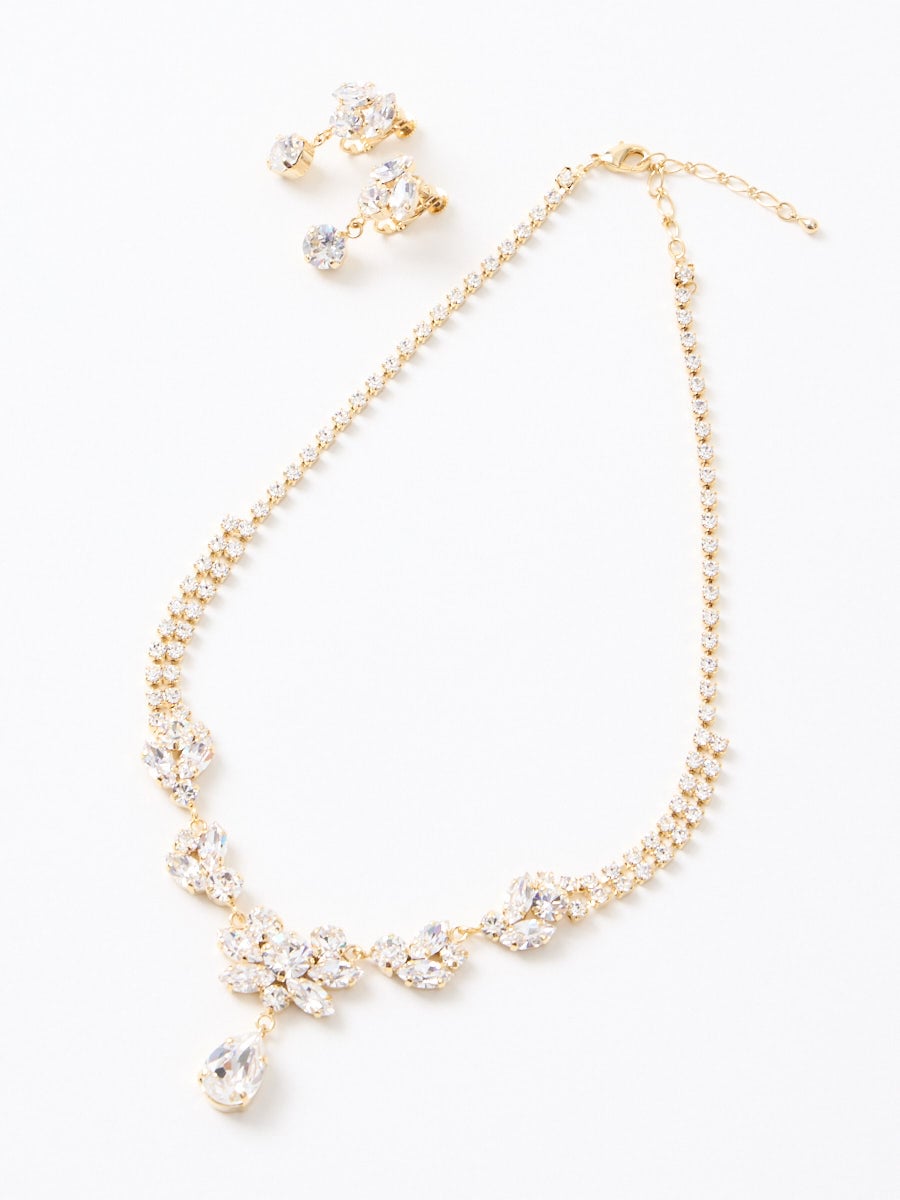 Vラインのデザインが、どんなネックラインのドレスにも合わせやすく、デコルテを華やかに彩るネックレスセットとなっています。