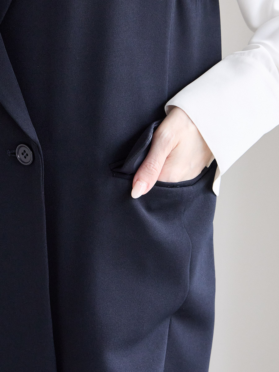 ・お尻の隠れる安心丈、テーラーカラーがきちんとした印象に見せてくれます