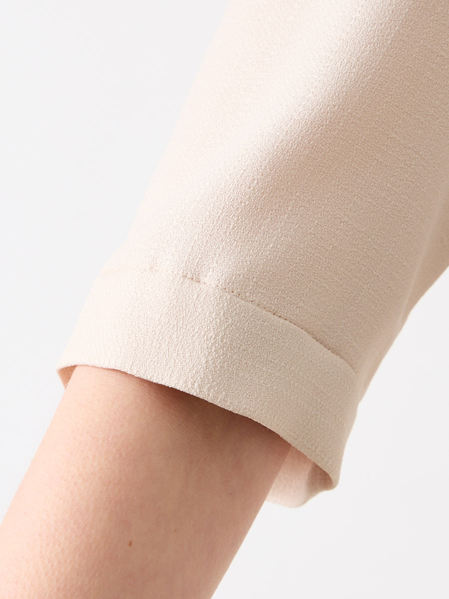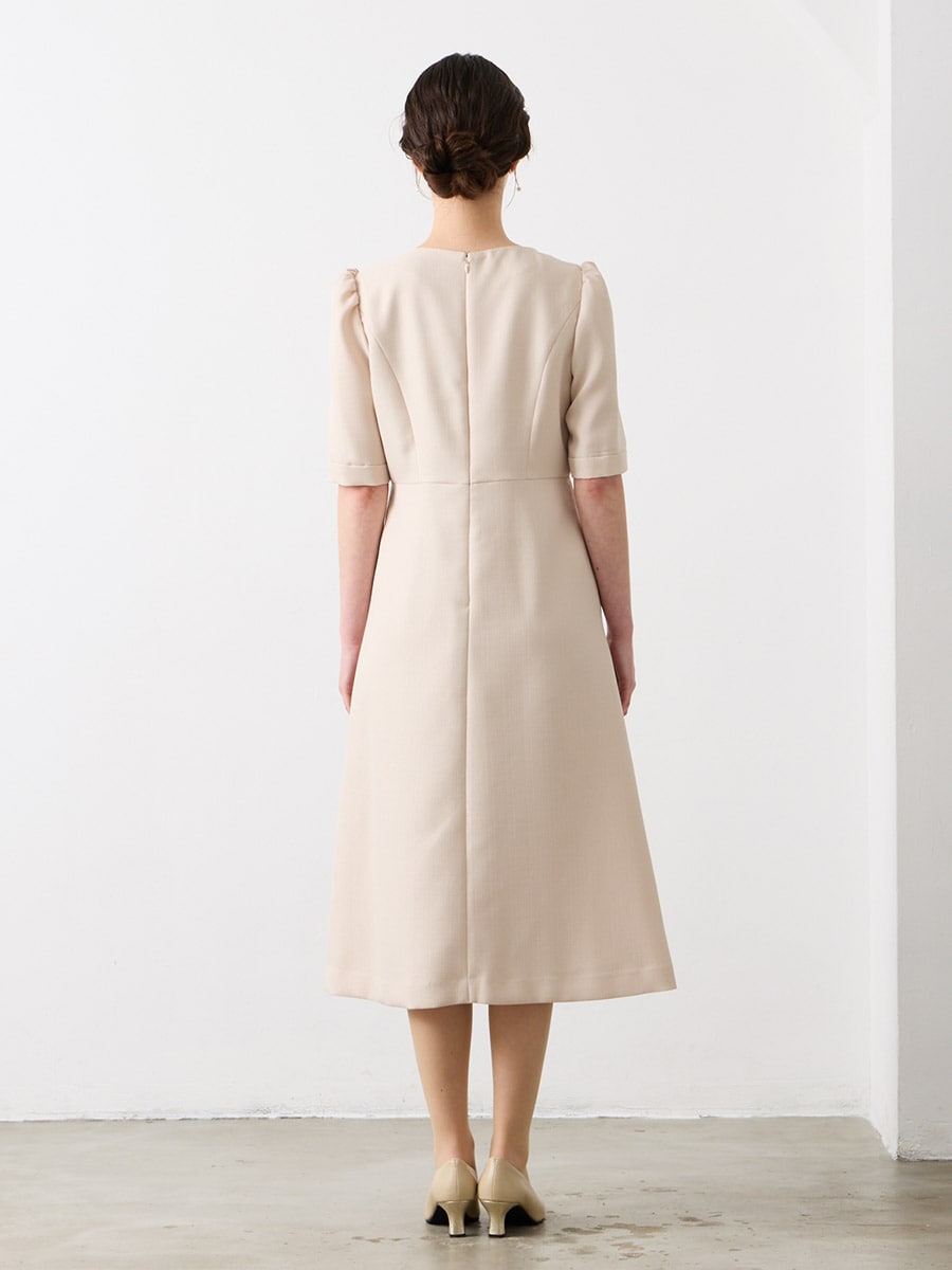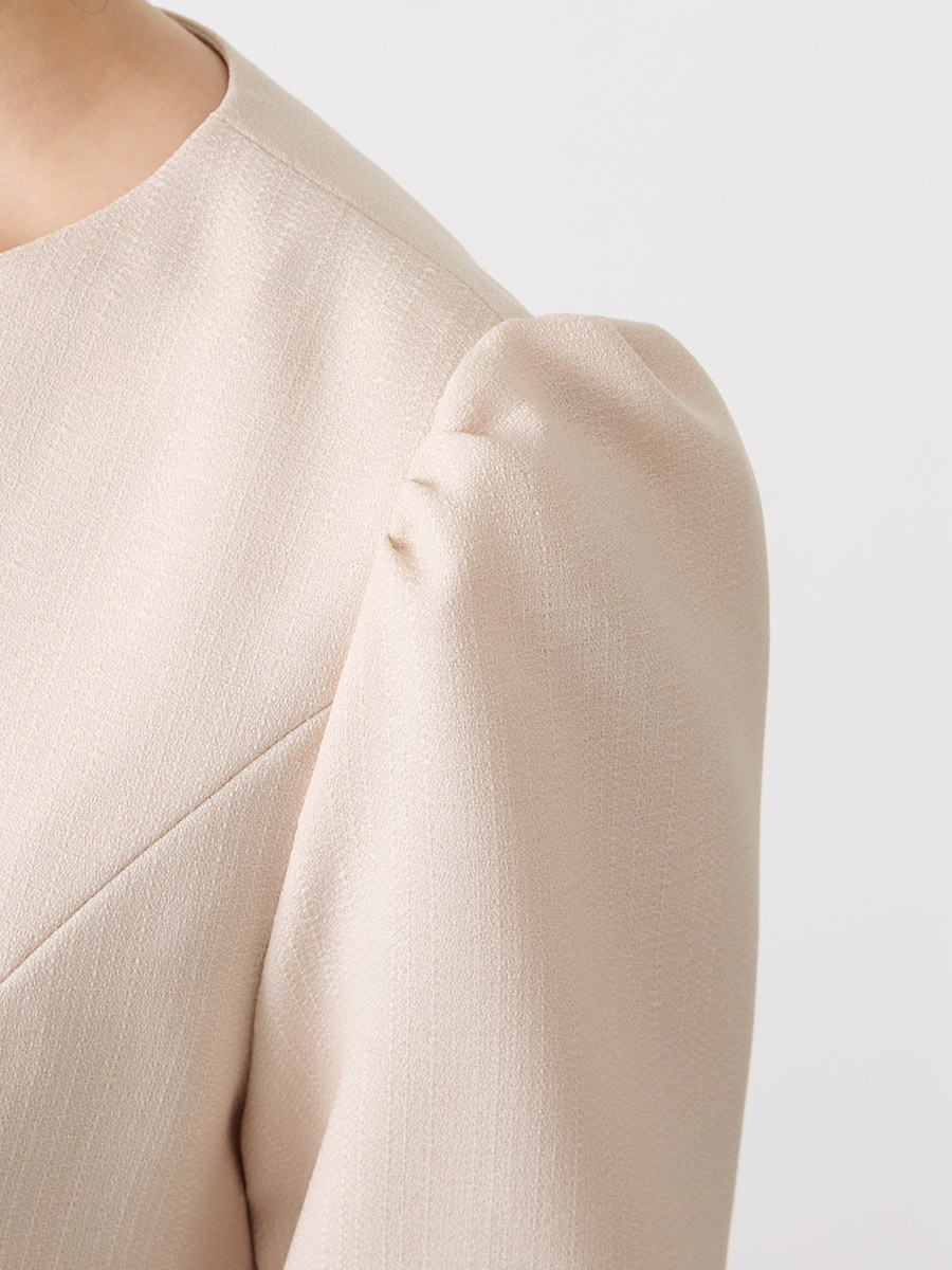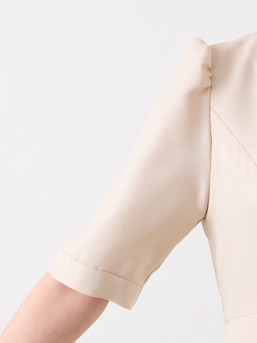 当て布付きのVカットの襟元が上品な印象で、袖山にはギャザーを寄せてフェミニンに仕上げています。