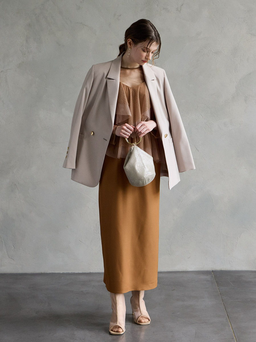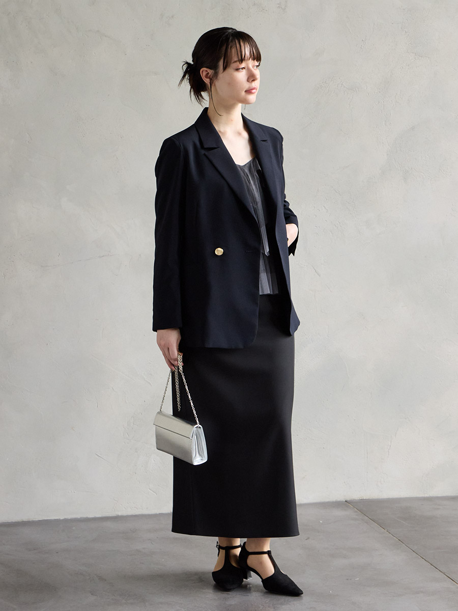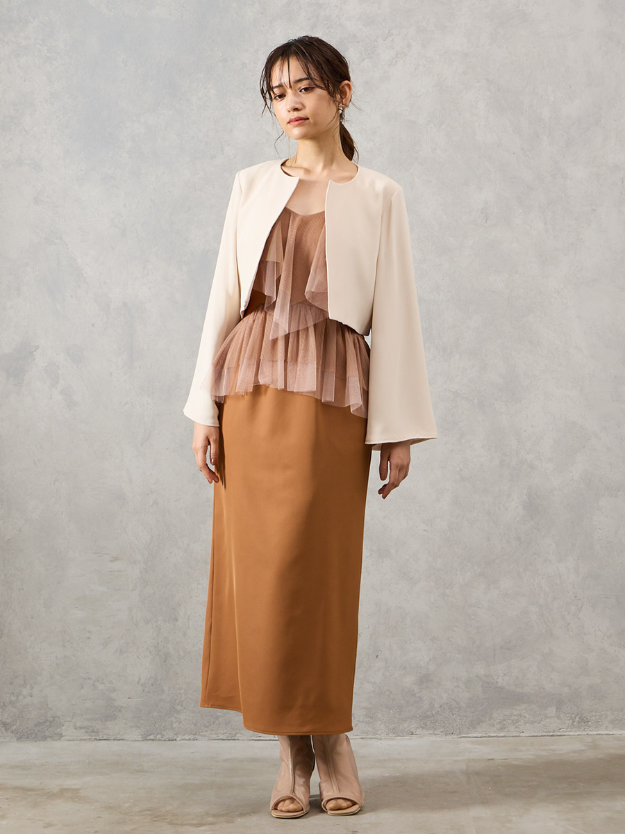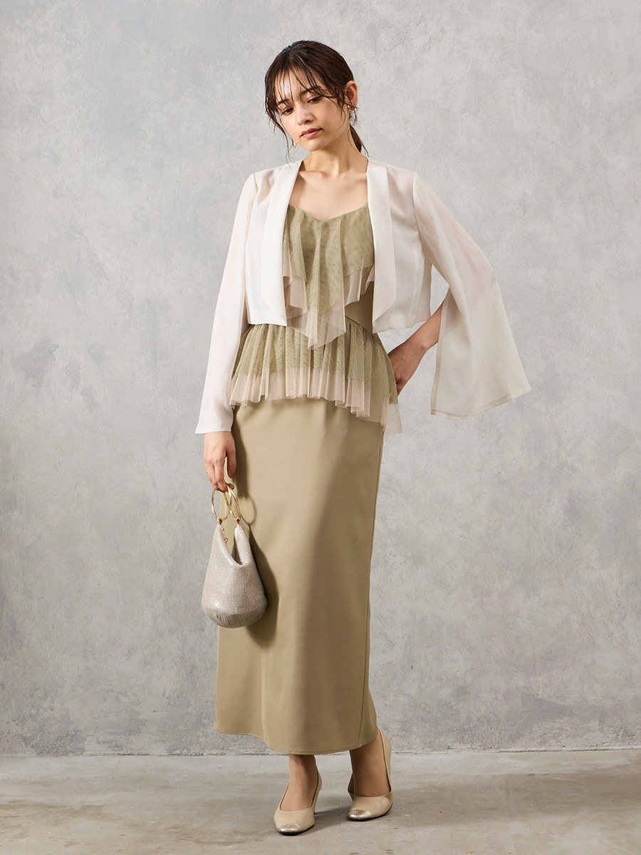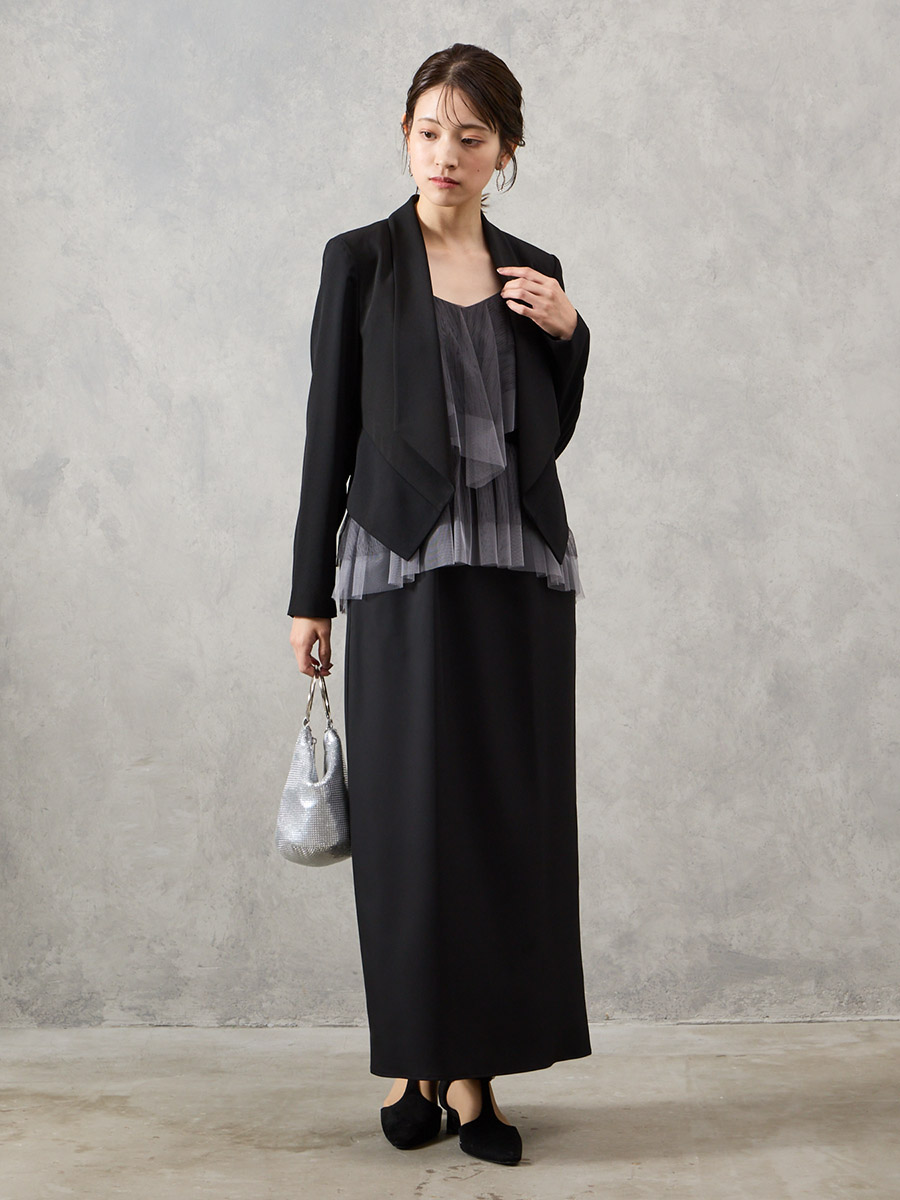 デコルテや袖の透け感が気になる方や、落ち着いた雰囲気で着用したい方はジャケットを羽織るのもおすすめです。