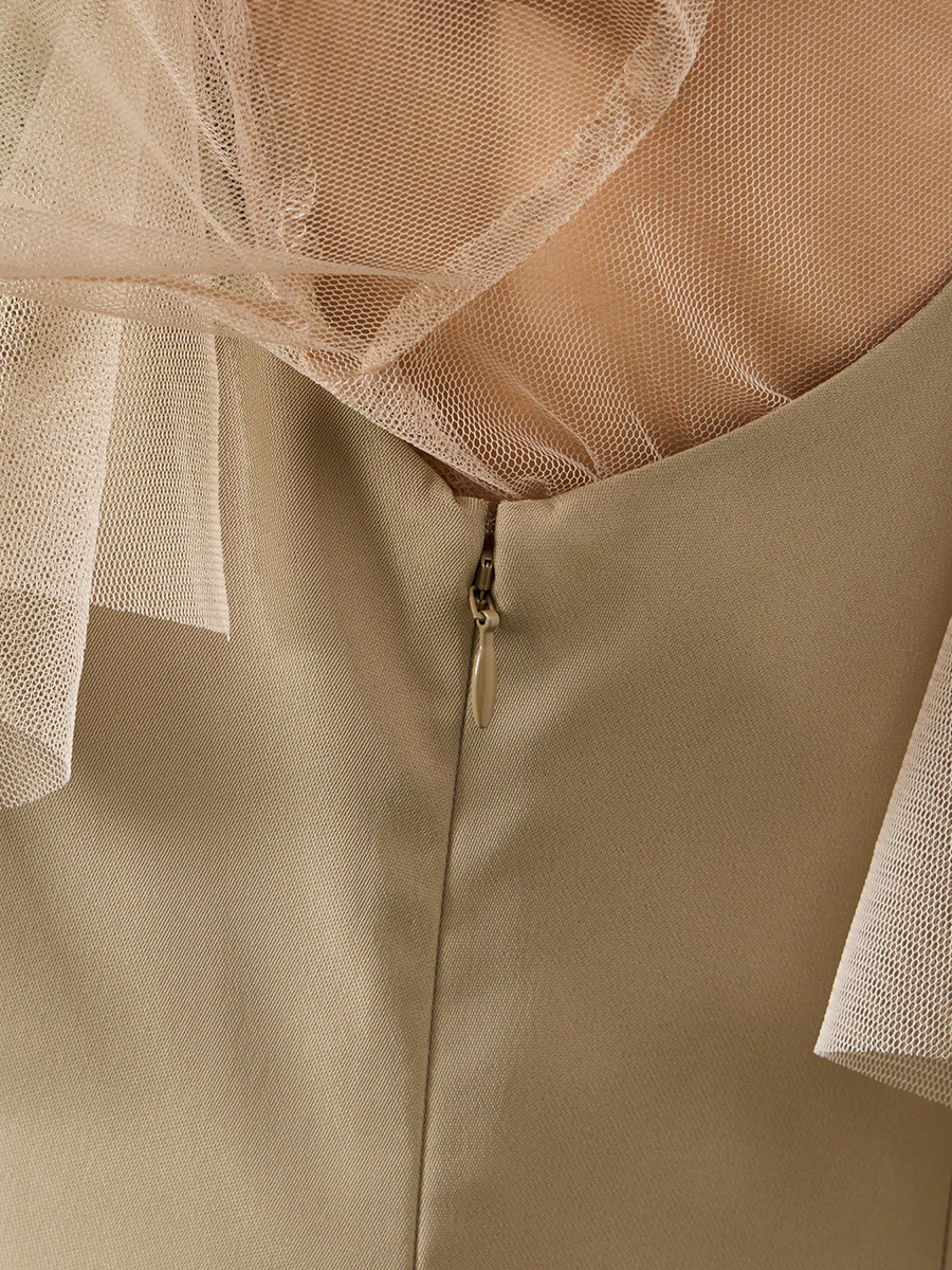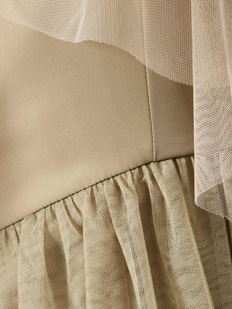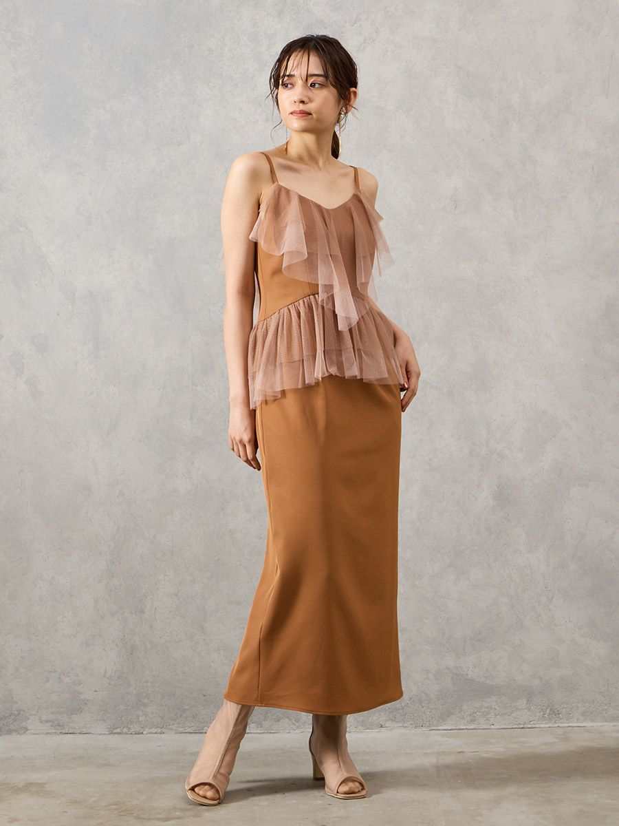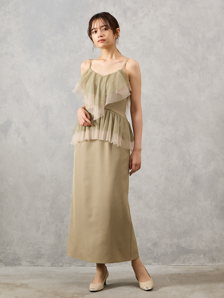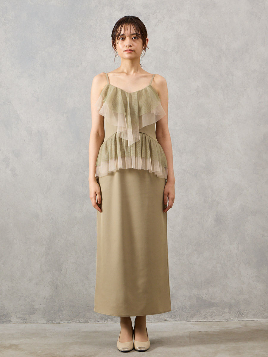ワンピースはサテンと無地チュールを組み合わせたIラインのキャミソールワンピースです。