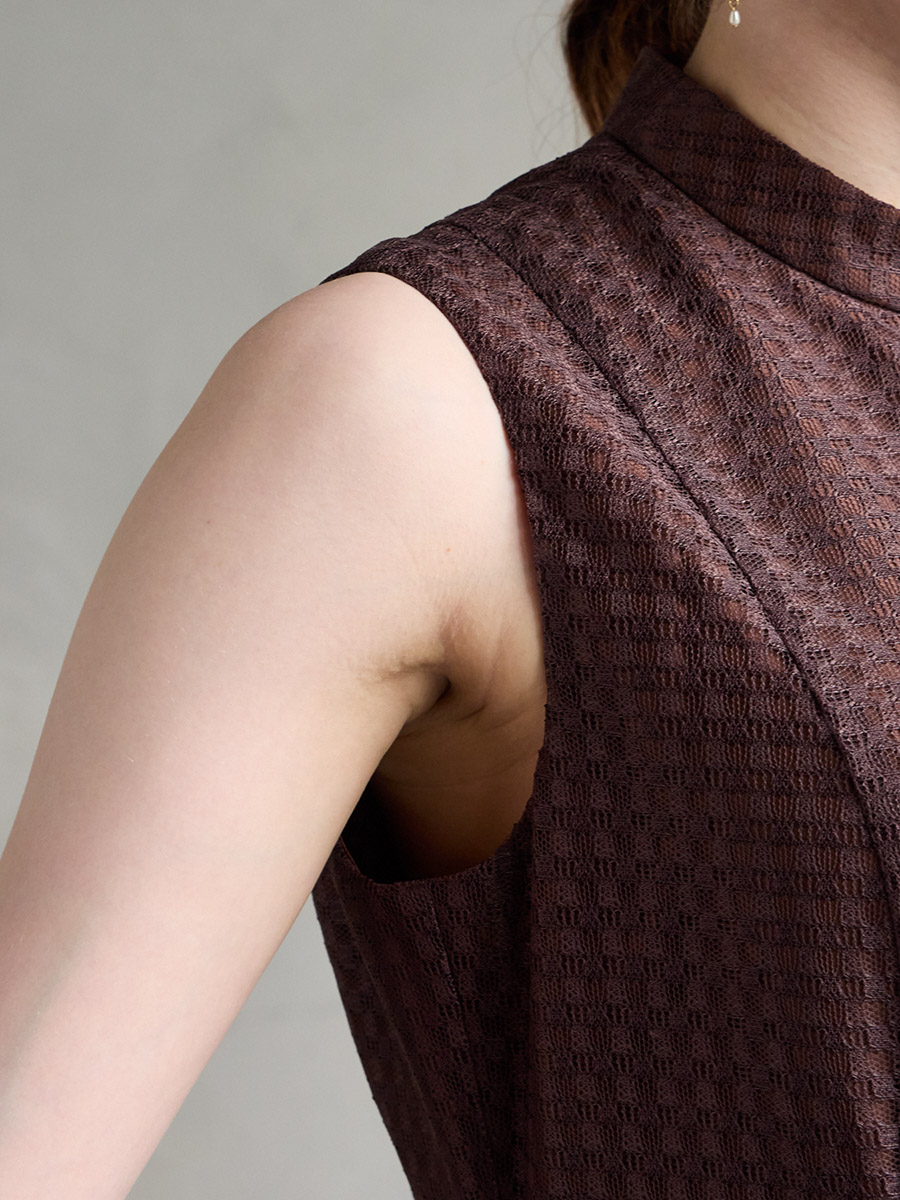 首元はプチハイネックデザインで露出を抑えてくれます。