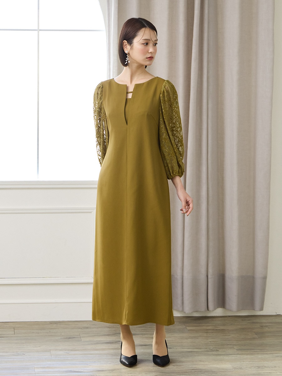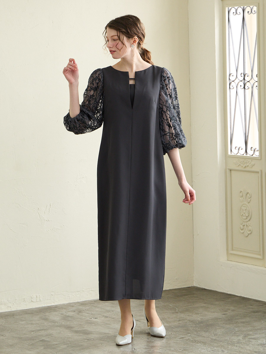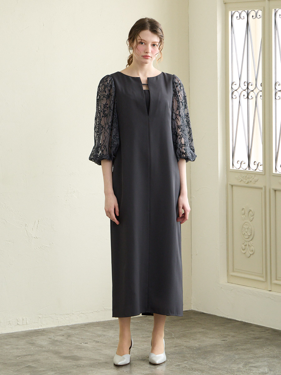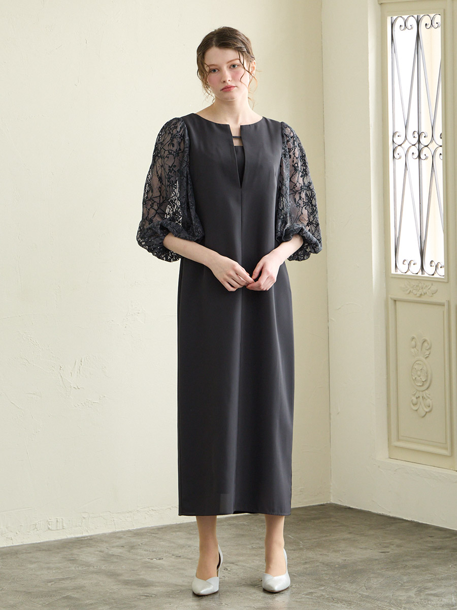 モール刺繍ボリュームスリーブキーネックワンピース