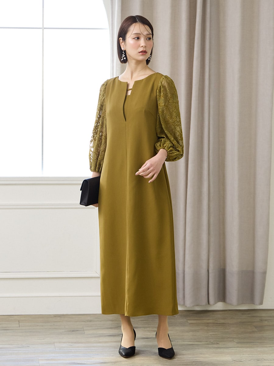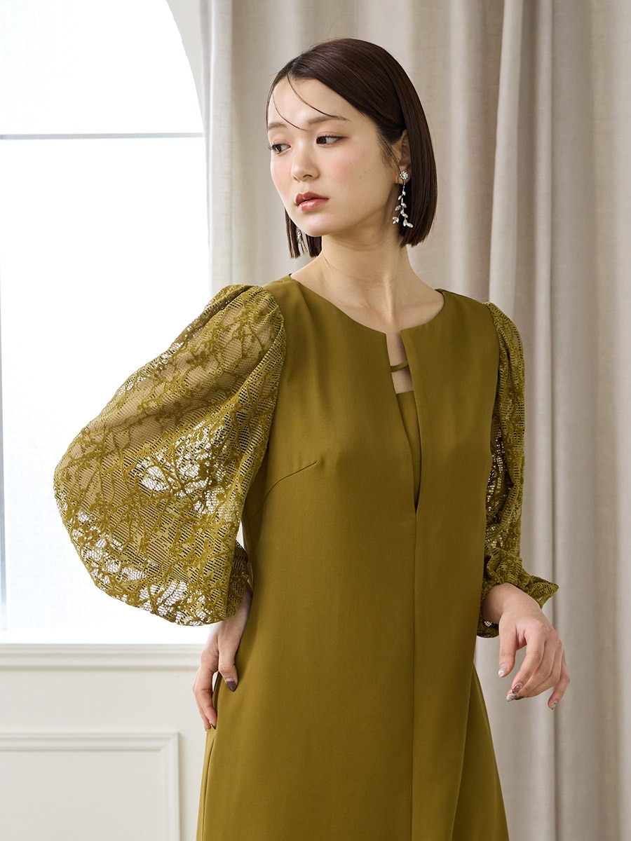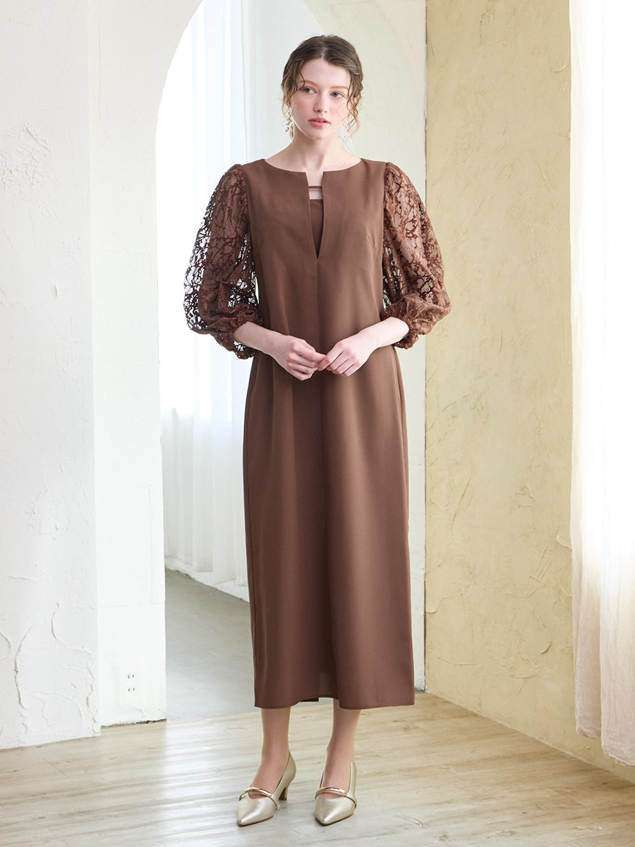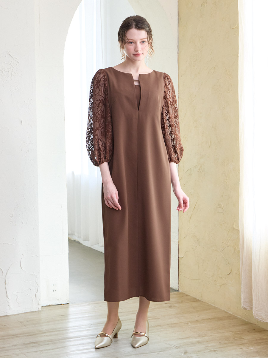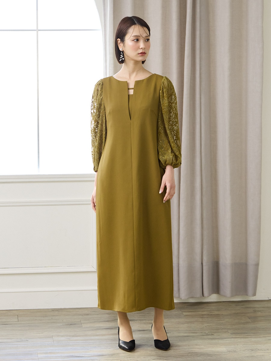 モール刺繍ボリュームスリーブキーネックワンピース