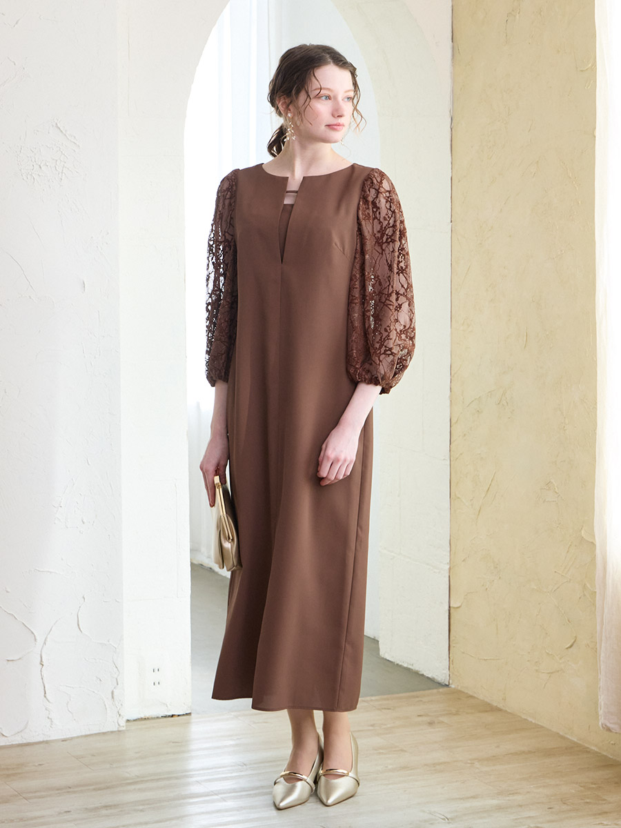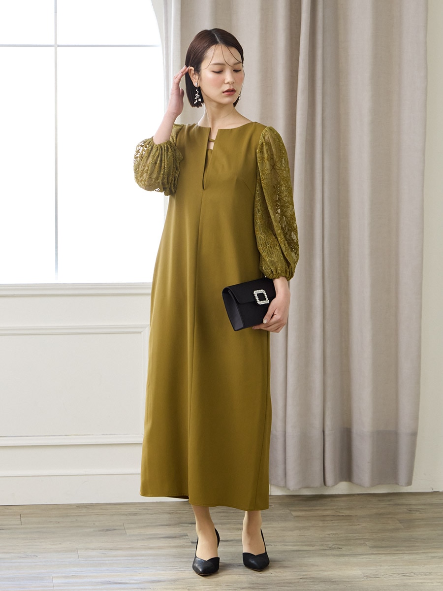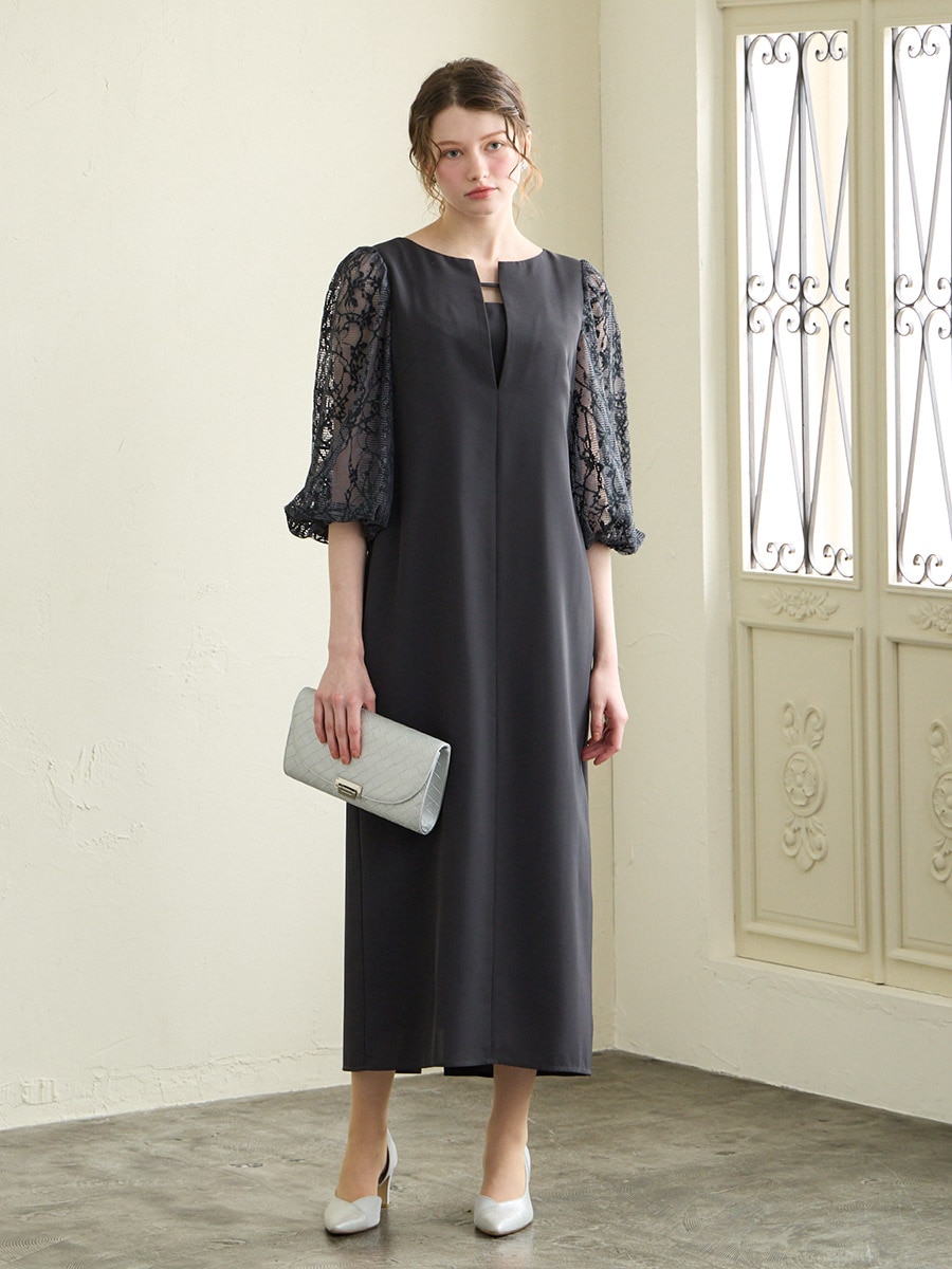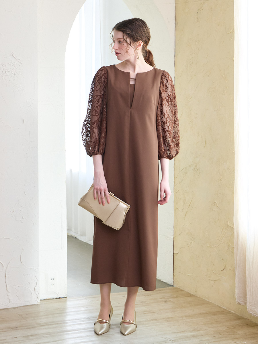 モール刺繍ボリュームスリーブキーネックワンピース