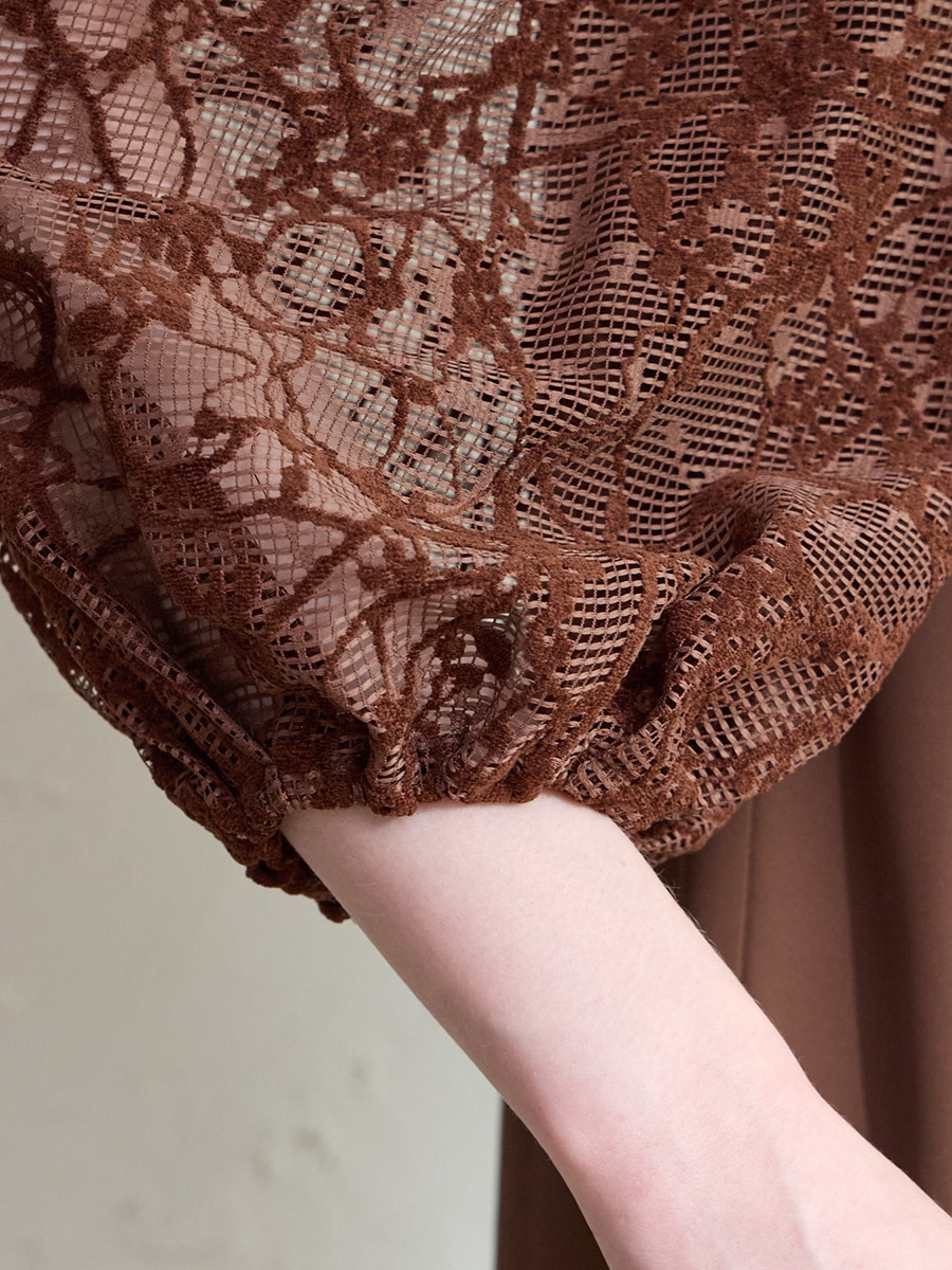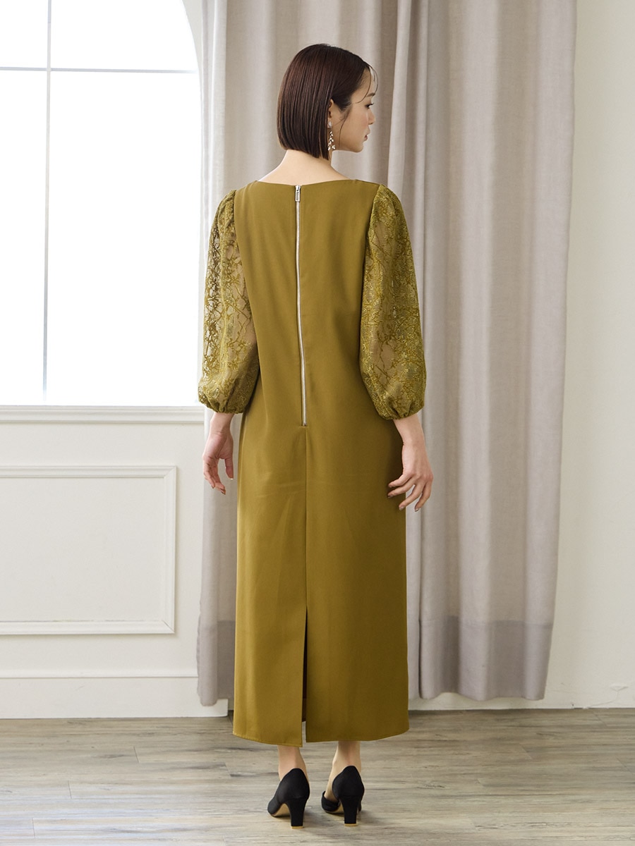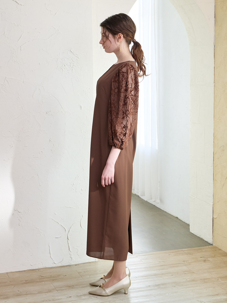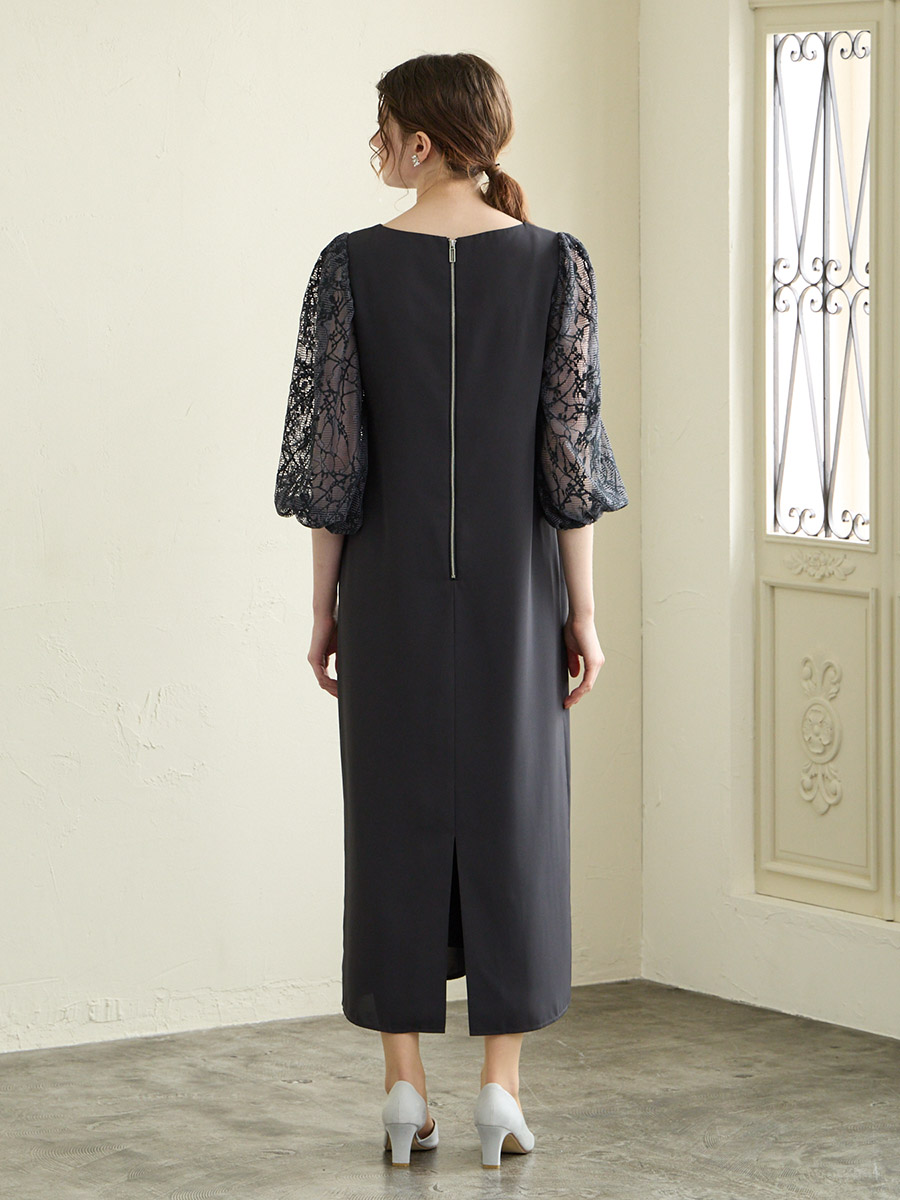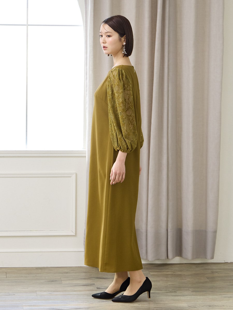 モール刺繍ボリュームスリーブキーネックワンピース