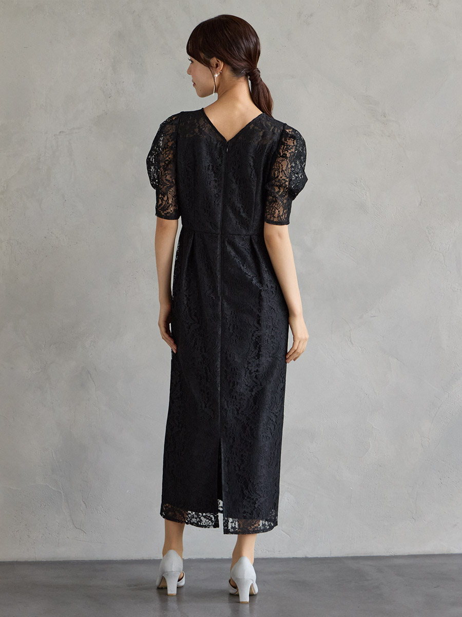 フラワーレースボリュームスリーブタイトドレス