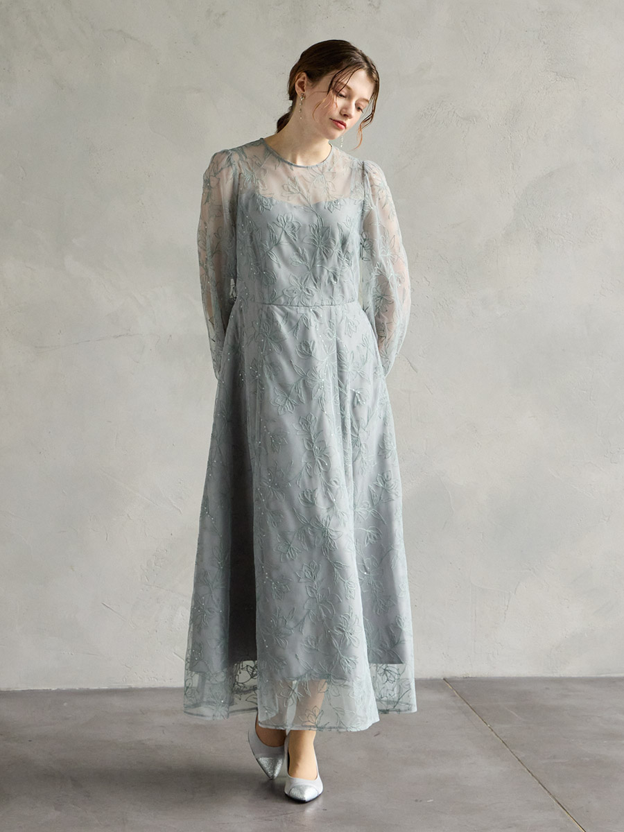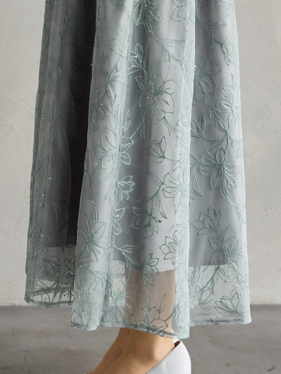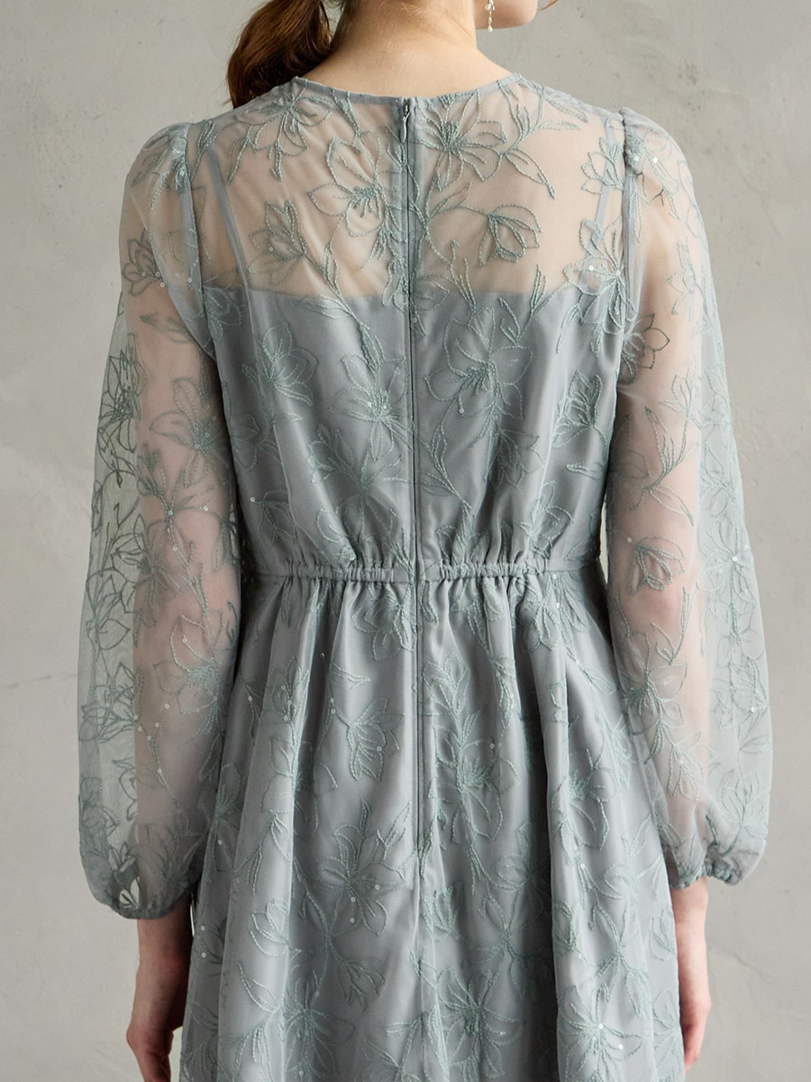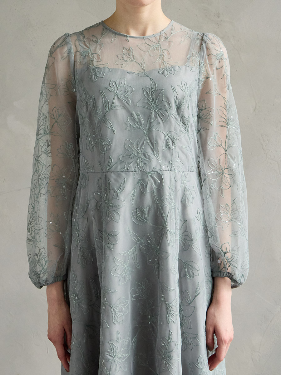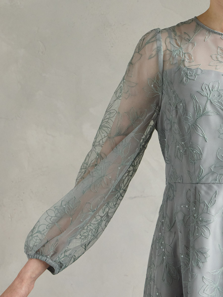 チュールに温かみのあるウーリー糸でフラワーモチーフの刺繍を施し、合間にスパンコールをあしらった生地を全身に使用しています。