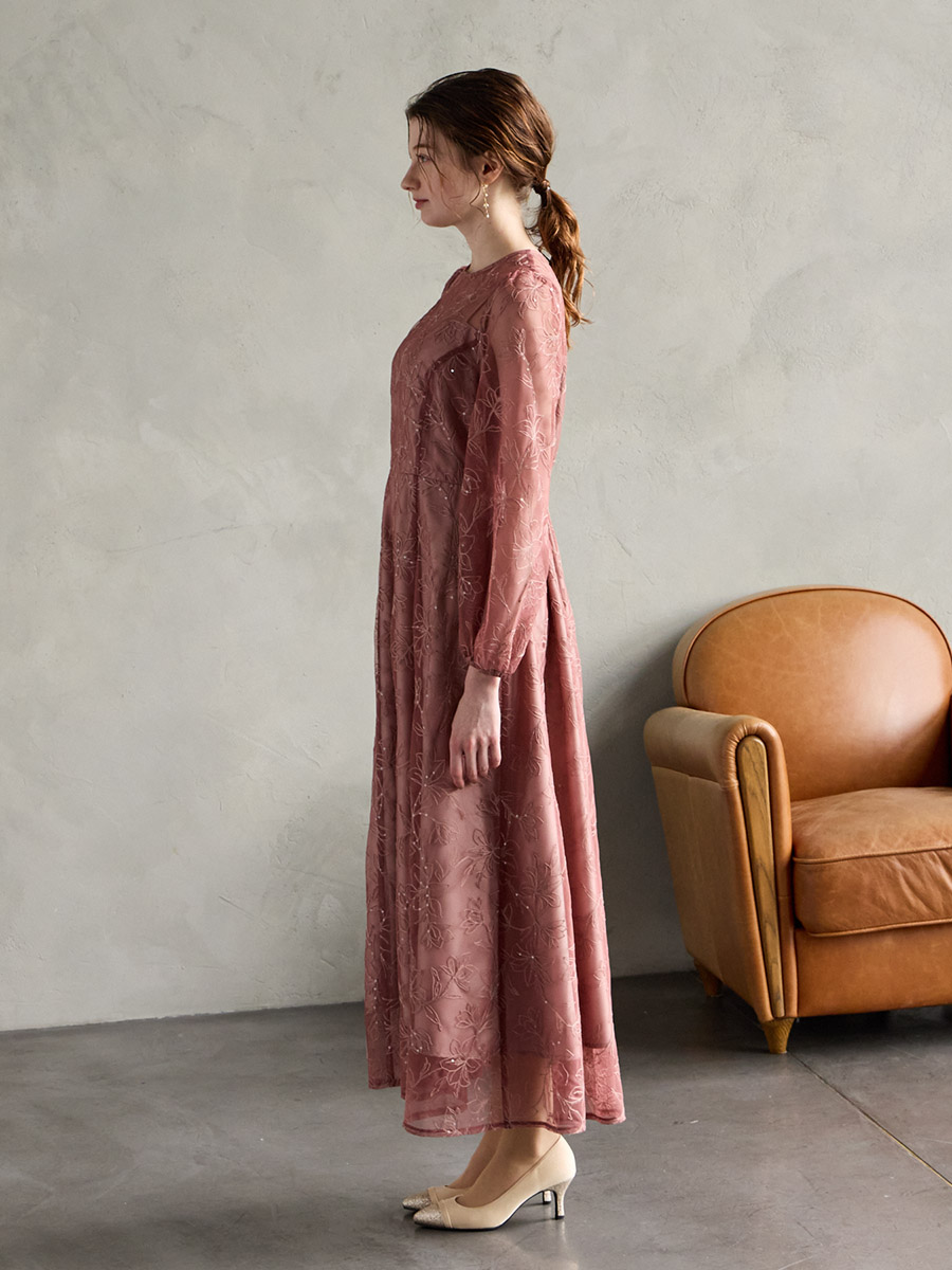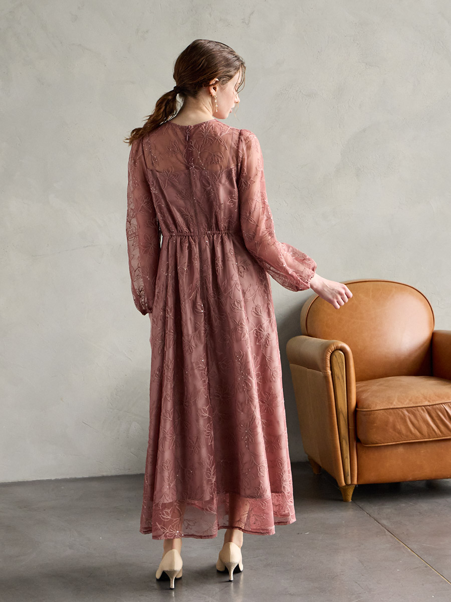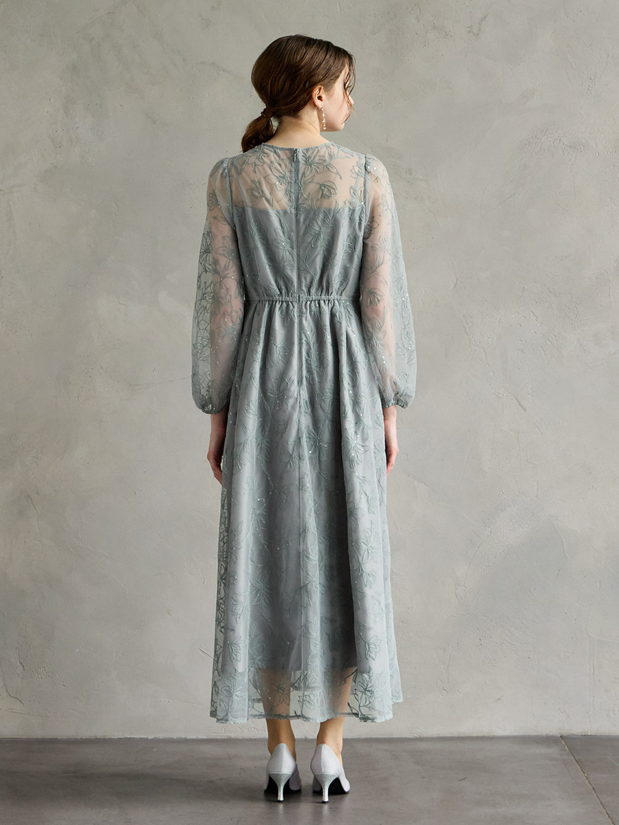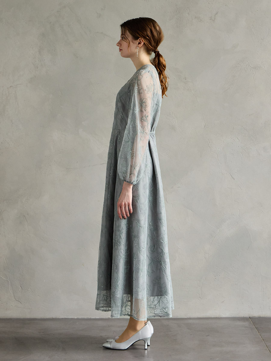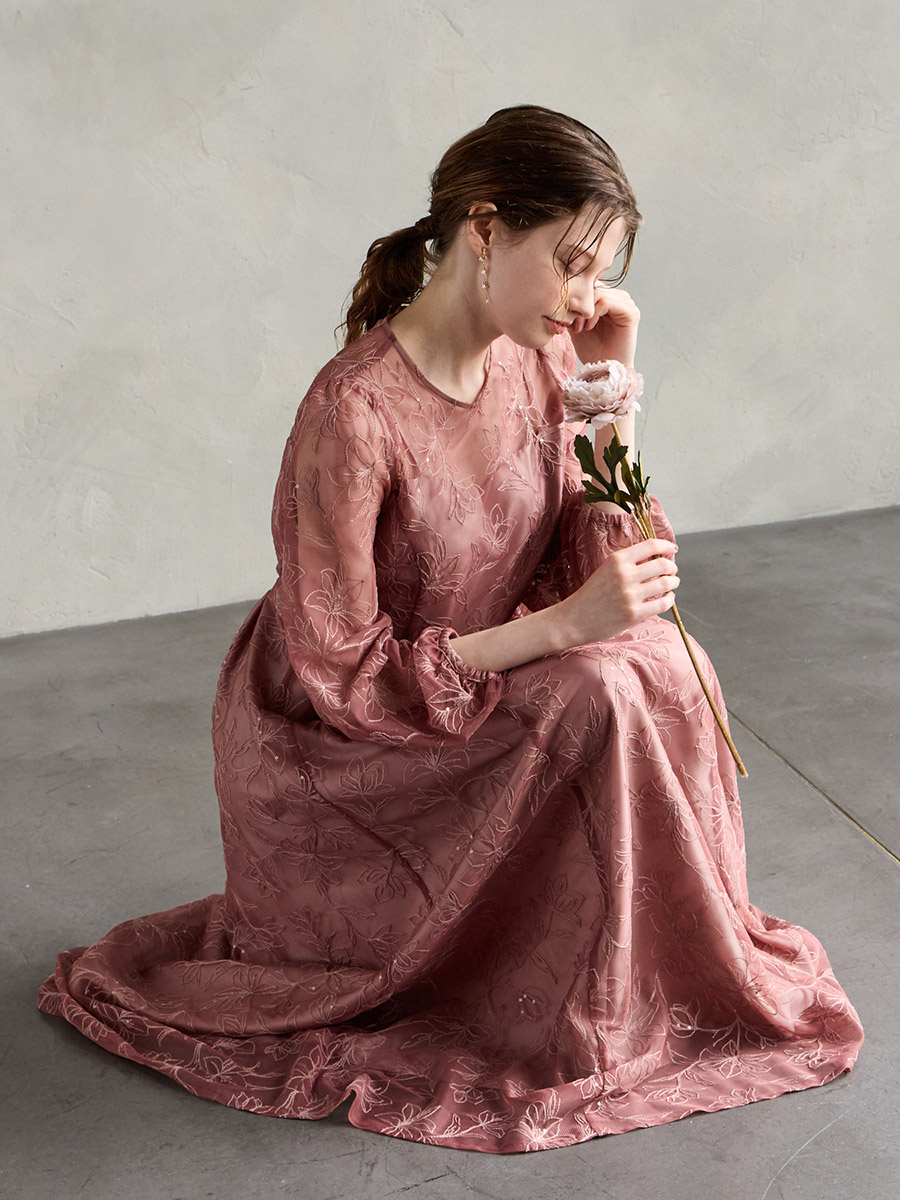 チュールに温かみのあるウーリー糸でフラワーモチーフの刺繍を施し、合間にスパンコールをあしらった生地を全身に使用しています。