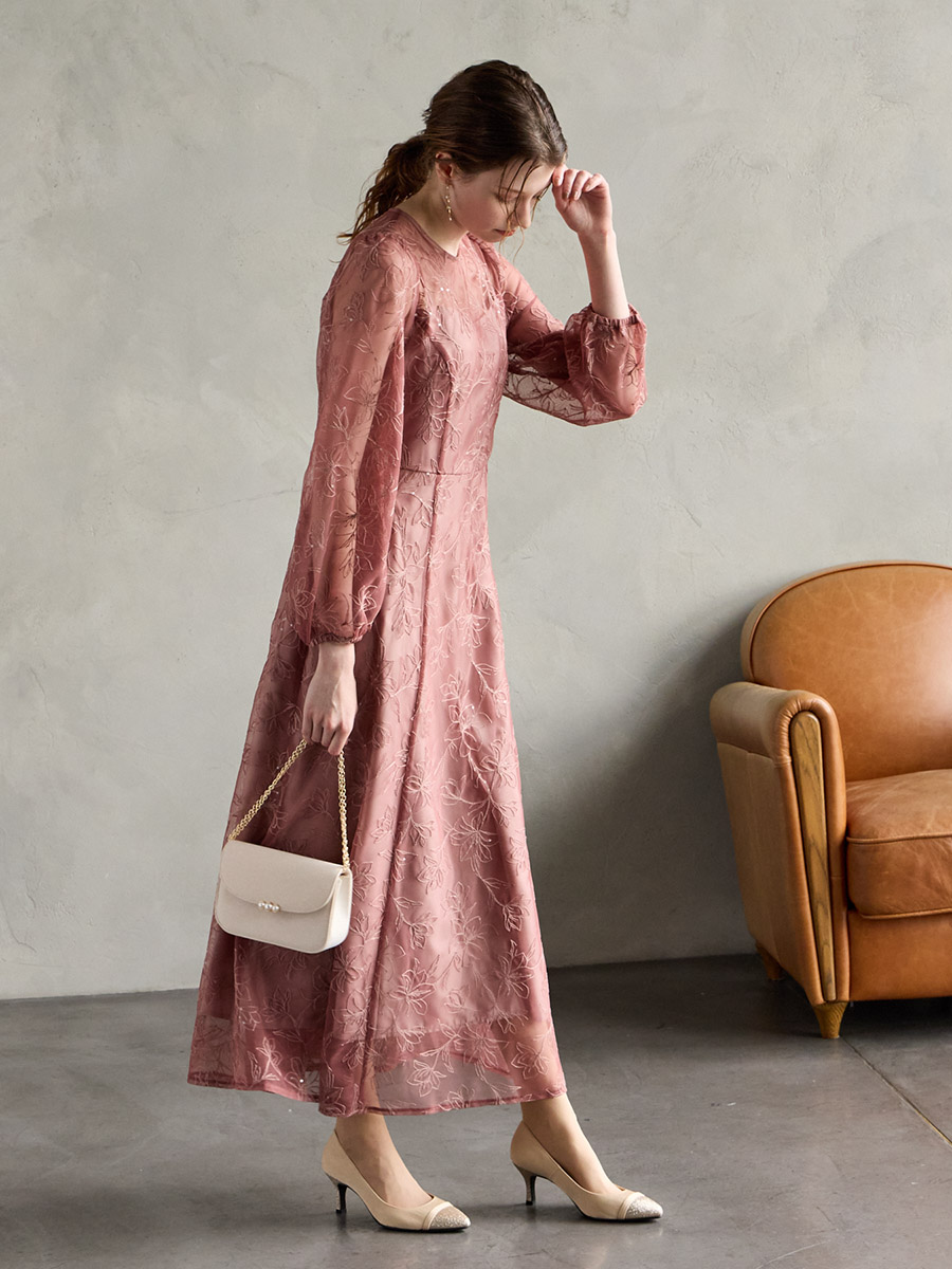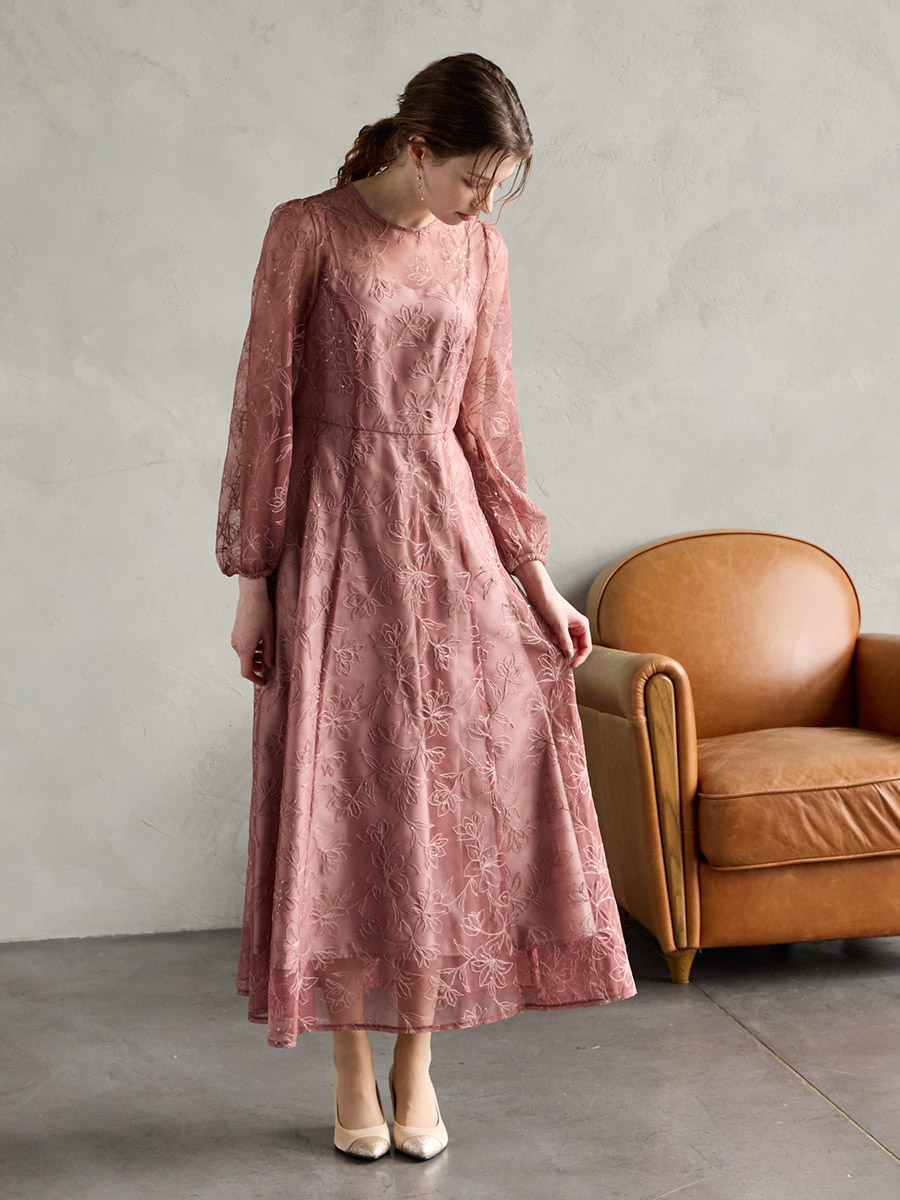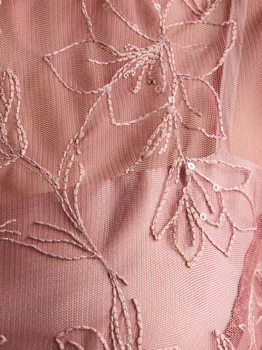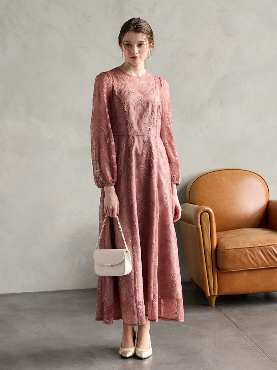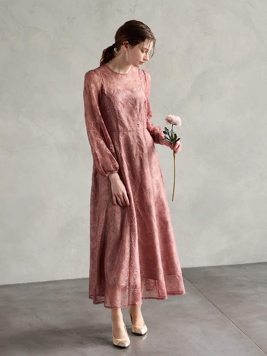 チュールに温かみのあるウーリー糸でフラワーモチーフの刺繍を施し、合間にスパンコールをあしらった生地を全身に使用しています。