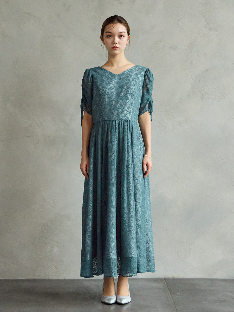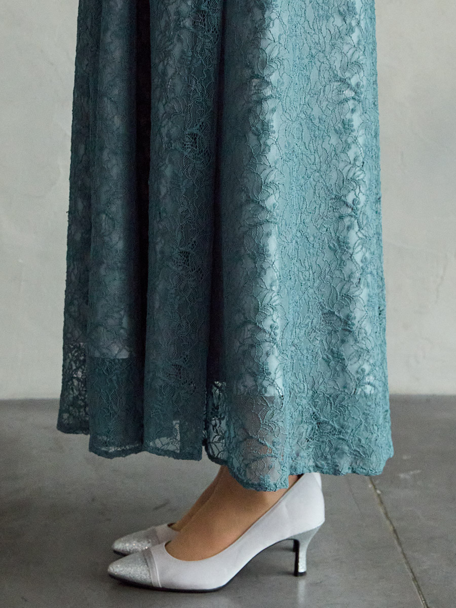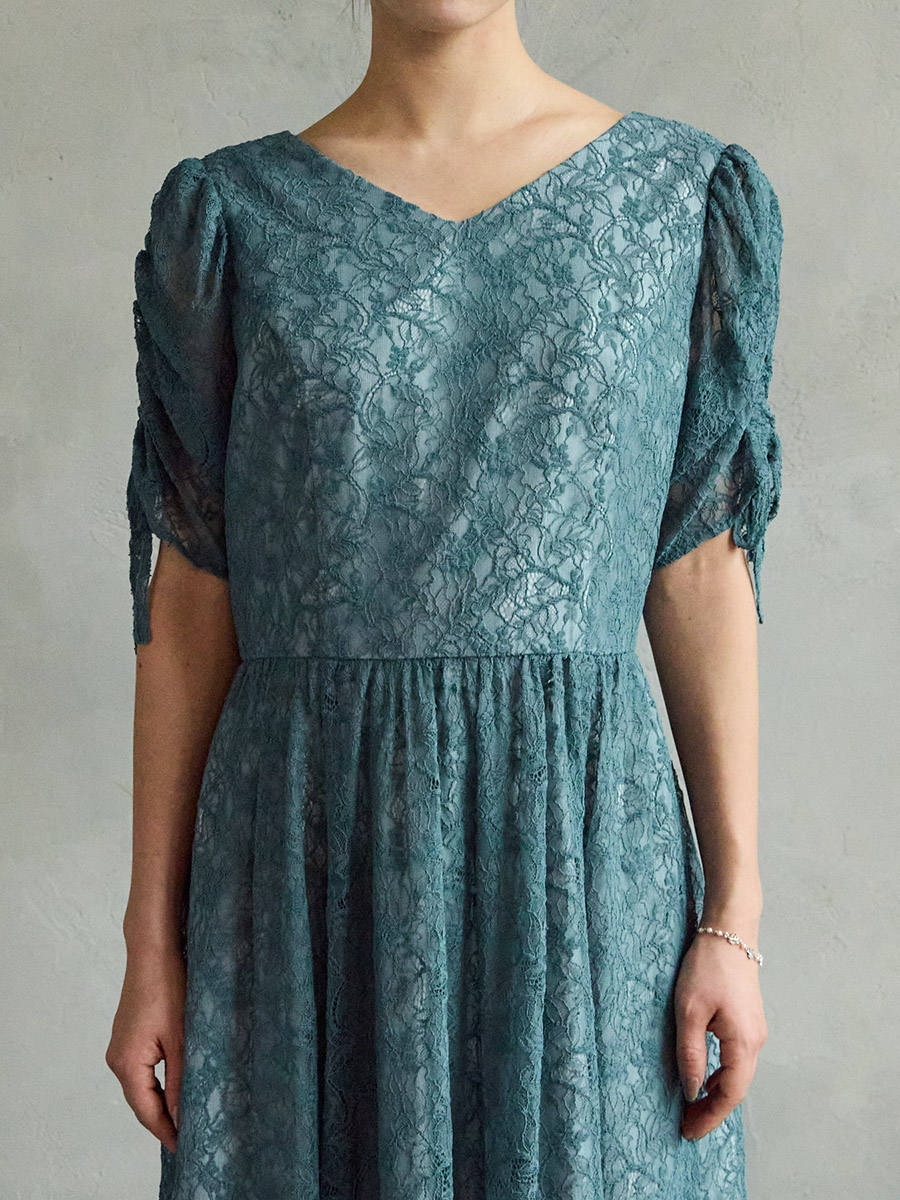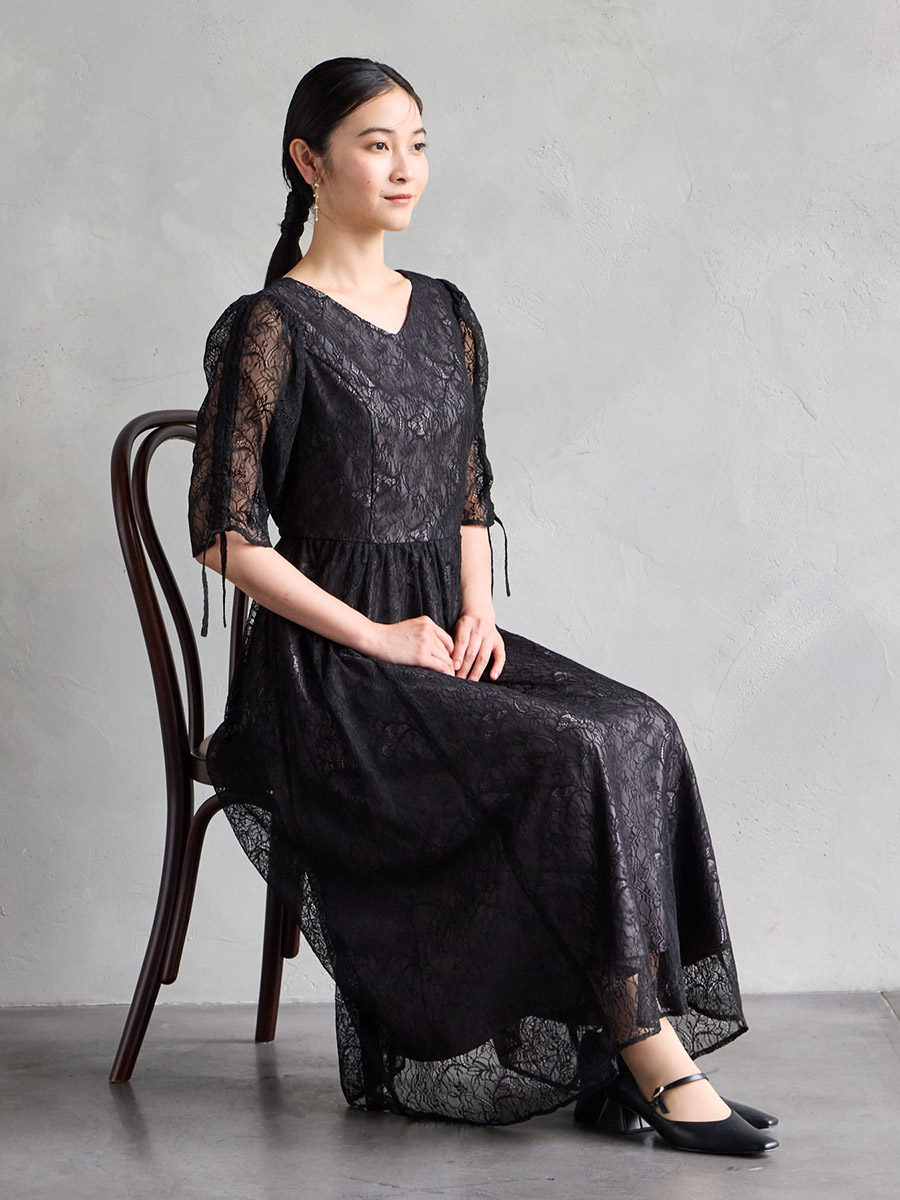 表地には細かなリーフモチーフのコードラッセルレースを使用し、清楚な雰囲気を引き立てます。