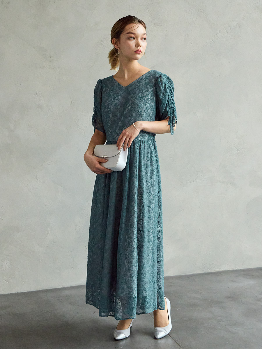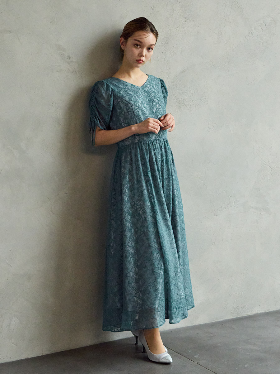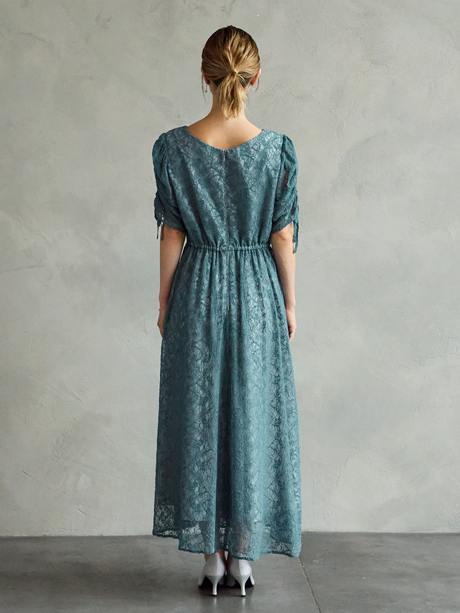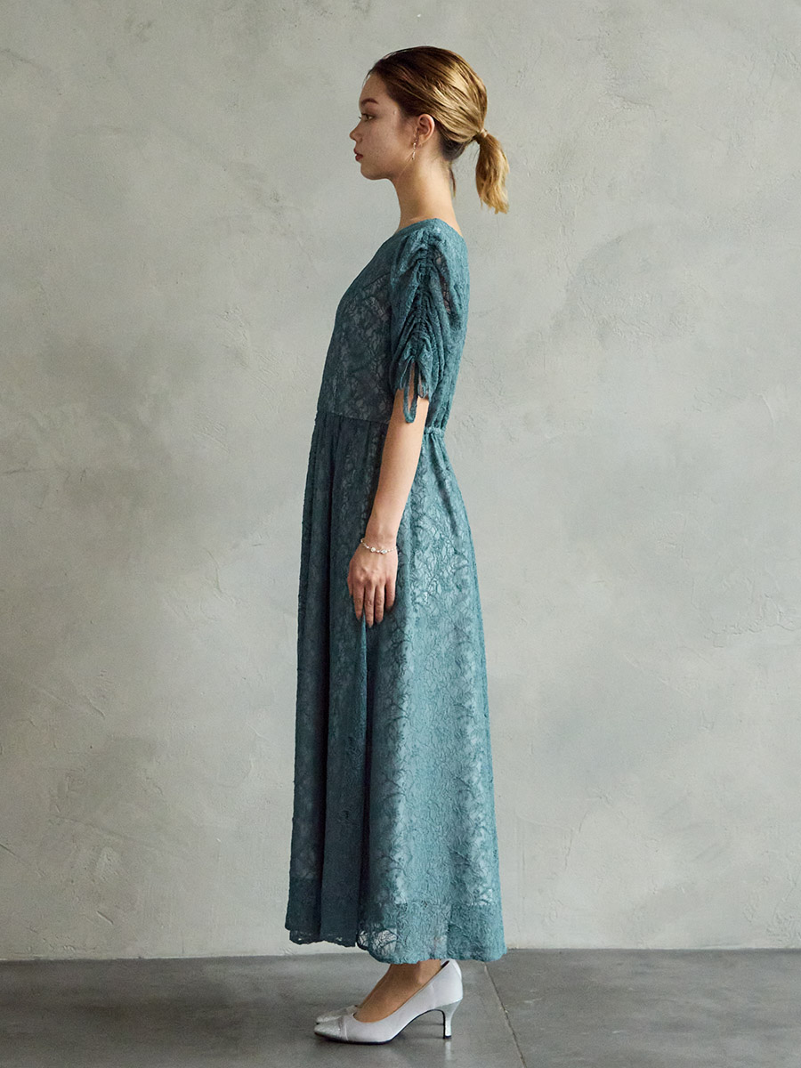 表地には細かなリーフモチーフのコードラッセルレースを使用し、清楚な雰囲気を引き立てます。