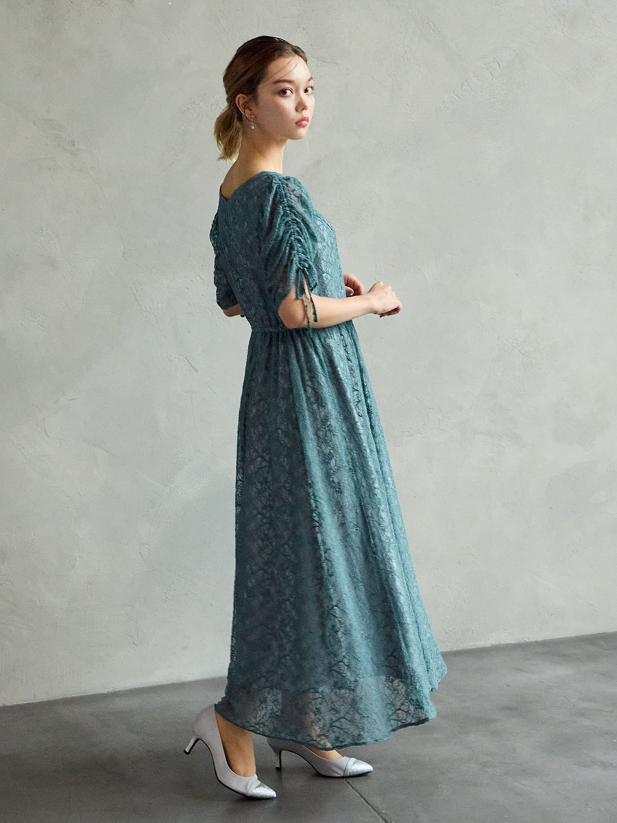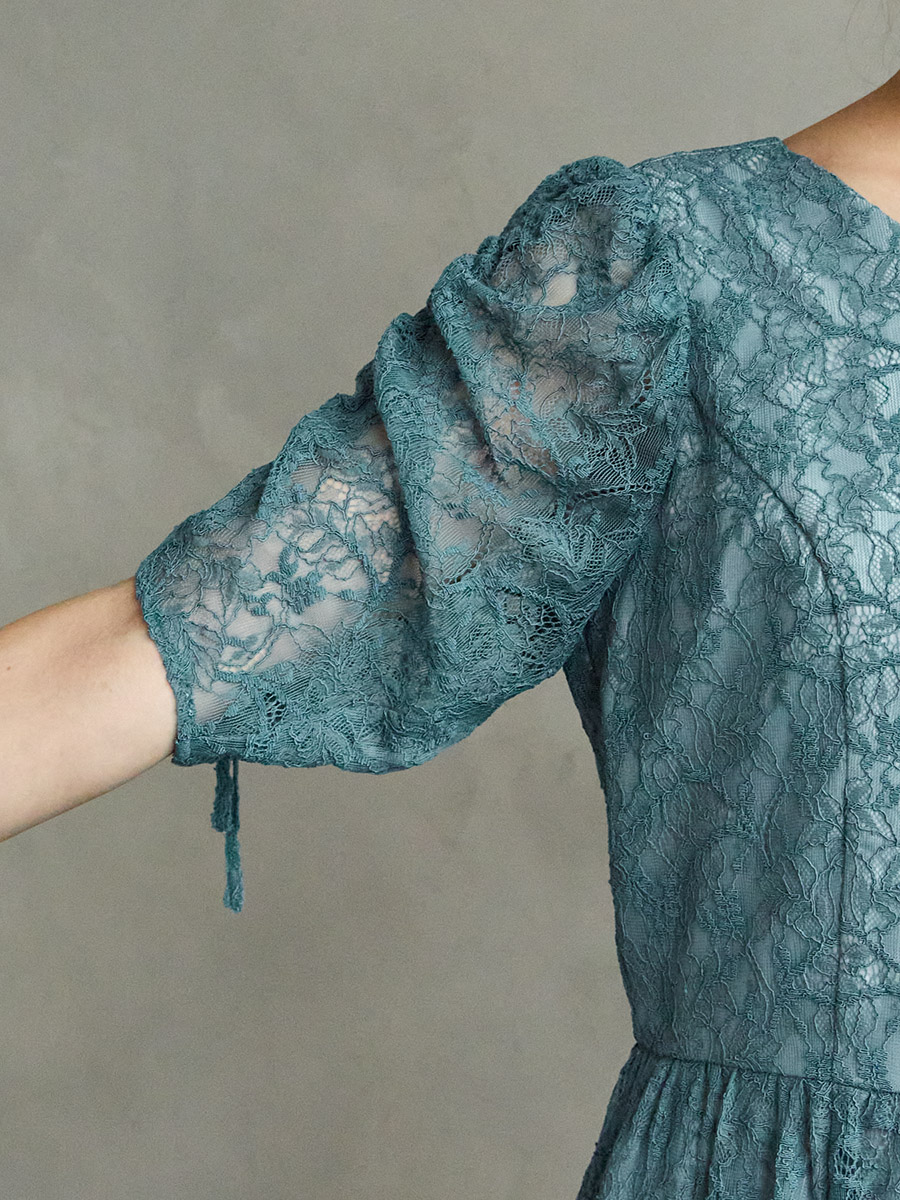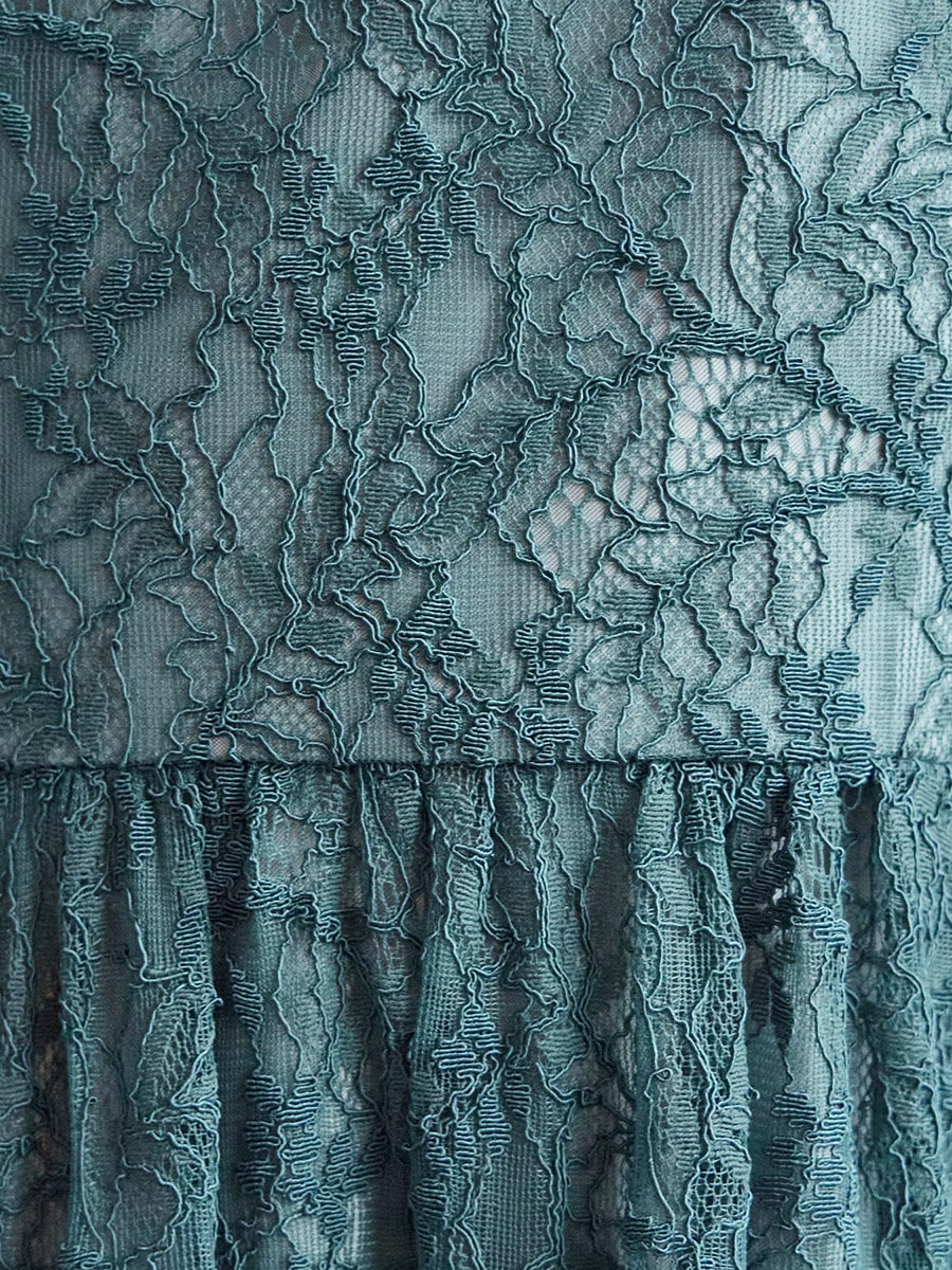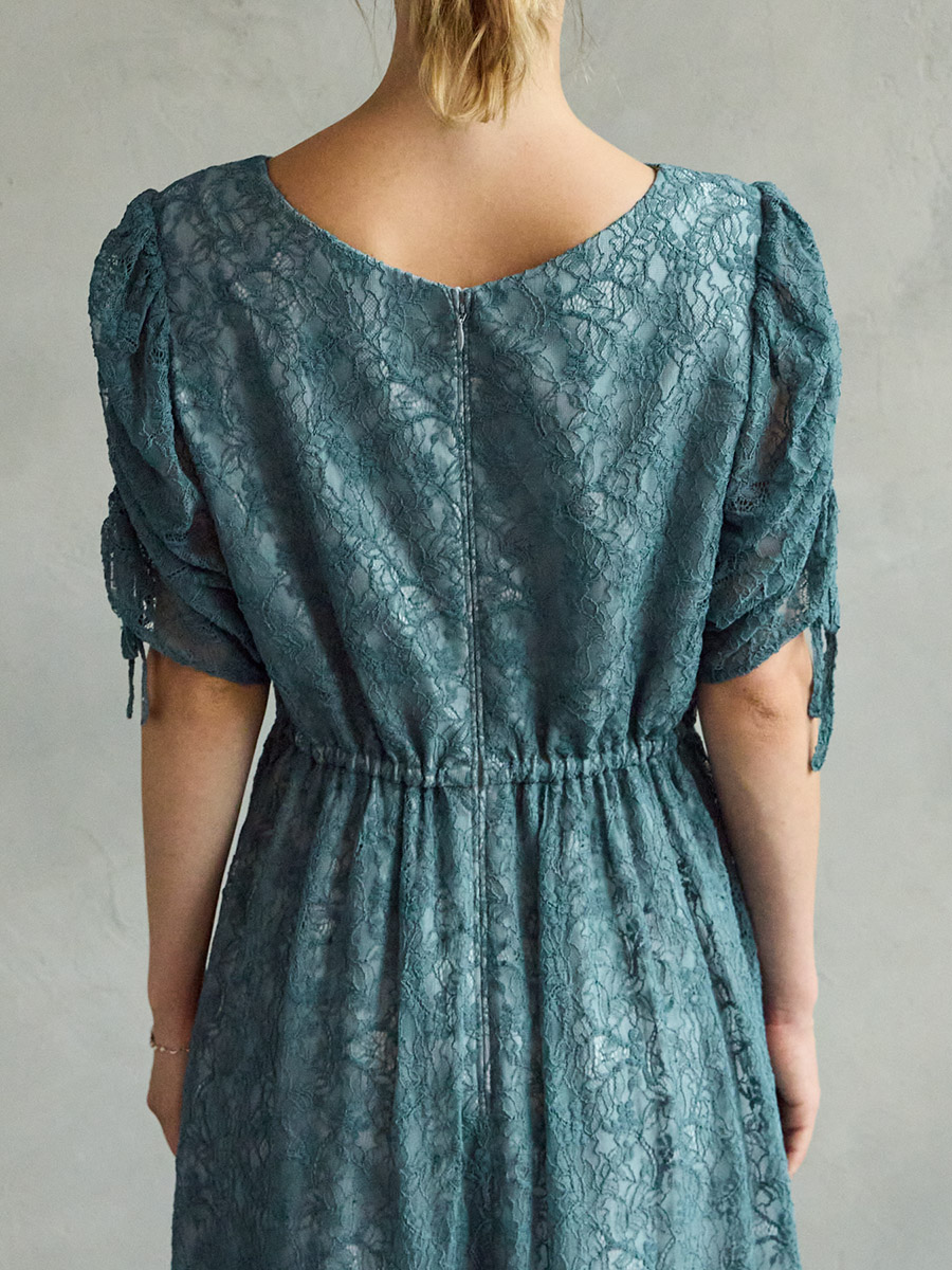 表地には細かなリーフモチーフのコードラッセルレースを使用し、清楚な雰囲気を引き立てます。