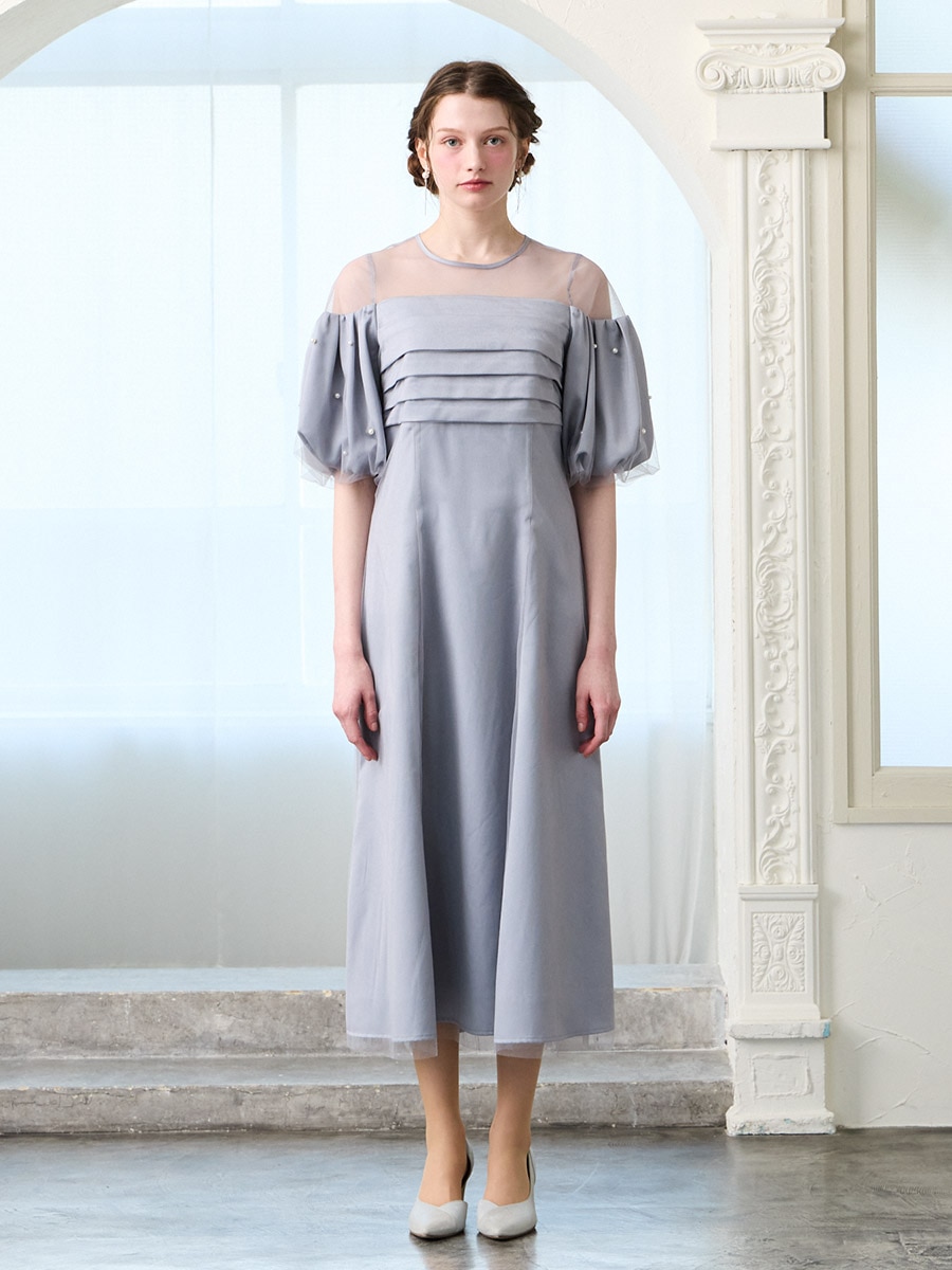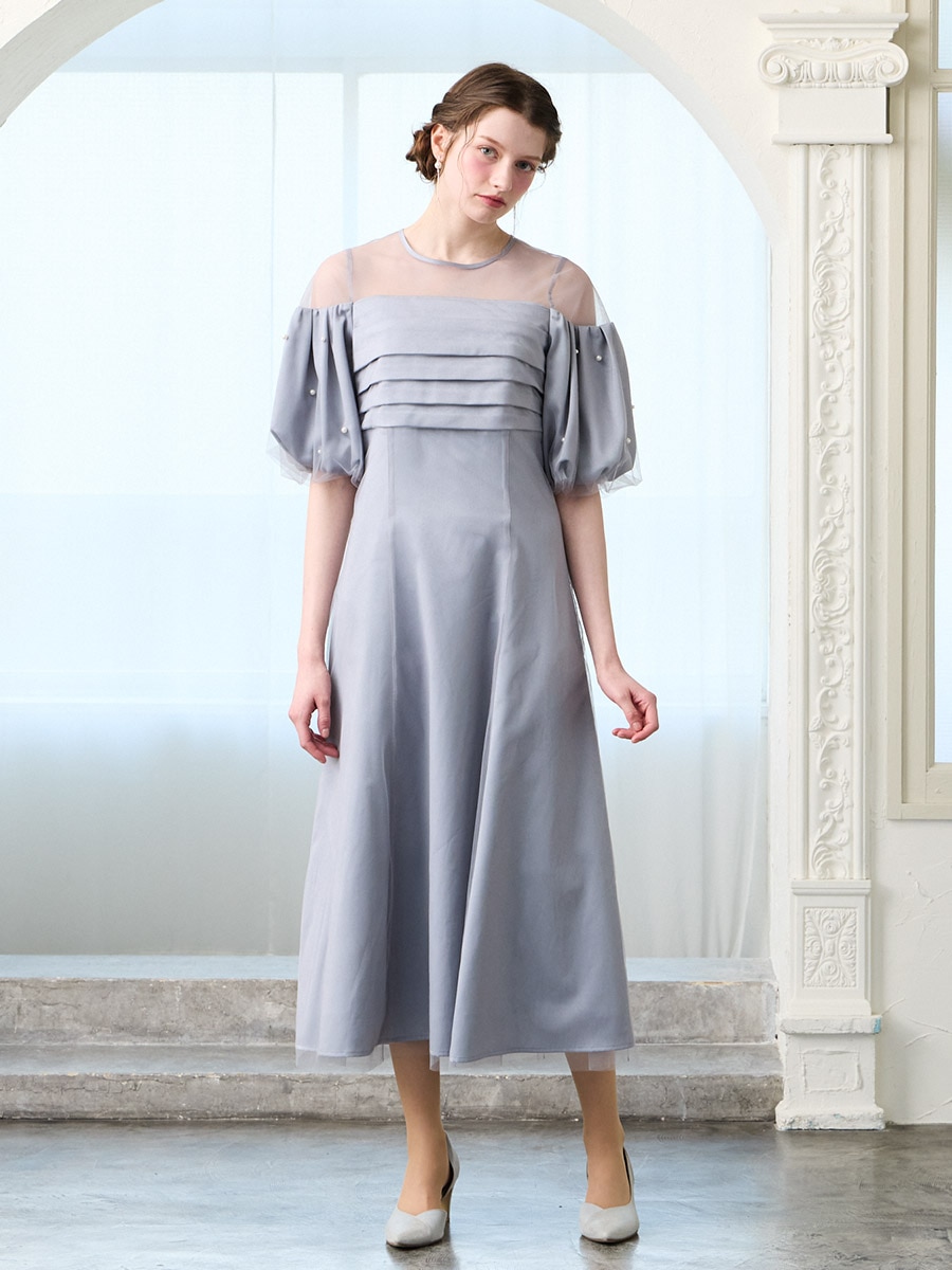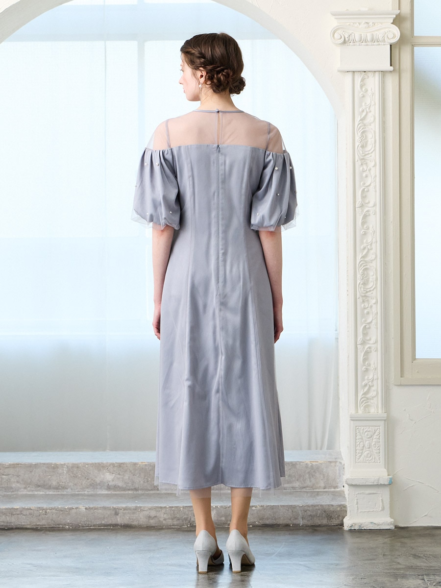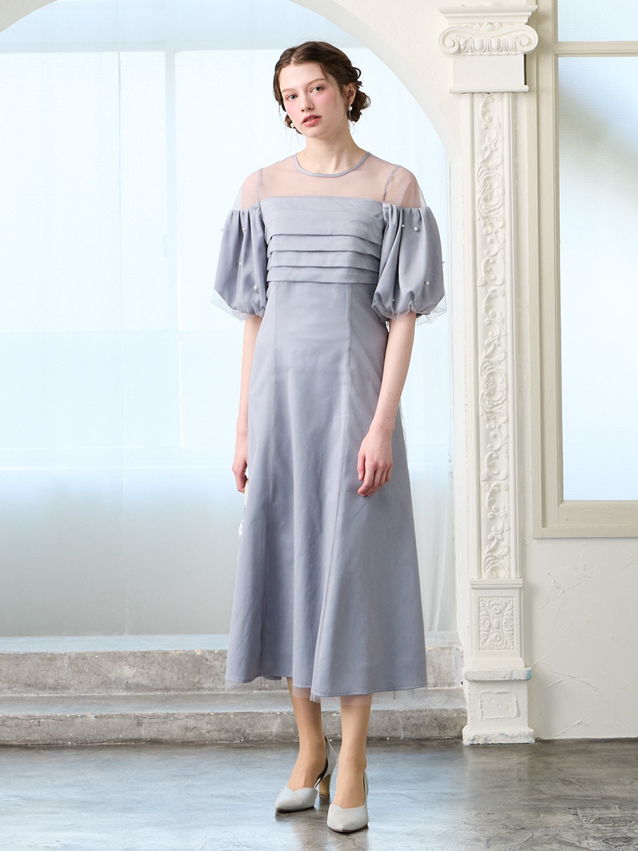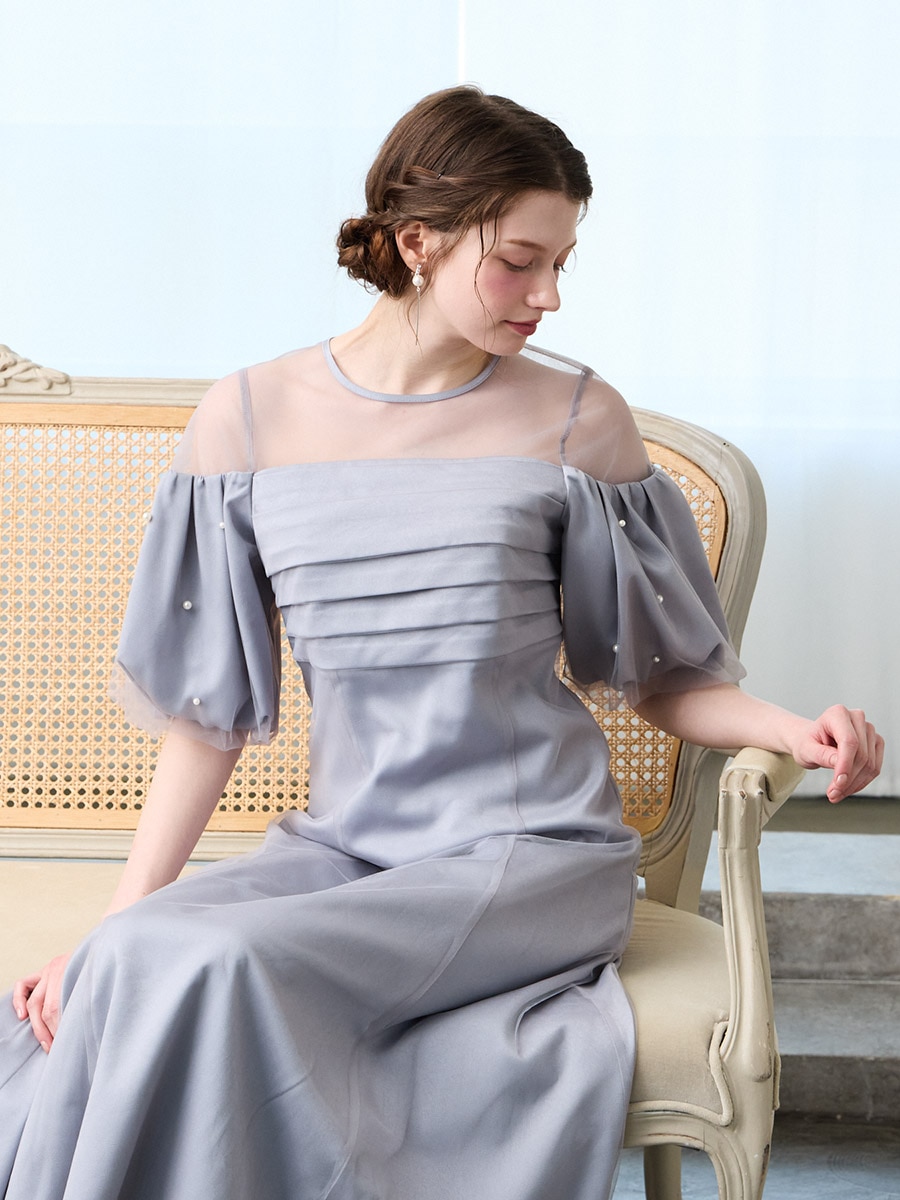 チュール×ヴィンテージサテンパールパフスリーブドレス