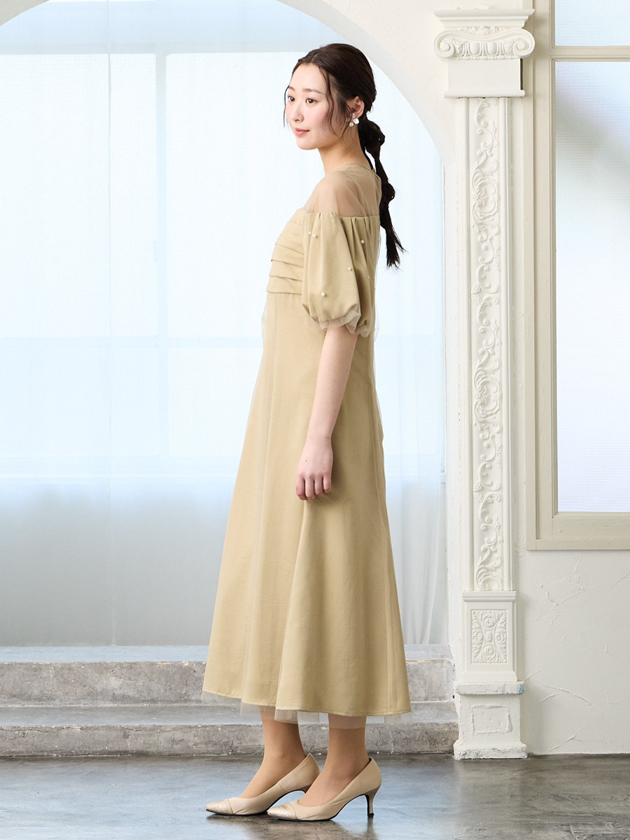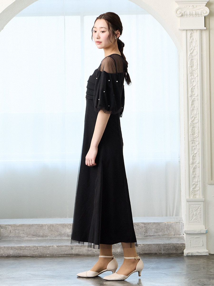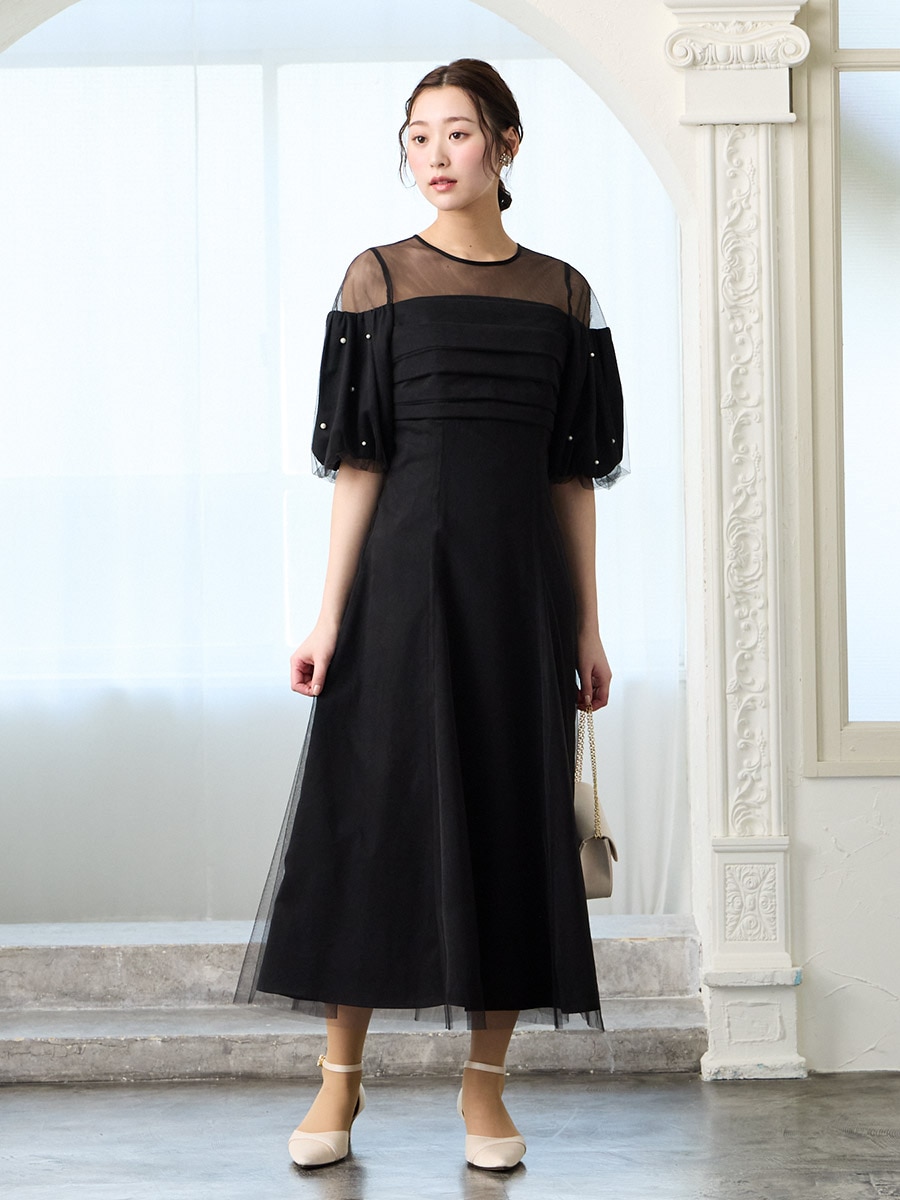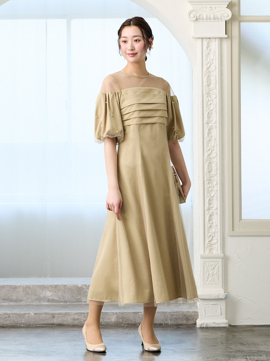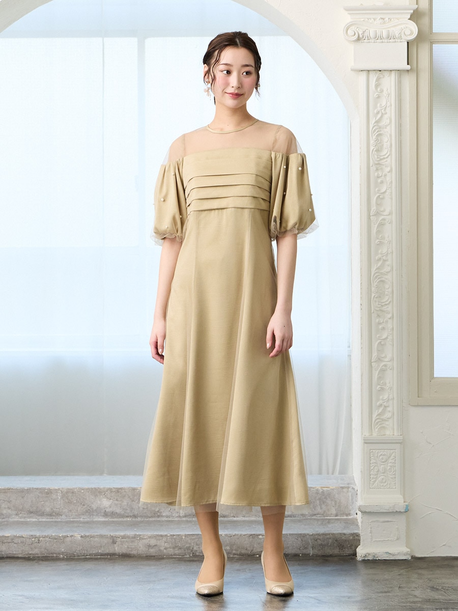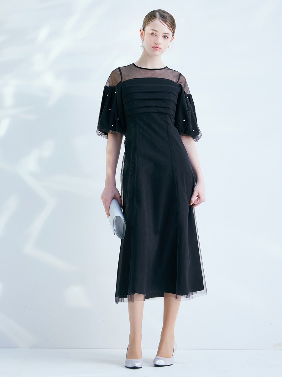 チュール×ヴィンテージサテンパールパフスリーブドレス